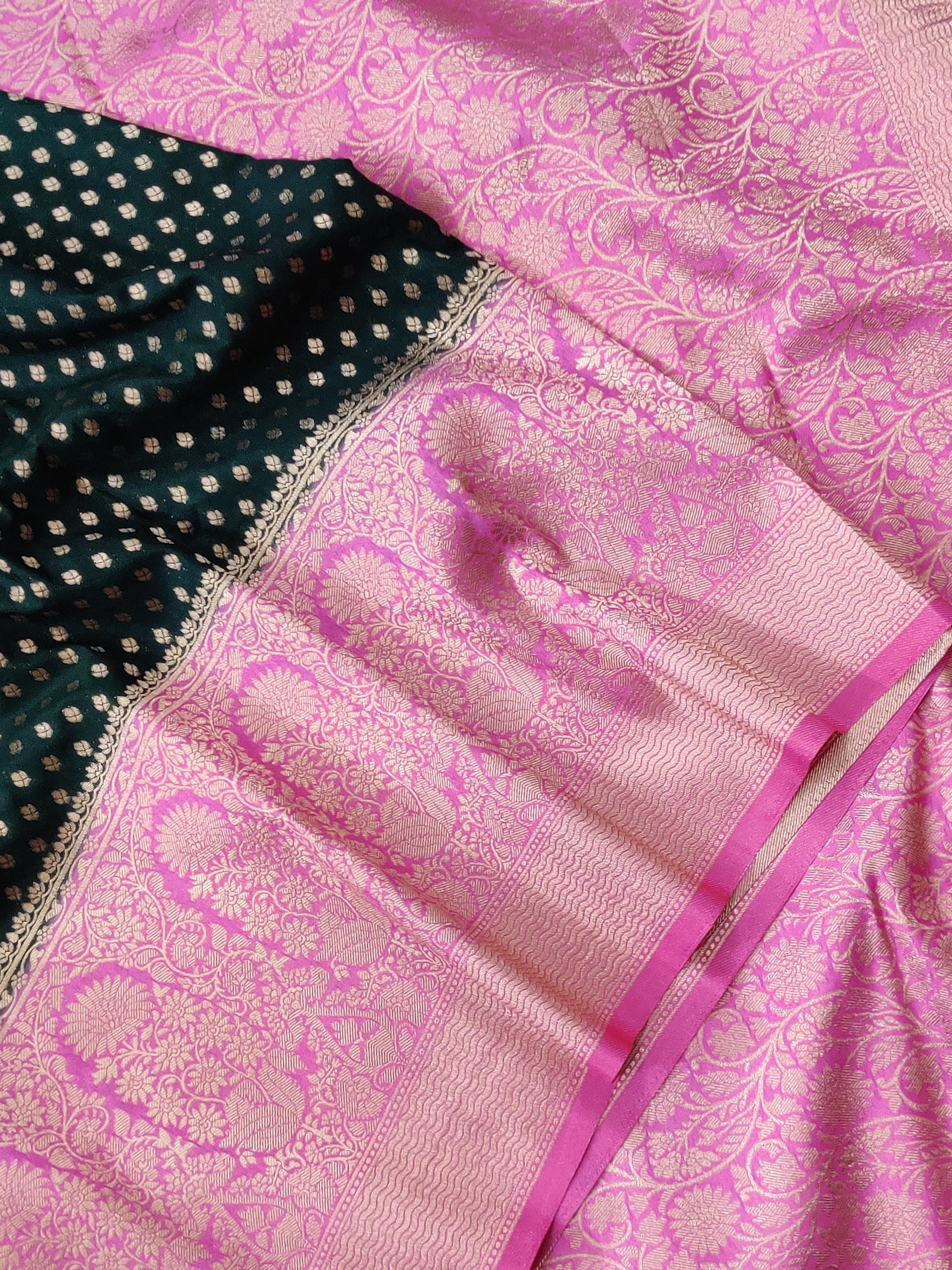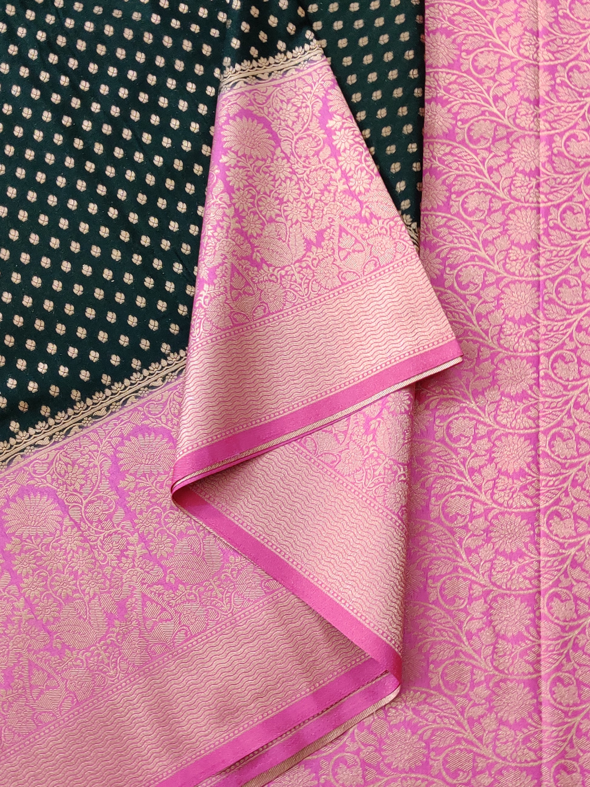 Elevate your ethnic wardrobe with this stunning green semi-Banarasi saree, a masterpiece of traditional craftsmanship. The fabric showcases intricate zari buttas scattered throughout, creating an elegant all-over pattern that catches light beautifully. The saree is finished with a striking contrast pink zari border and matching zari pallu that adds a sophisticated pop of color. Paired with a plain butta blouse, this ensemble offers versatility for both festive occasions and celebrations. The semi-Banarasi weave ensures durability while maintaining the luxurious appeal of authentic silk sarees, making it an investment piece for your collection.