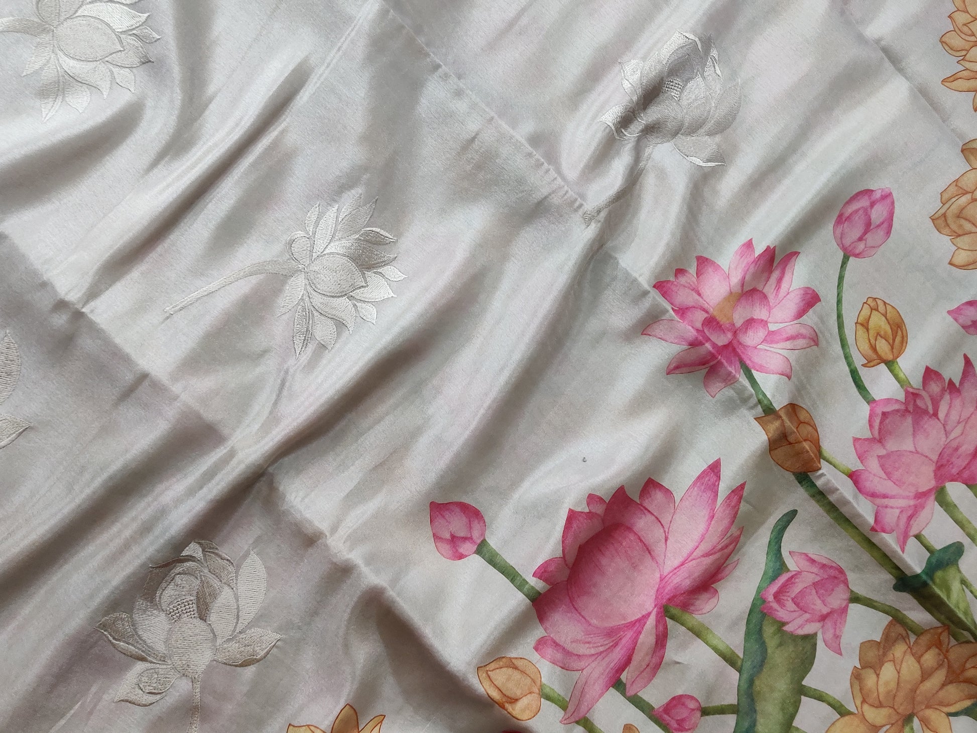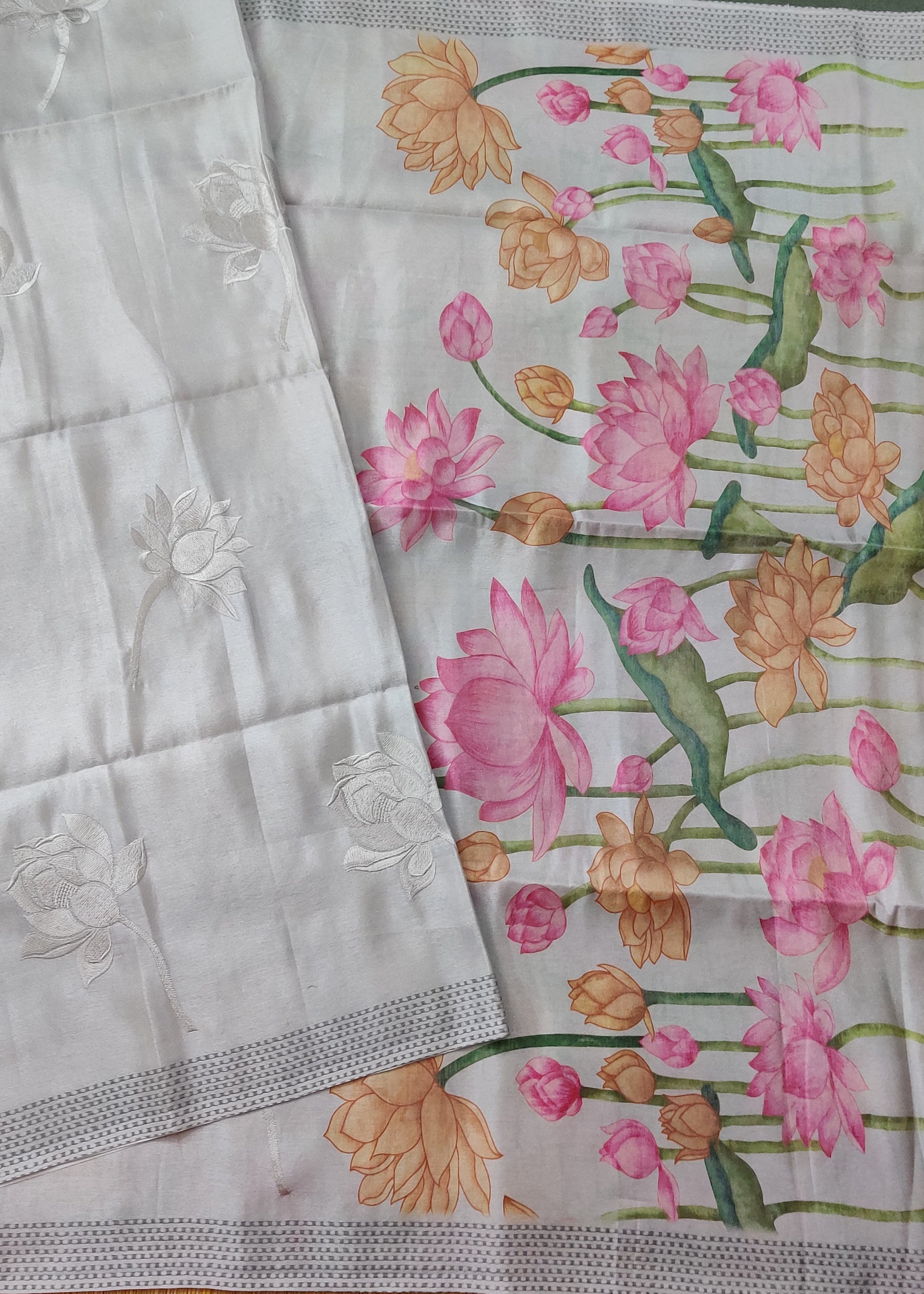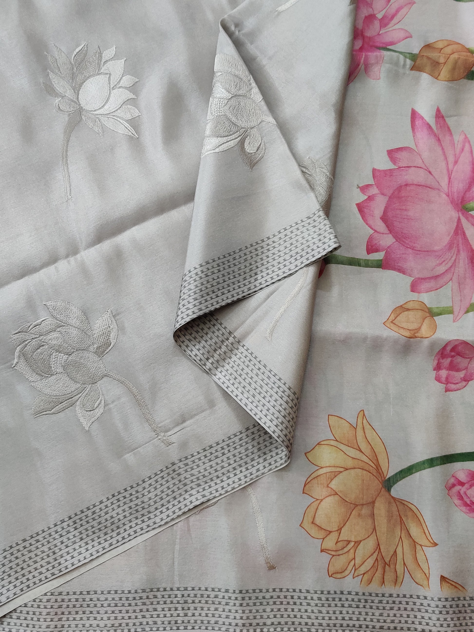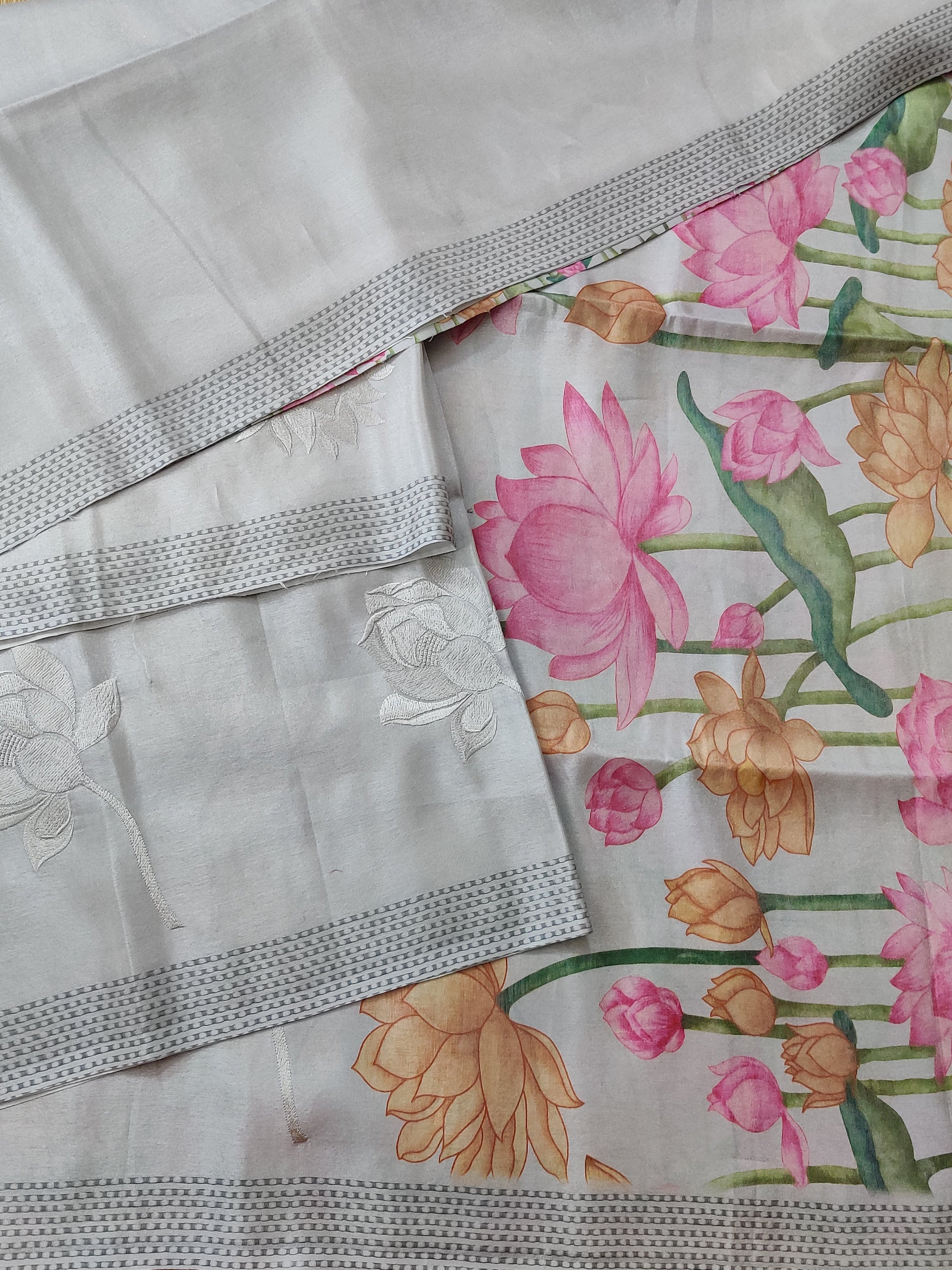 Experience timeless sophistication with this grey semi-tissue saree, adorned with detailed embroidery that showcases skilled craftsmanship. The digitally printed pallu introduces a modern artistic element, perfectly balancing tradition with contemporary style. Accompanied by a matching blouse, this saree is an excellent choice for festive celebrations and special occasions, offering both elegance and comfort.