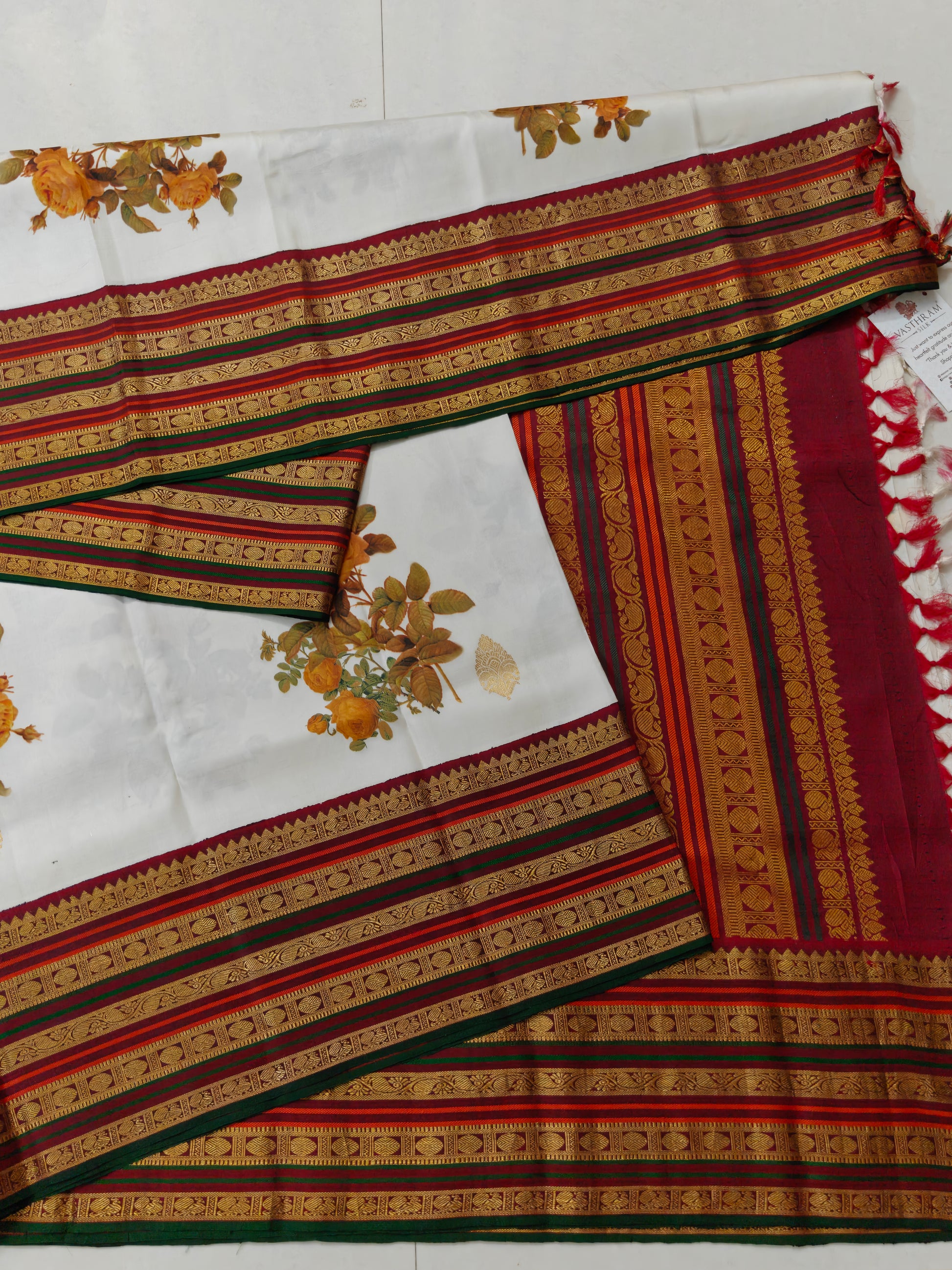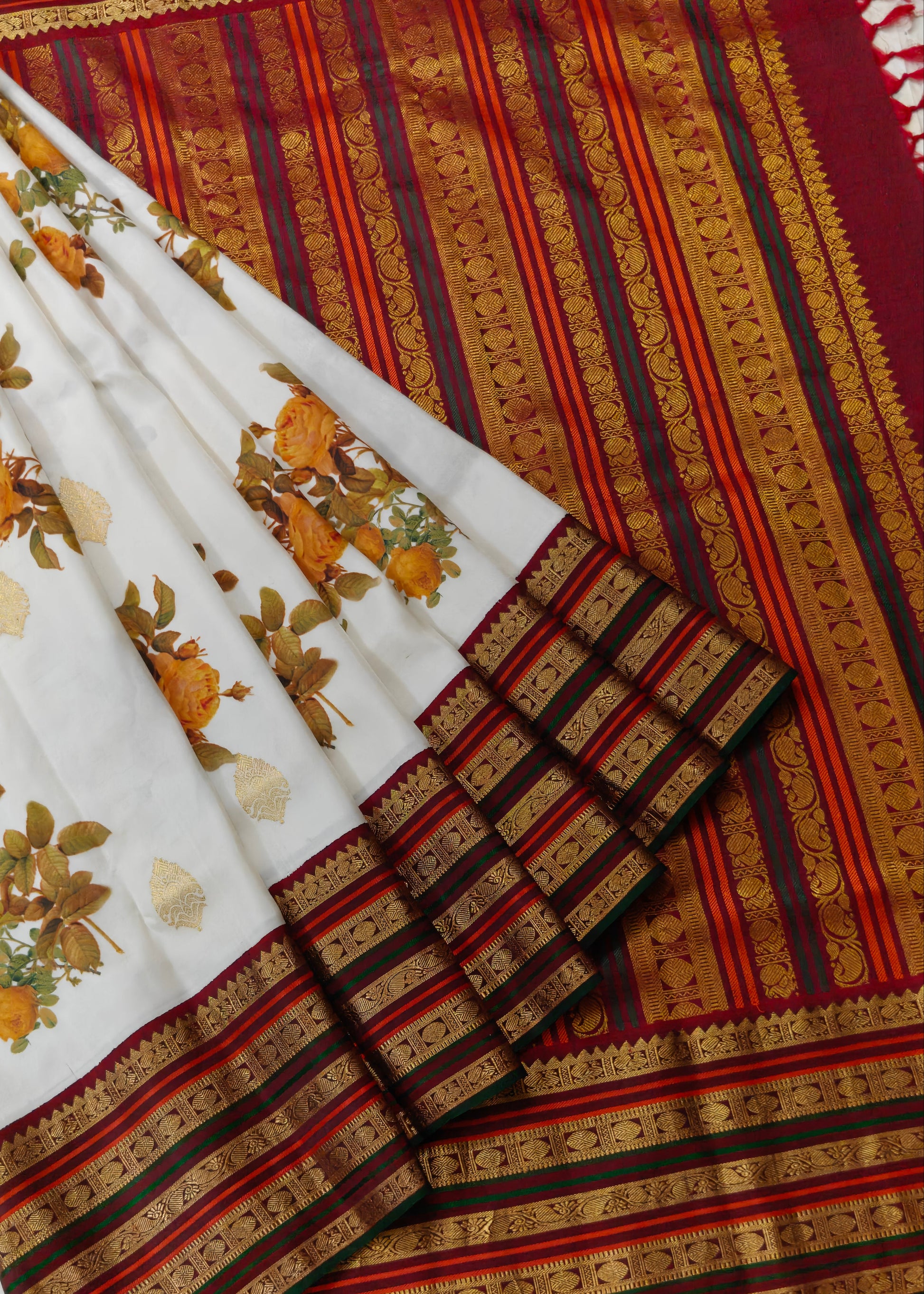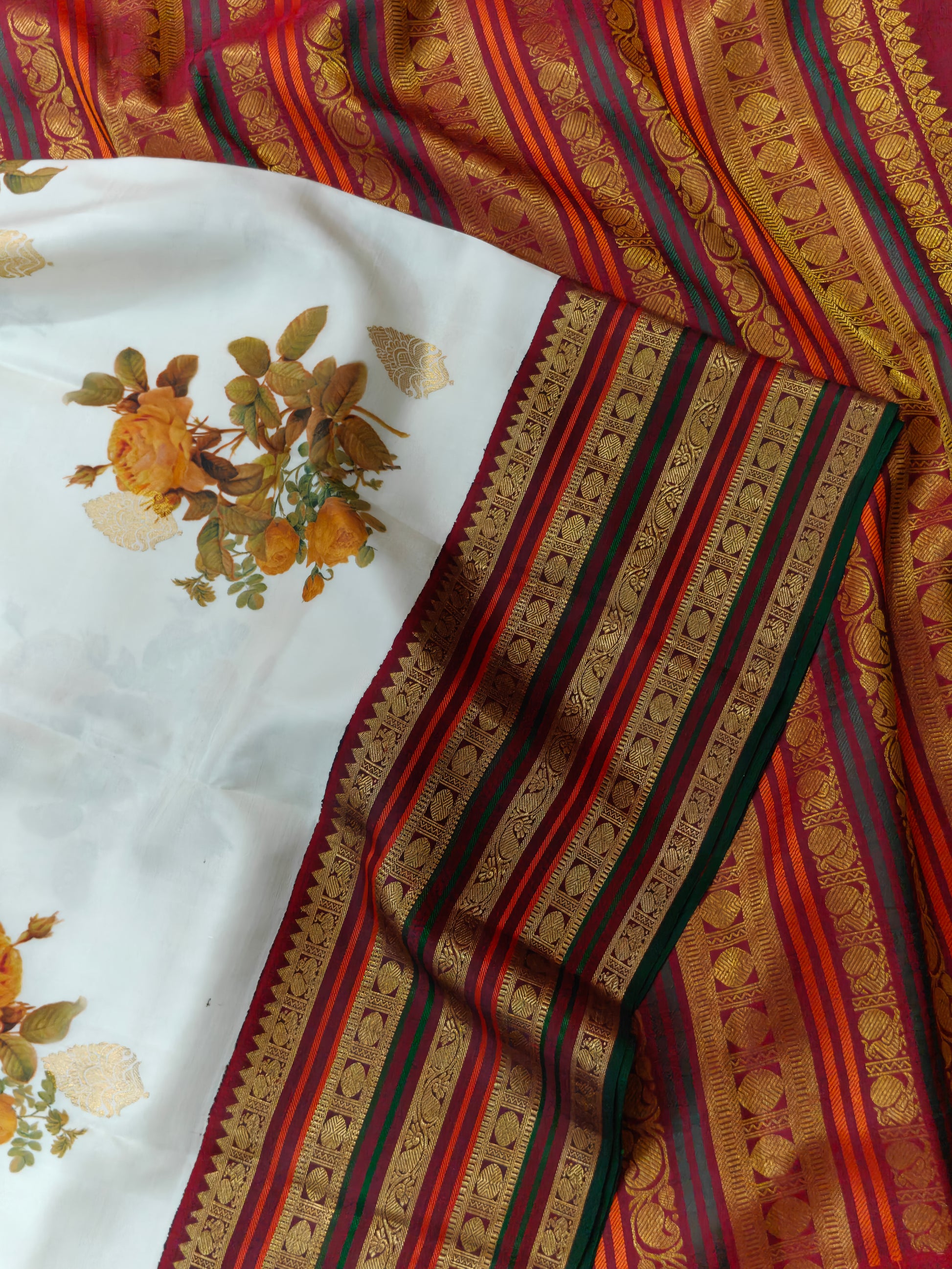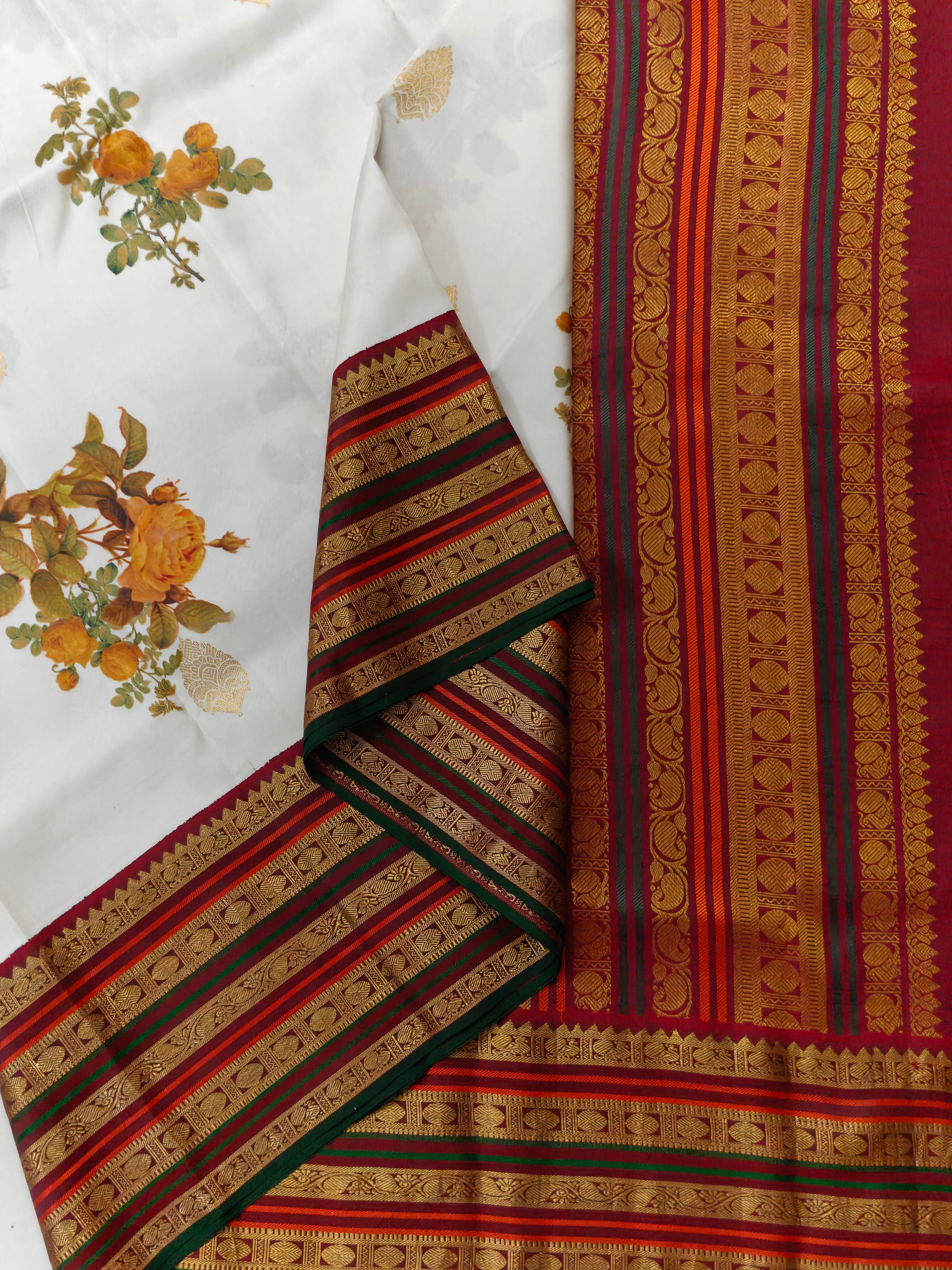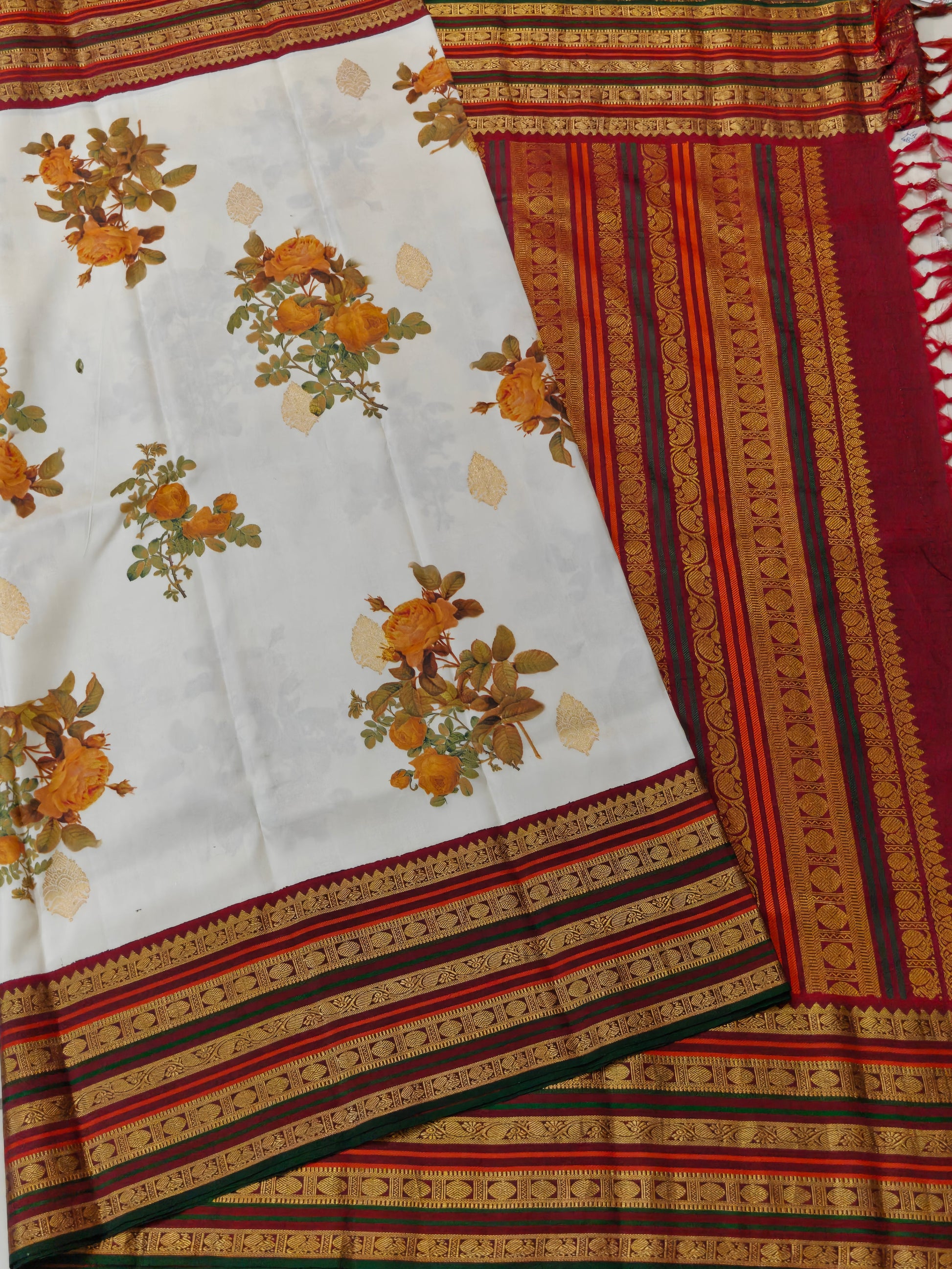 Elevate your ethnic wardrobe with this stunning white Kanchivaram silk saree, a masterpiece of traditional craftsmanship. The fabric showcases an intricate digital floral print with zari butta scattered throughout, creating a sophisticated all-over pattern. A striking maroon zari border frames the saree beautifully, while the matching zari pallu adds grandeur to your drape. Crafted from pure Kanchivaram silk, this saree offers exceptional durability and a luxurious sheen. The accompanying plain blouse provides versatility, allowing you to style it with your preferred blouse designs. Perfect for weddings, festivals, and special occasions, this saree seamlessly blends contemporary digital artistry with timeless silk heritage.