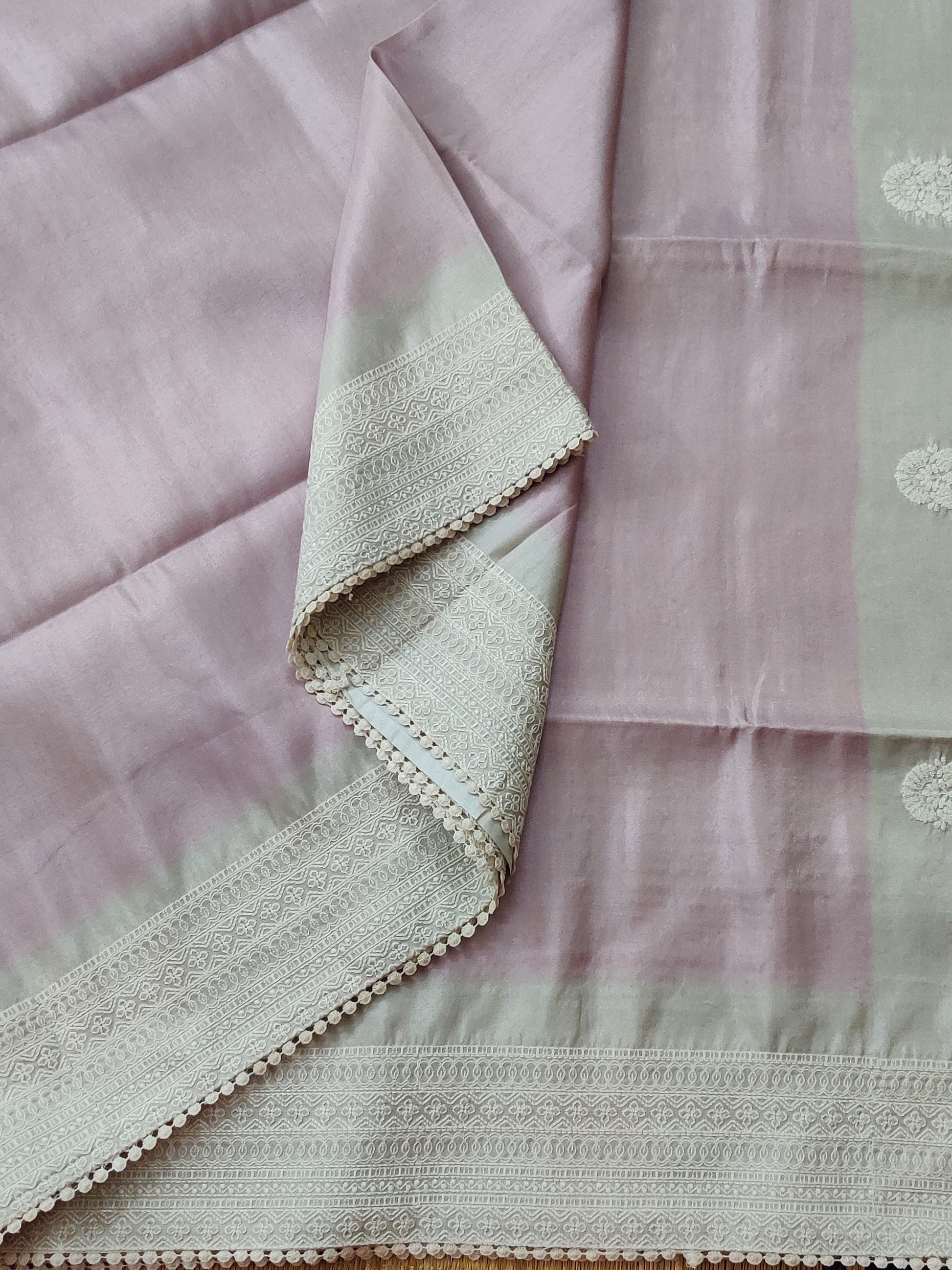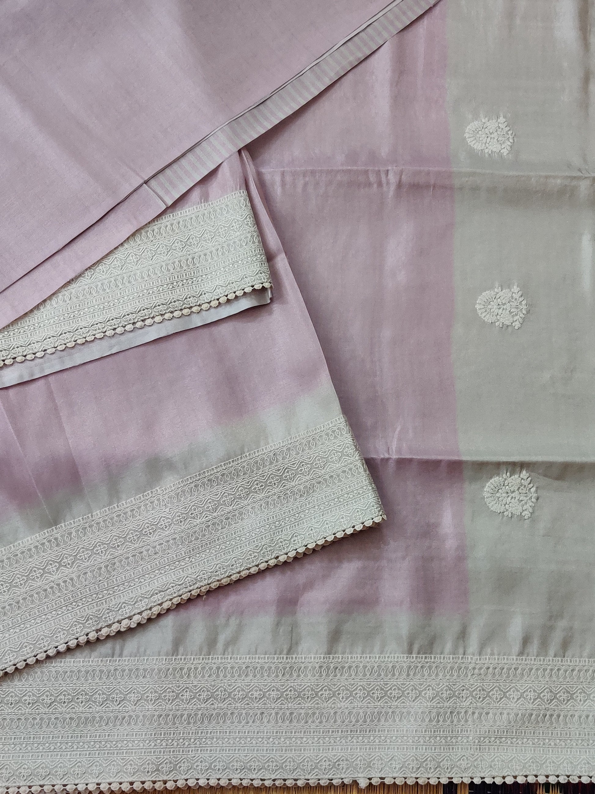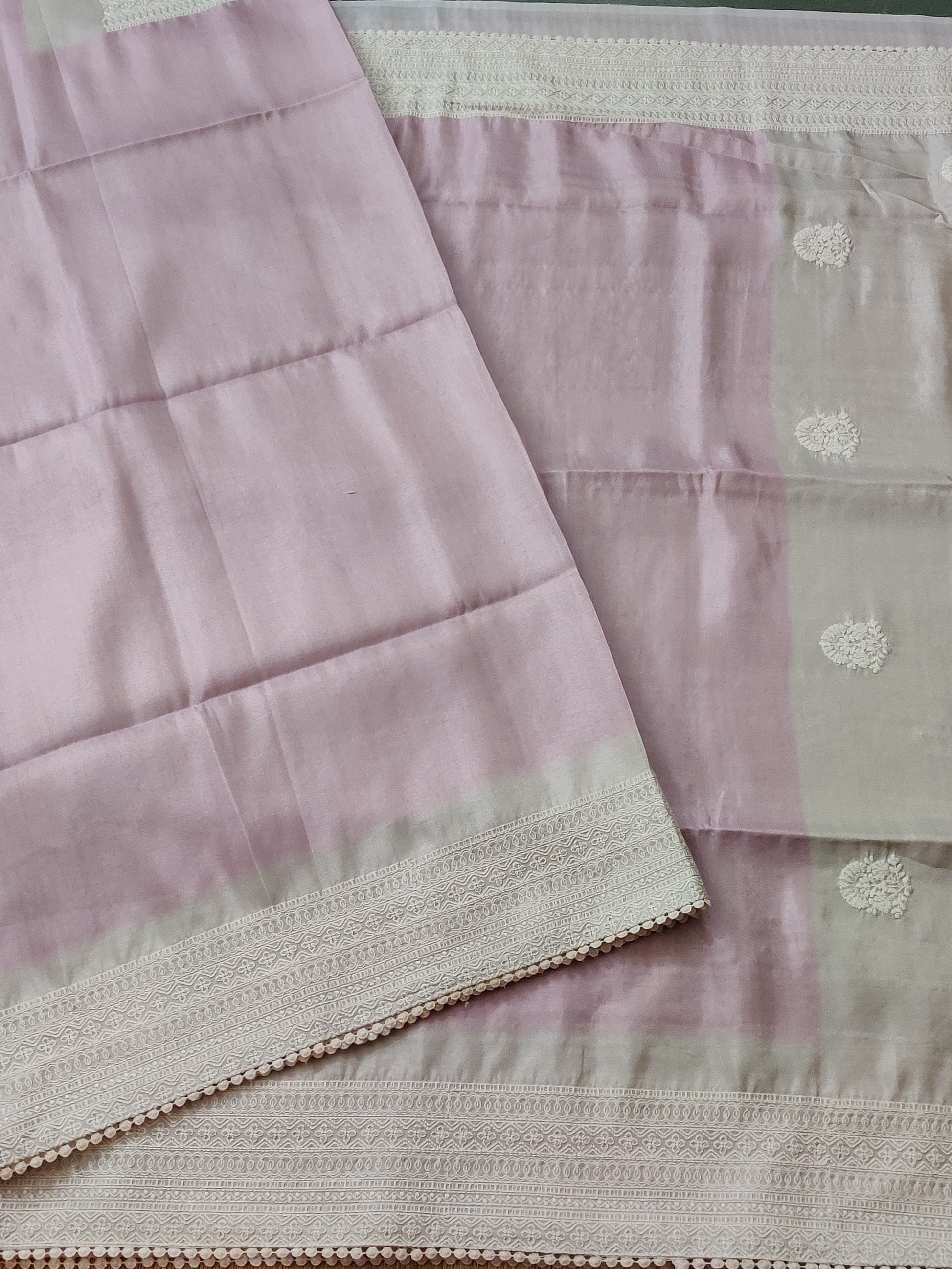 This elegant semi-tissue saree features a delicate light pink shade with a plain body, perfectly balanced by an off-white embroidered border and pallu that add refined contrast. The accompanying plain blouse enhances its understated charm. Ideal for occasions requiring subtle sophistication, this saree offers a graceful blend of comfort and style.