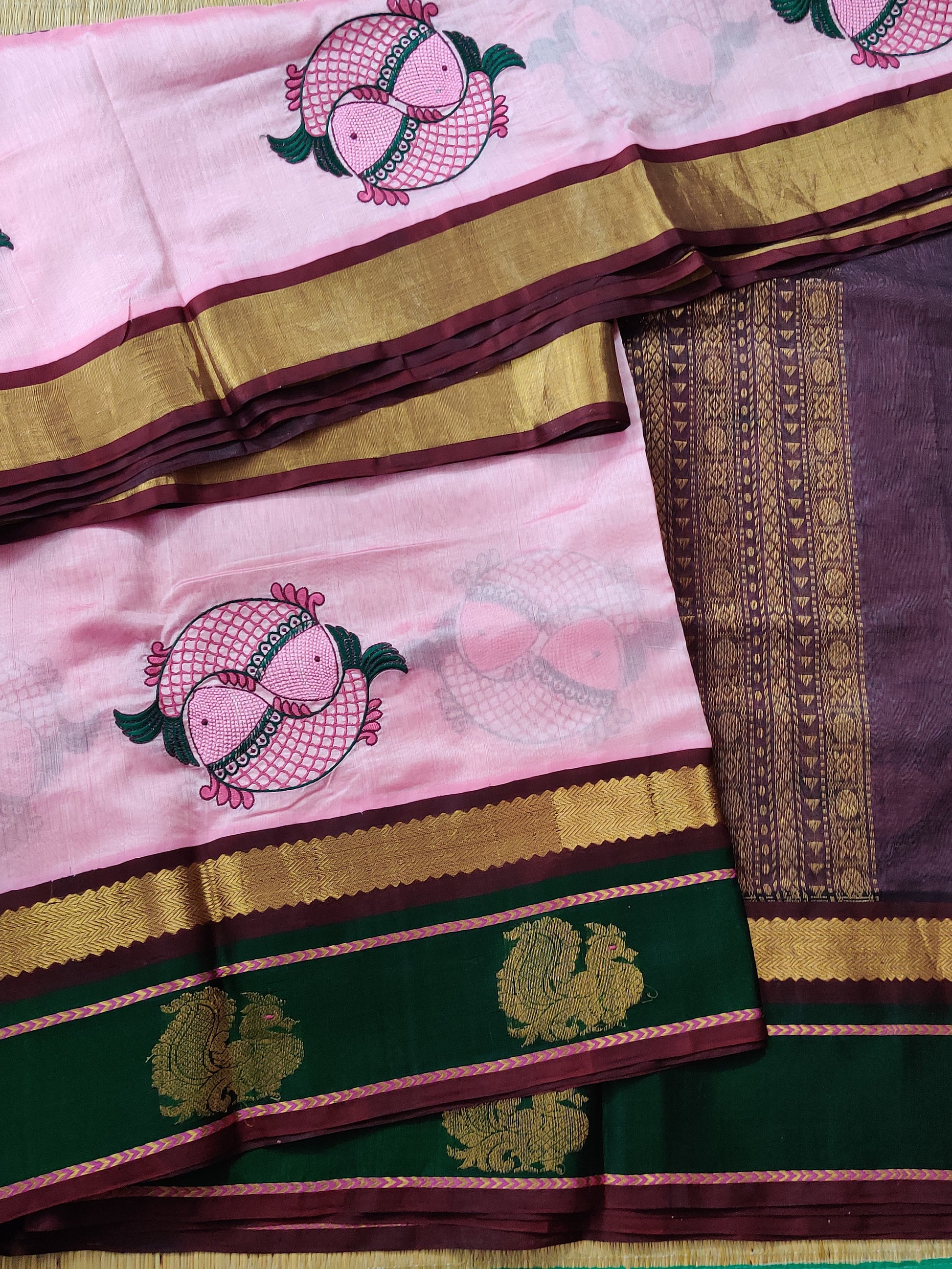 Light Pink Colour Silk Cotton Saree With Fish Embroidery All Over Code : SC033