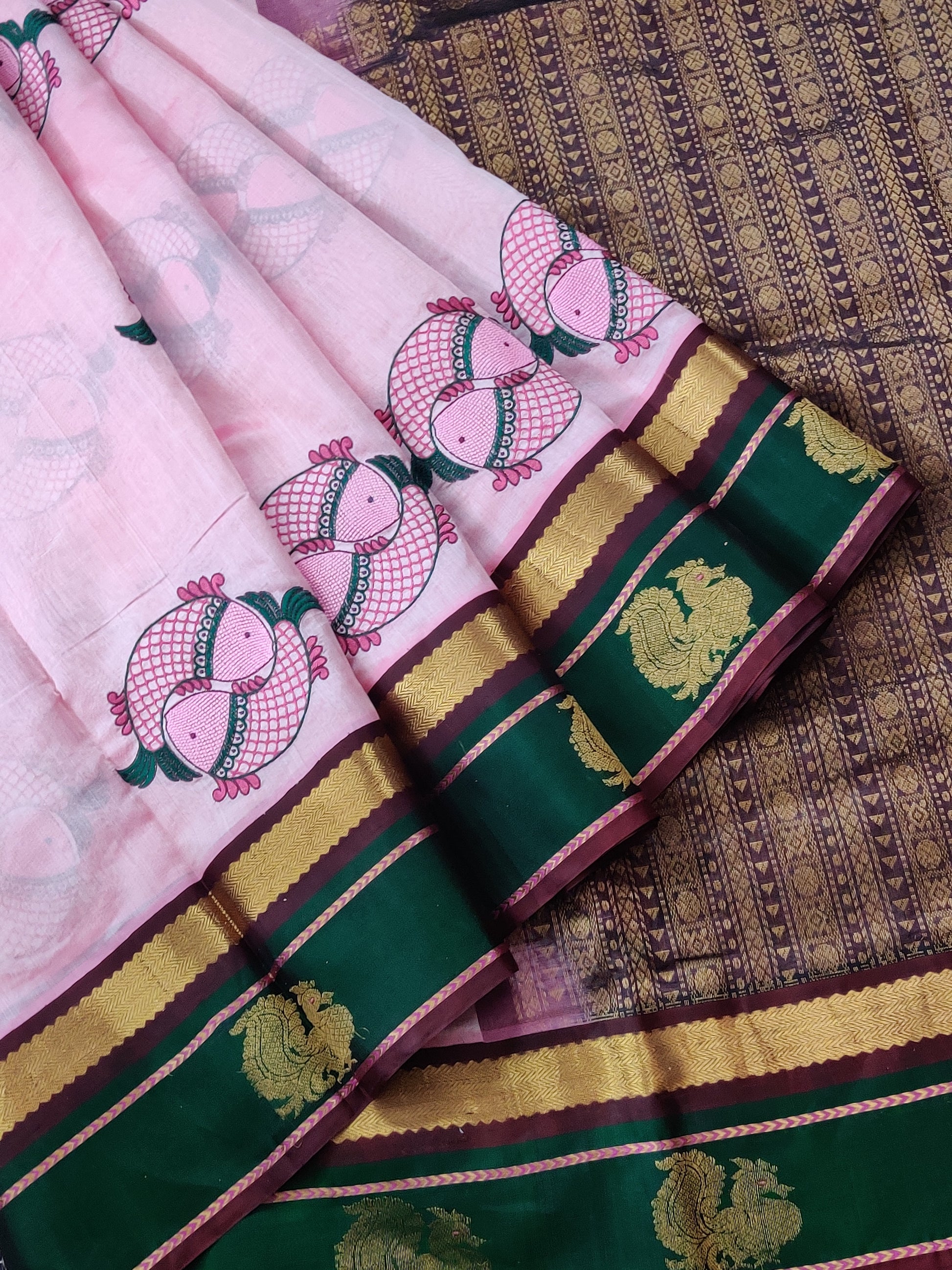 This elegant light pink silk cotton saree features intricate fish embroidery spread throughout, adding a unique and delicate charm. Enhanced with a contrasting green zari border and a rich zari pallu, it beautifully balances subtlety with sophistication. Complemented by a matching green blouse, this saree is ideal for those seeking a refined traditional look with detailed craftsmanship.