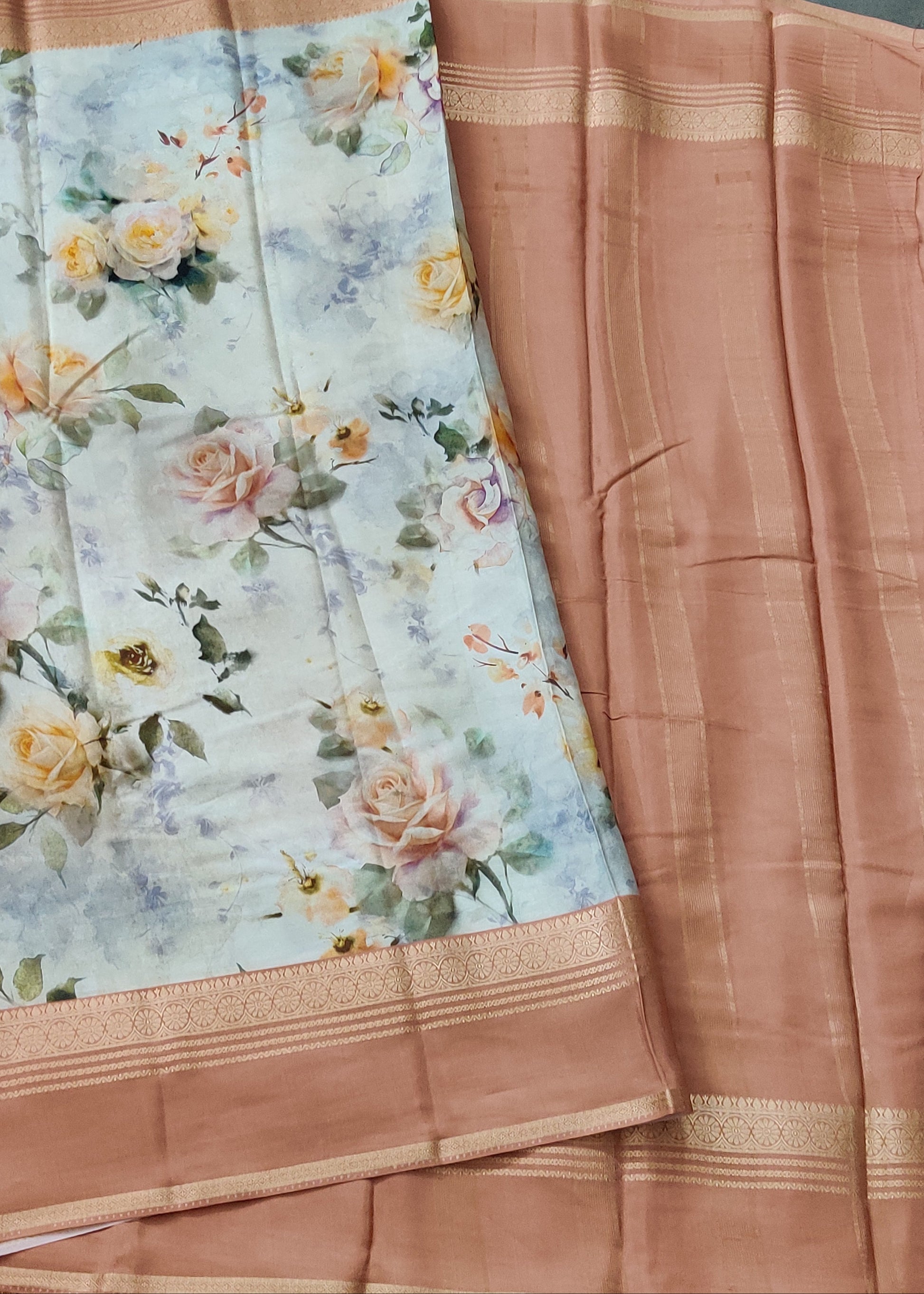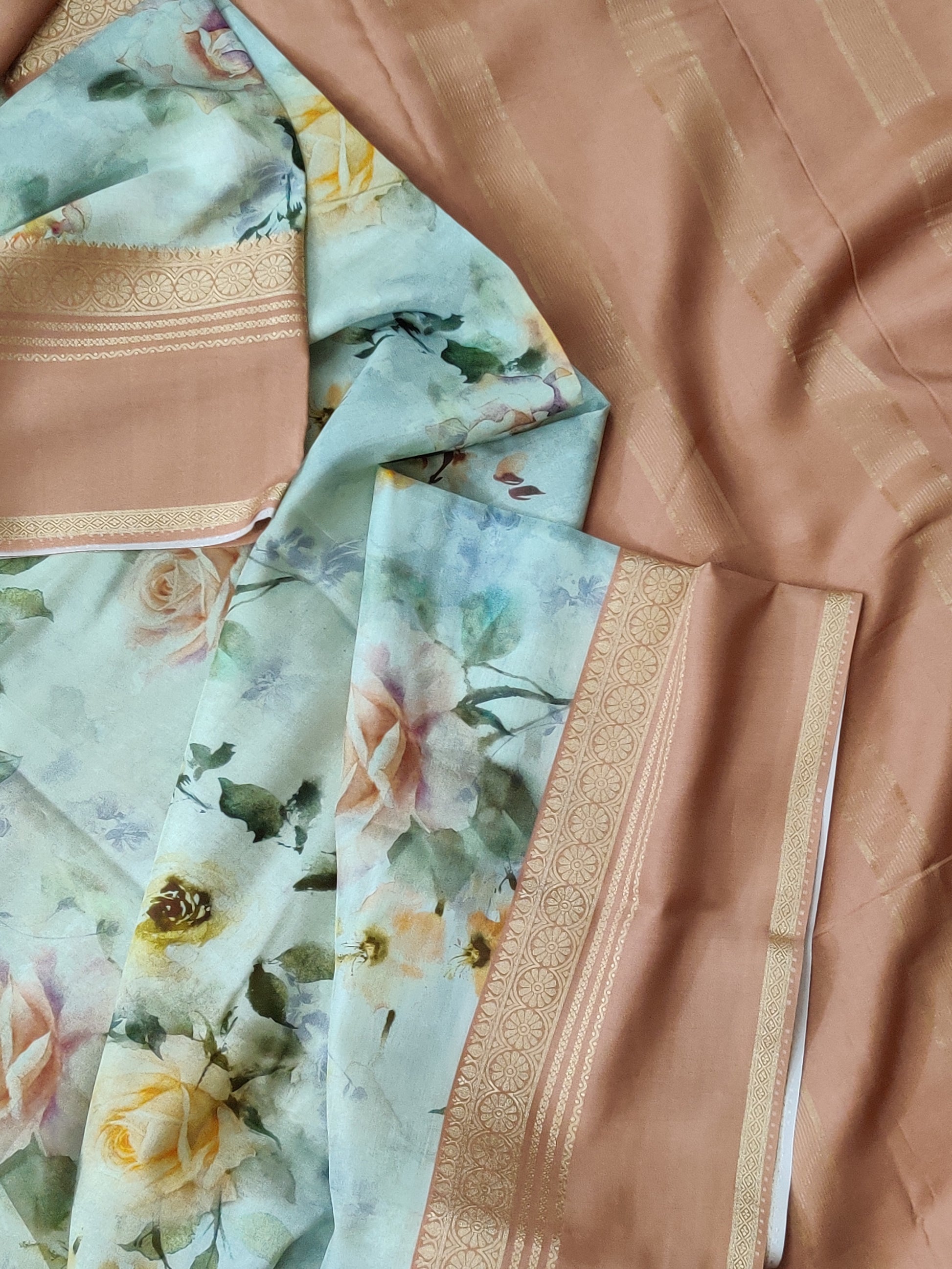 Elevate your ethnic wardrobe with this sophisticated light pista green semi-Mysore crepe silk saree. The fabric drapes beautifully with a subtle texture, while an intricate floral digital print adorns the entire length, adding contemporary elegance. The contrast peach zari pallu and matching zari border create a striking focal point, perfectly balancing the soft green base. Paired with a plain blouse, this versatile piece transitions seamlessly from festive occasions to formal gatherings, offering timeless appeal with modern design sensibilities.
