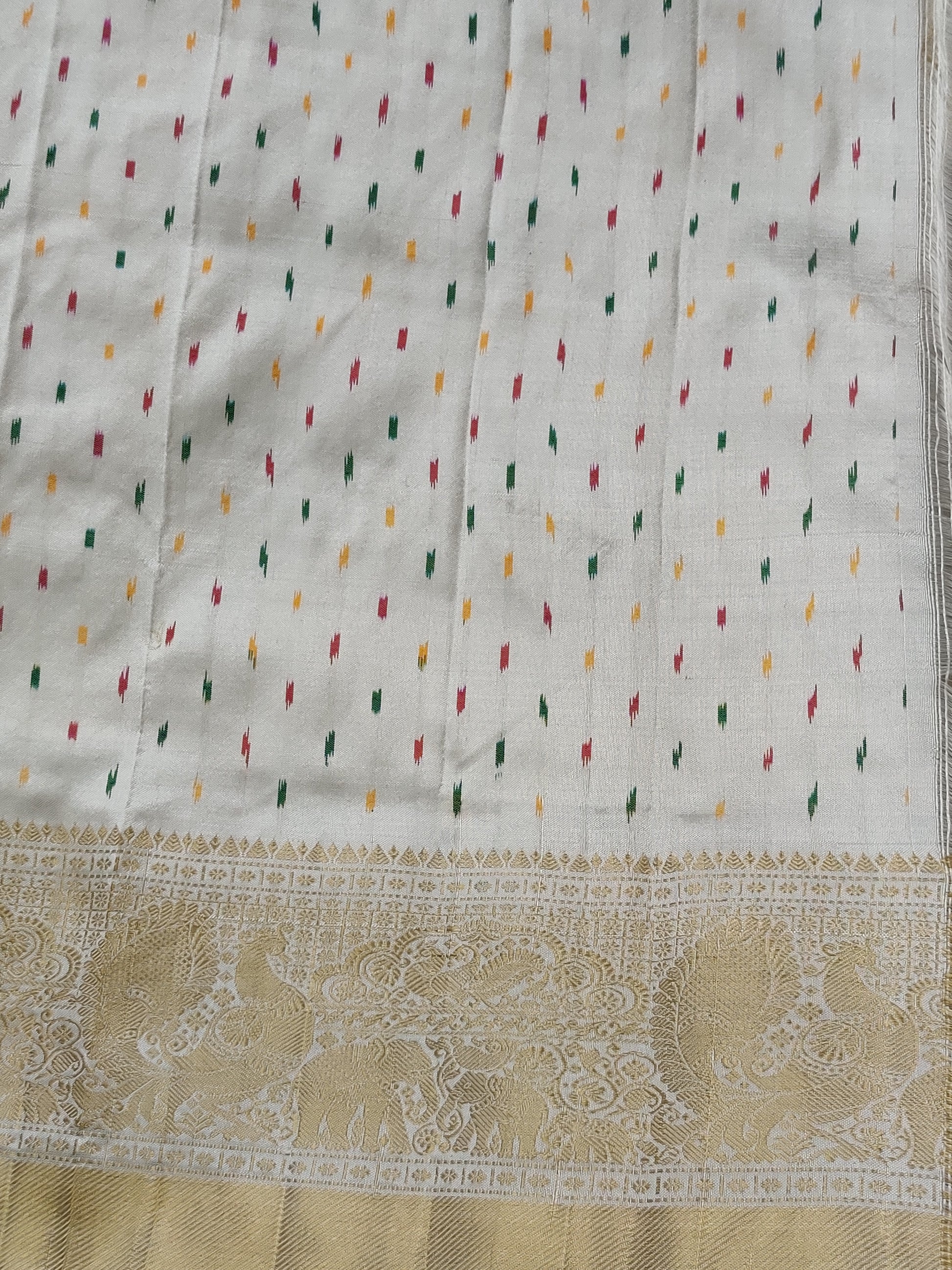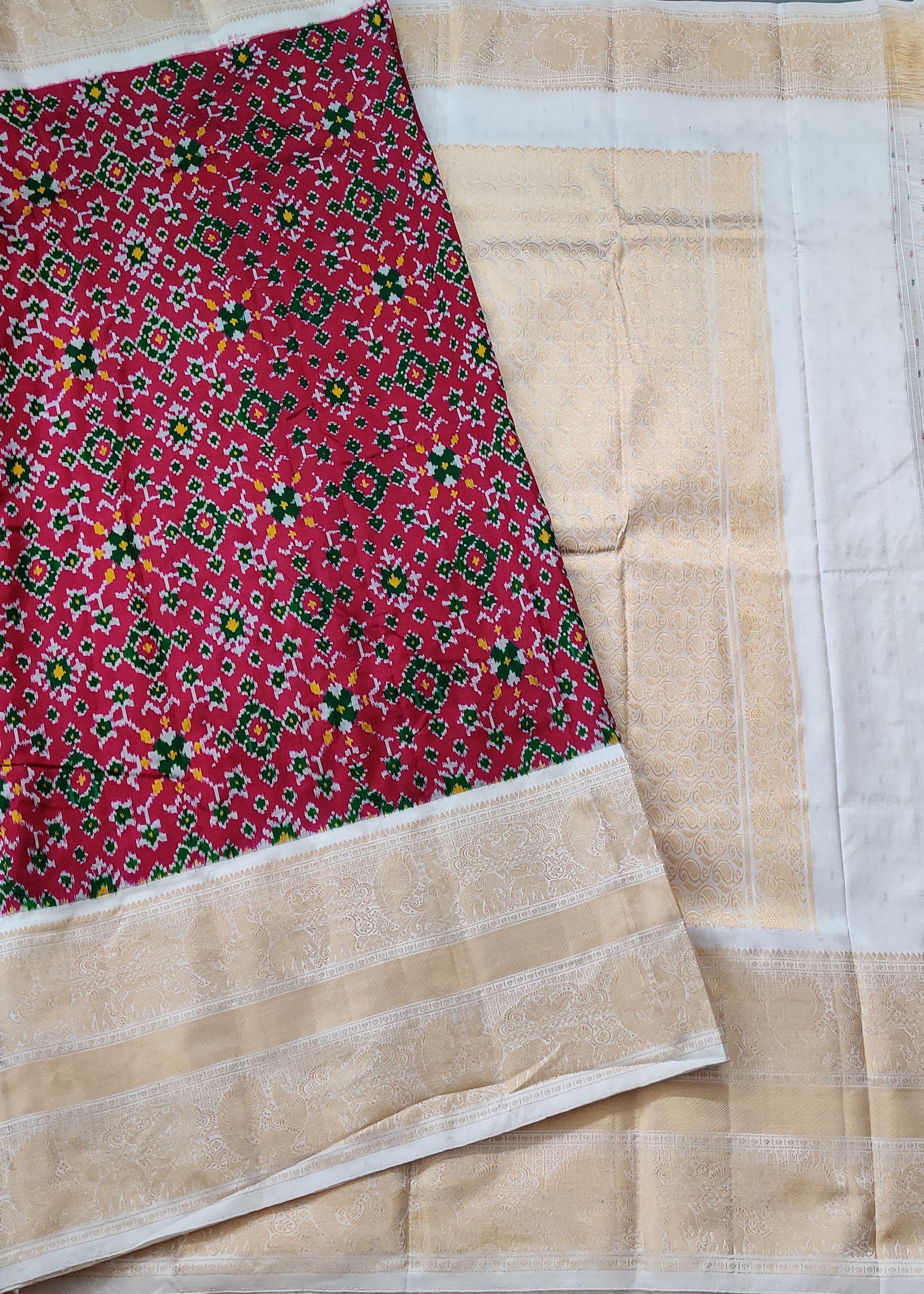 This magenta ikkat silk saree showcases intricate ikkat weaving throughout, reflecting expert craftsmanship. The rich magenta hue is beautifully complemented by a contrasting cream kanchi zari border and a delicate zari pallu, adding a touch of elegance. Paired with a stylish butta blouse, this saree is perfect for traditional occasions, combining vibrant color and refined detail for a sophisticated look.