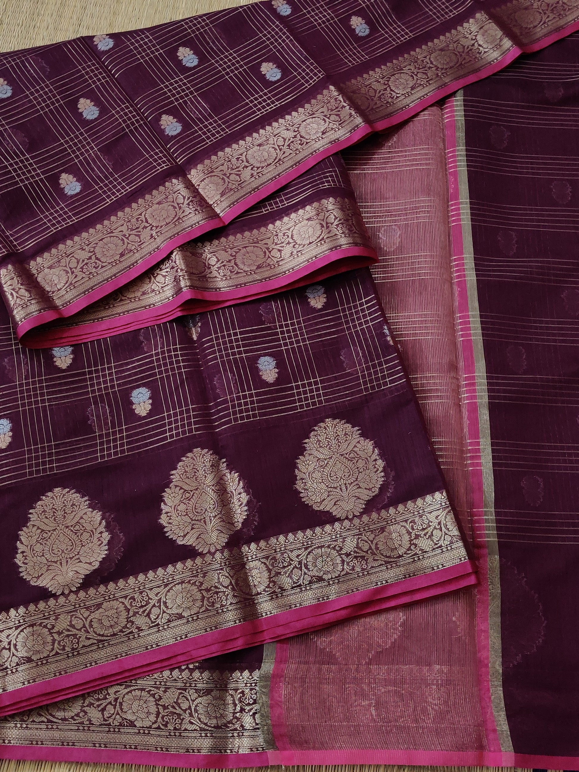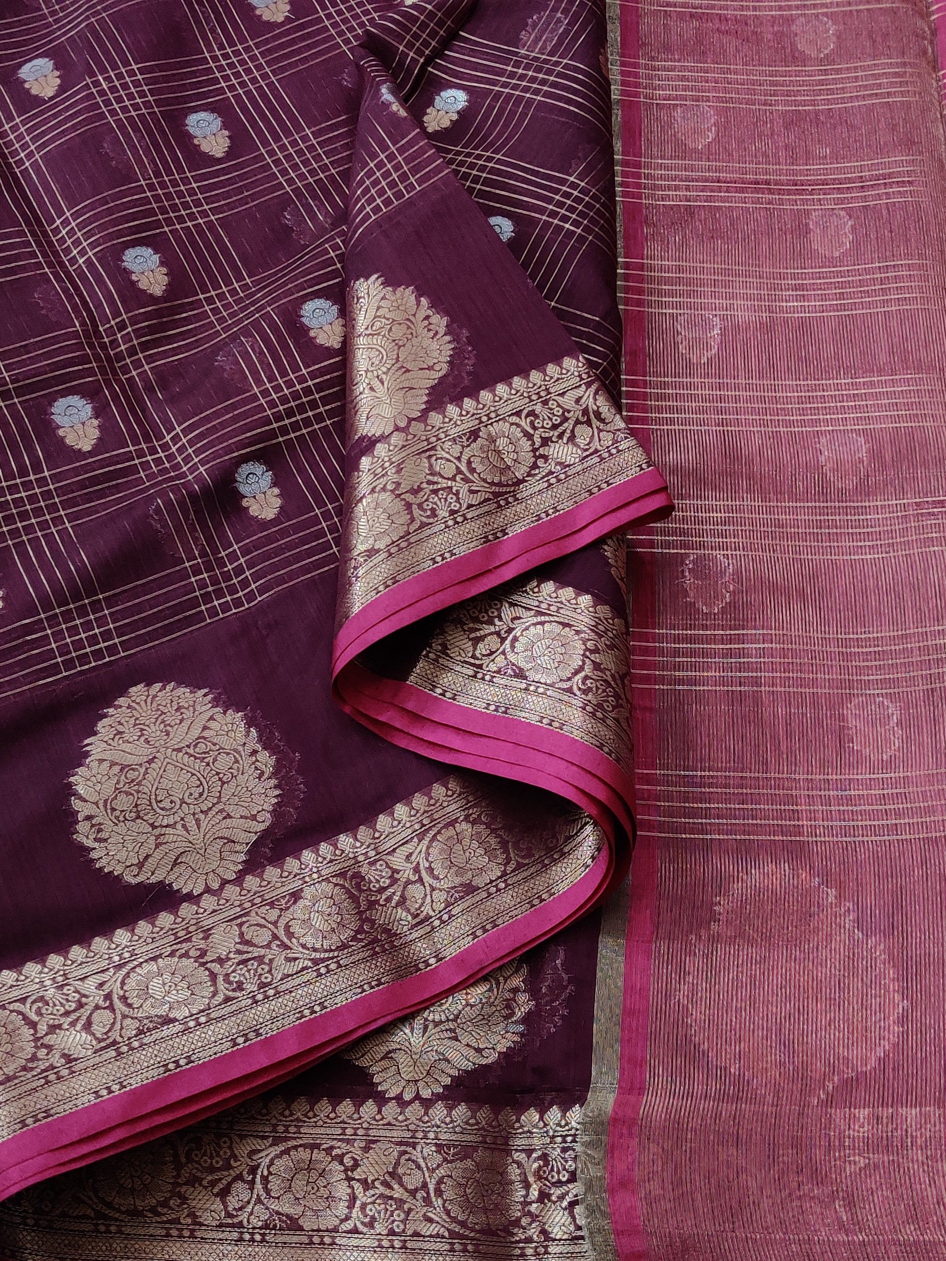 This elegant maroon semi Banarasi saree features intricate zari checks motifs woven throughout, complemented by a rich zari border and pallu that enhance its traditional appeal. Paired with a contrasting blouse adorned with zari stripes, this saree offers a refined blend of classic craftsmanship and contemporary style, perfect for festive occasions and formal events.