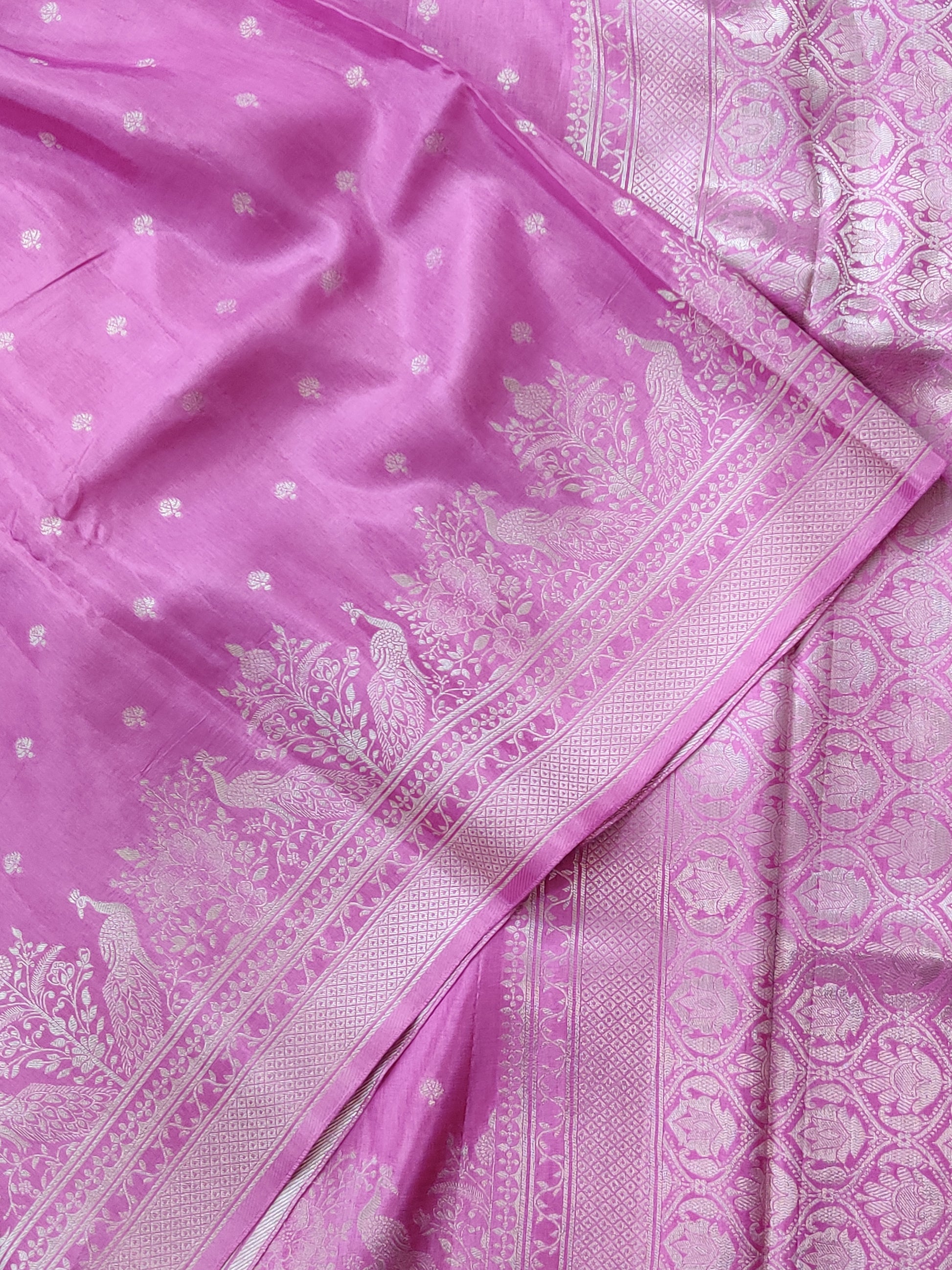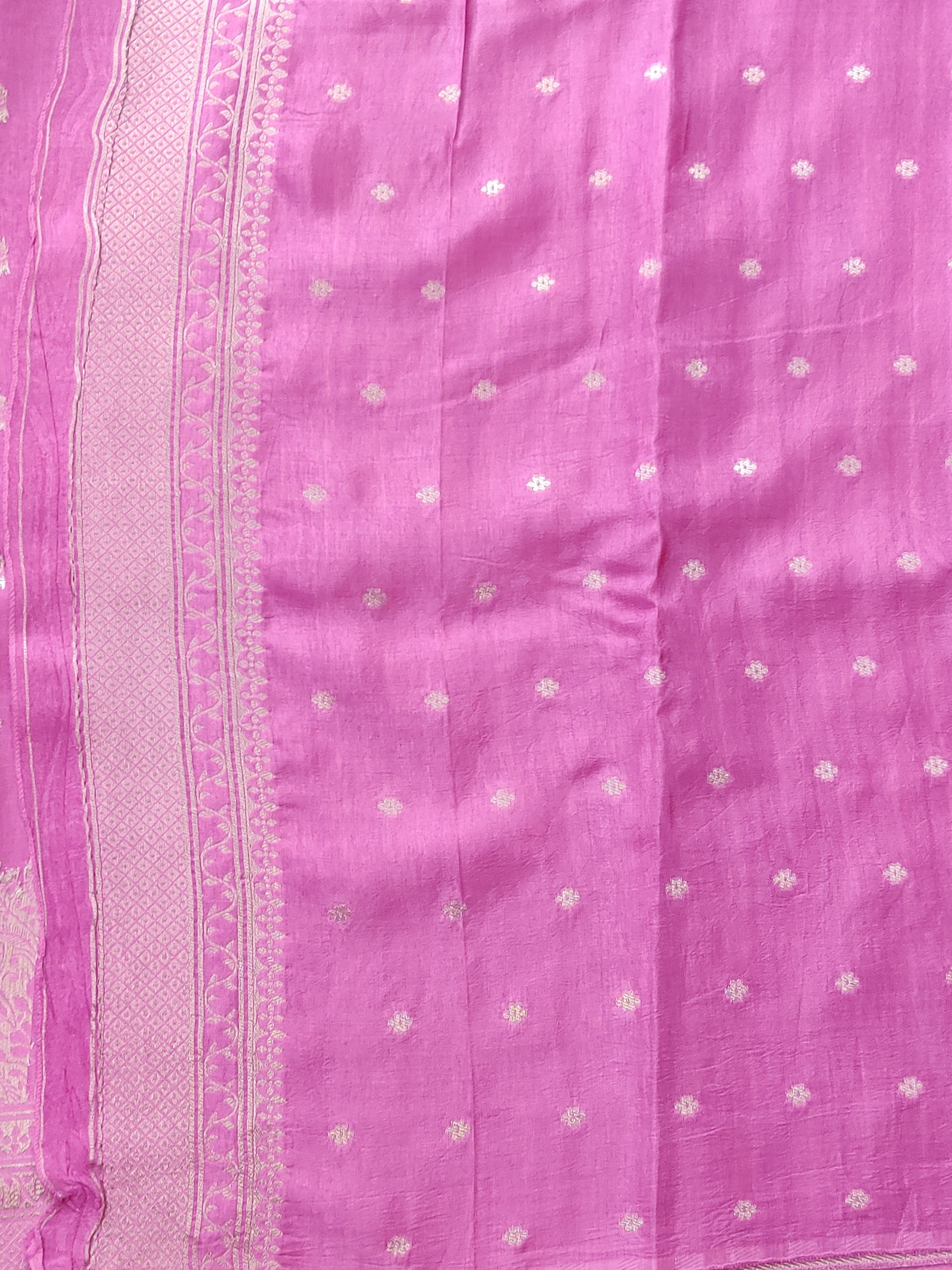 Elevate your ethnic wardrobe with this exquisite mauve semi-mashru saree, a masterpiece of traditional craftsmanship. The fabric showcases intricate zari buttas scattered across the entire drape, creating a luminous, sophisticated aesthetic. A gleaming zari border frames the saree elegantly, while the ornate zari pallu serves as a stunning focal point. Paired with a coordinating butta blouse, this ensemble offers versatility for festive occasions, celebrations, and formal gatherings. The semi-mashru weave ensures comfort without compromising on opulence, making it an ideal choice for those who appreciate refined, timeless elegance.