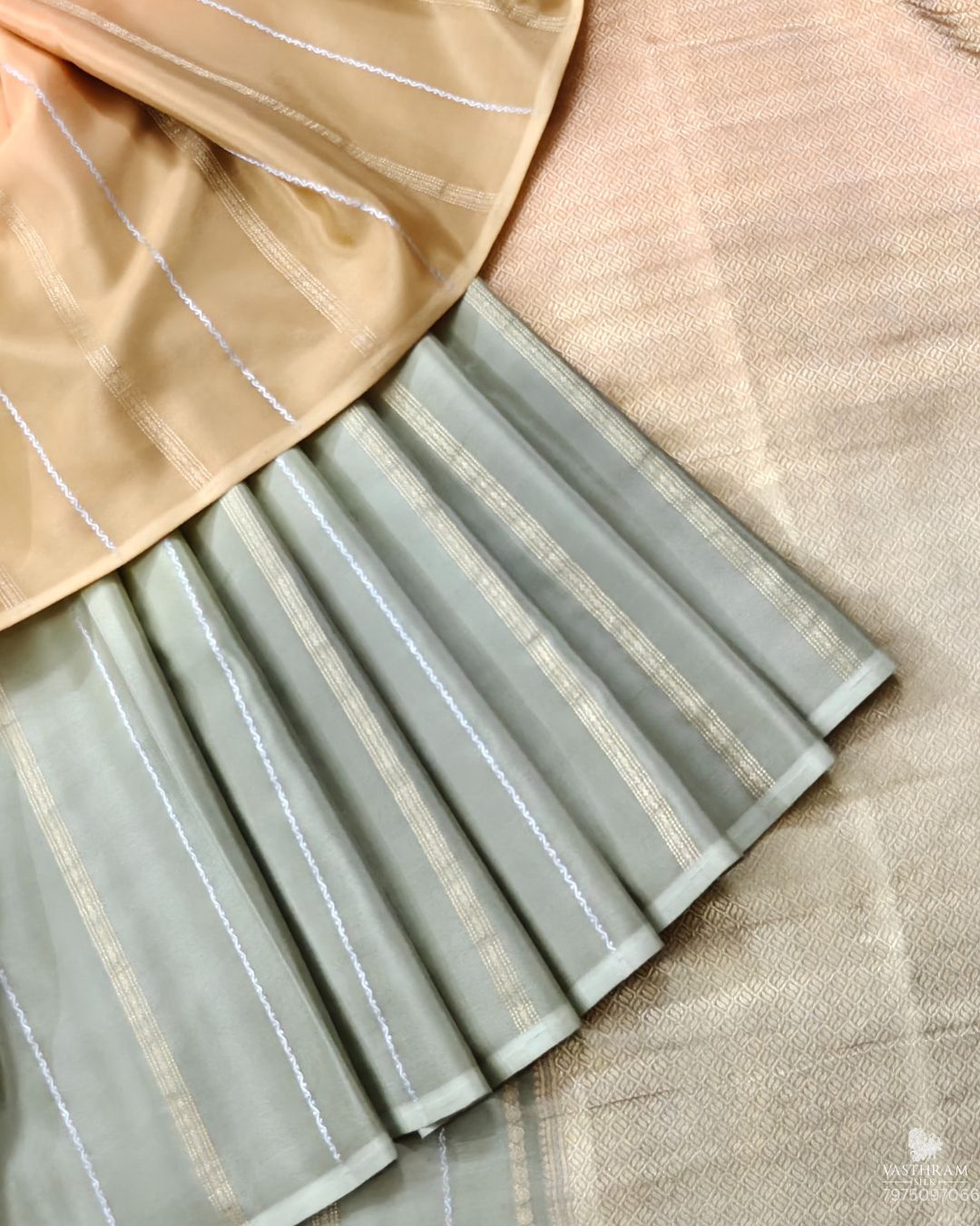 Mehandi Green And Orange Mysore Crepe Silk Saree With Zari Strips All Over Code : MC008