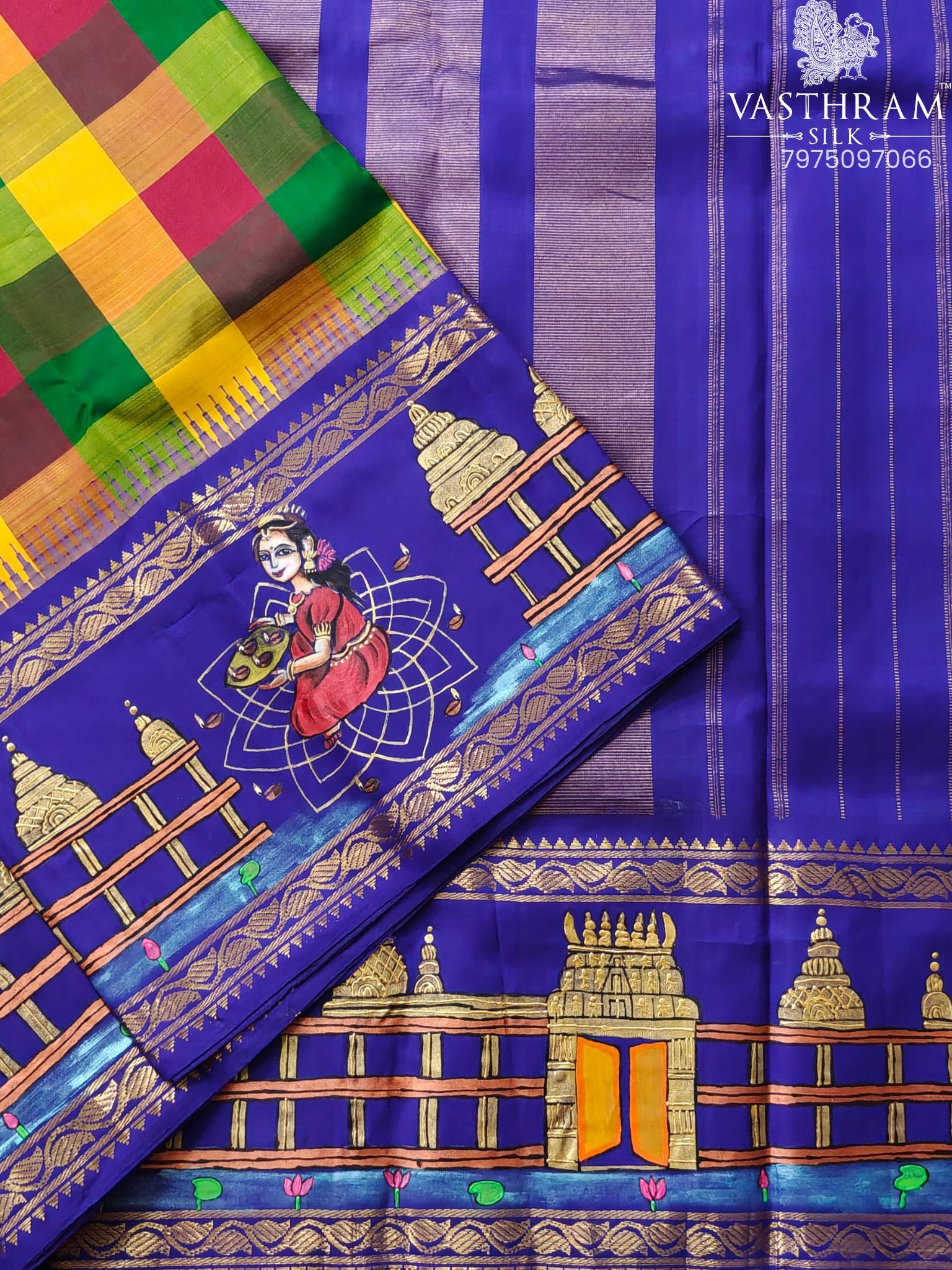 Experience the timeless elegance of this multi-colour Kanchivaram silk saree, featuring a sophisticated checks motif across the body. The saree is elevated by a striking contrast purple Tanjore hand-painted border that showcases intricate artistry, paired with a luxurious zari pallu. Crafted from premium silk, this traditional piece seamlessly blends classic weaving techniques with artistic hand-painting, making it an ideal choice for festive occasions and celebrations. Perfect for those who appreciate authentic South Indian craftsmanship and refined style.