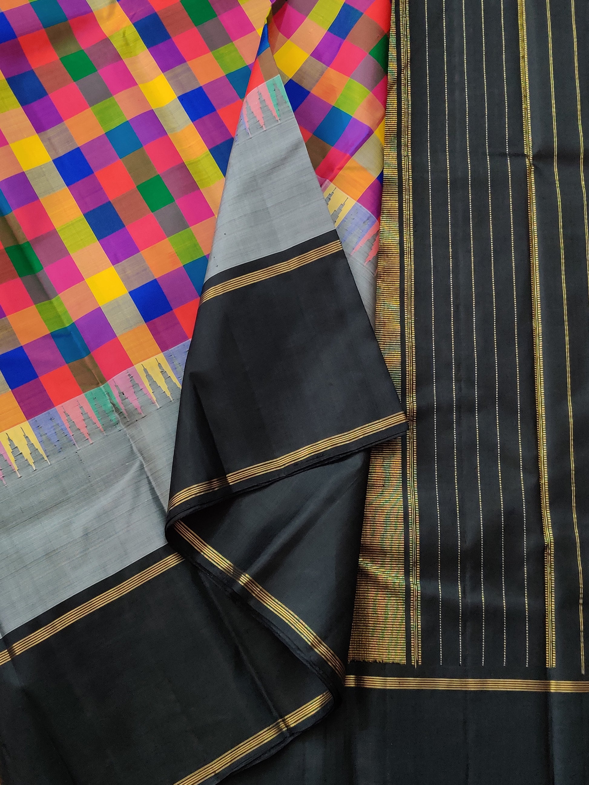Multi Colour Kanchivaram Silk Saree With Multi Colour Checks Motif Body Code : KA0381