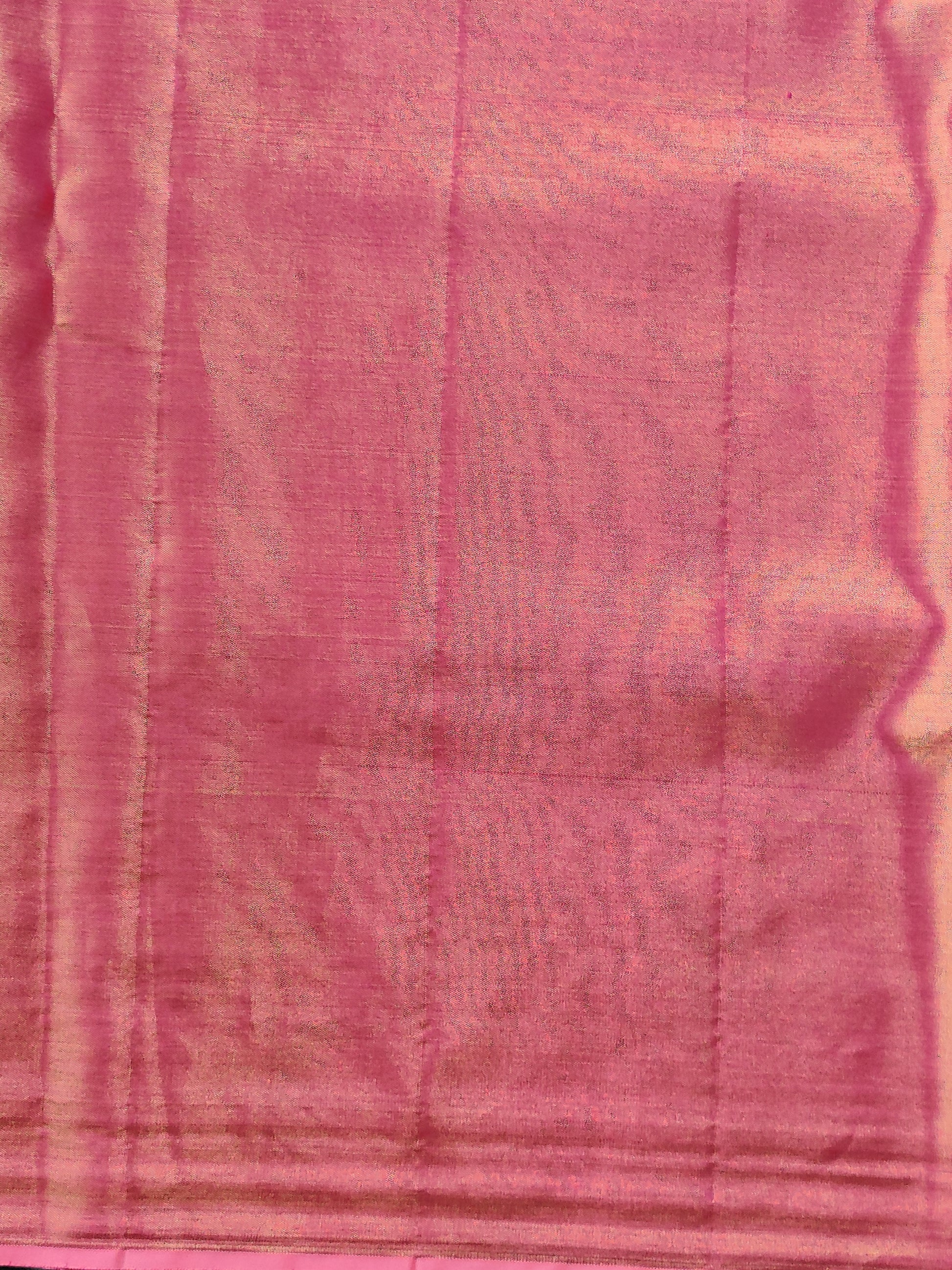 This multi-colour tissue Kanchivaram silk saree features intricate zari and thread woven motifs throughout, showcasing exceptional craftsmanship. The vibrant contrast pink zari border adds a striking elegance, perfectly complemented by a plain blouse for a balanced and sophisticated look. Ideal for festive occasions and celebrations, this saree combines traditional artistry with rich silk texture for a timeless appeal.