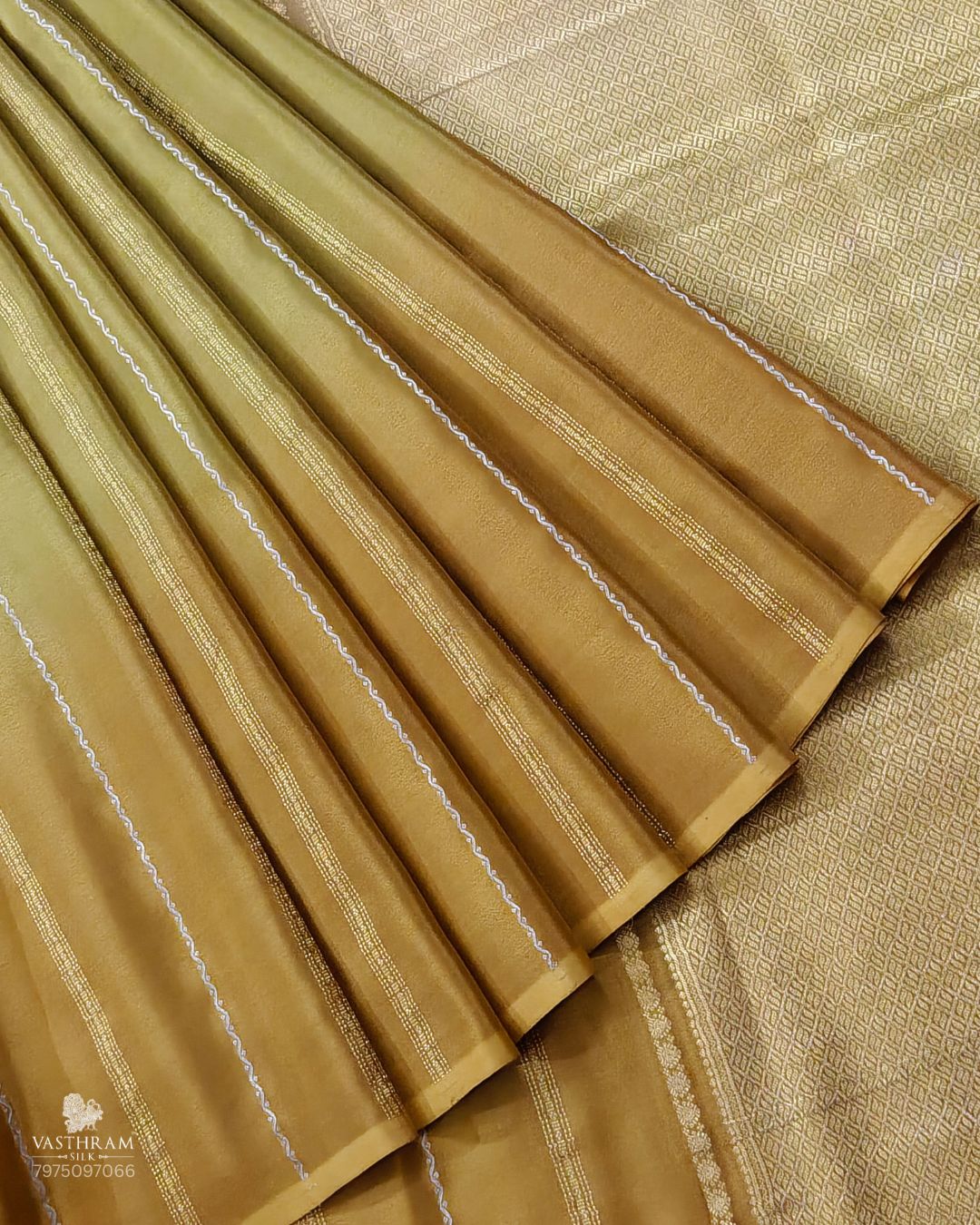 Mehandi Green And Gold Colour Mysore Crepe Silk Saree With Zari Strips All Over Code : MC012