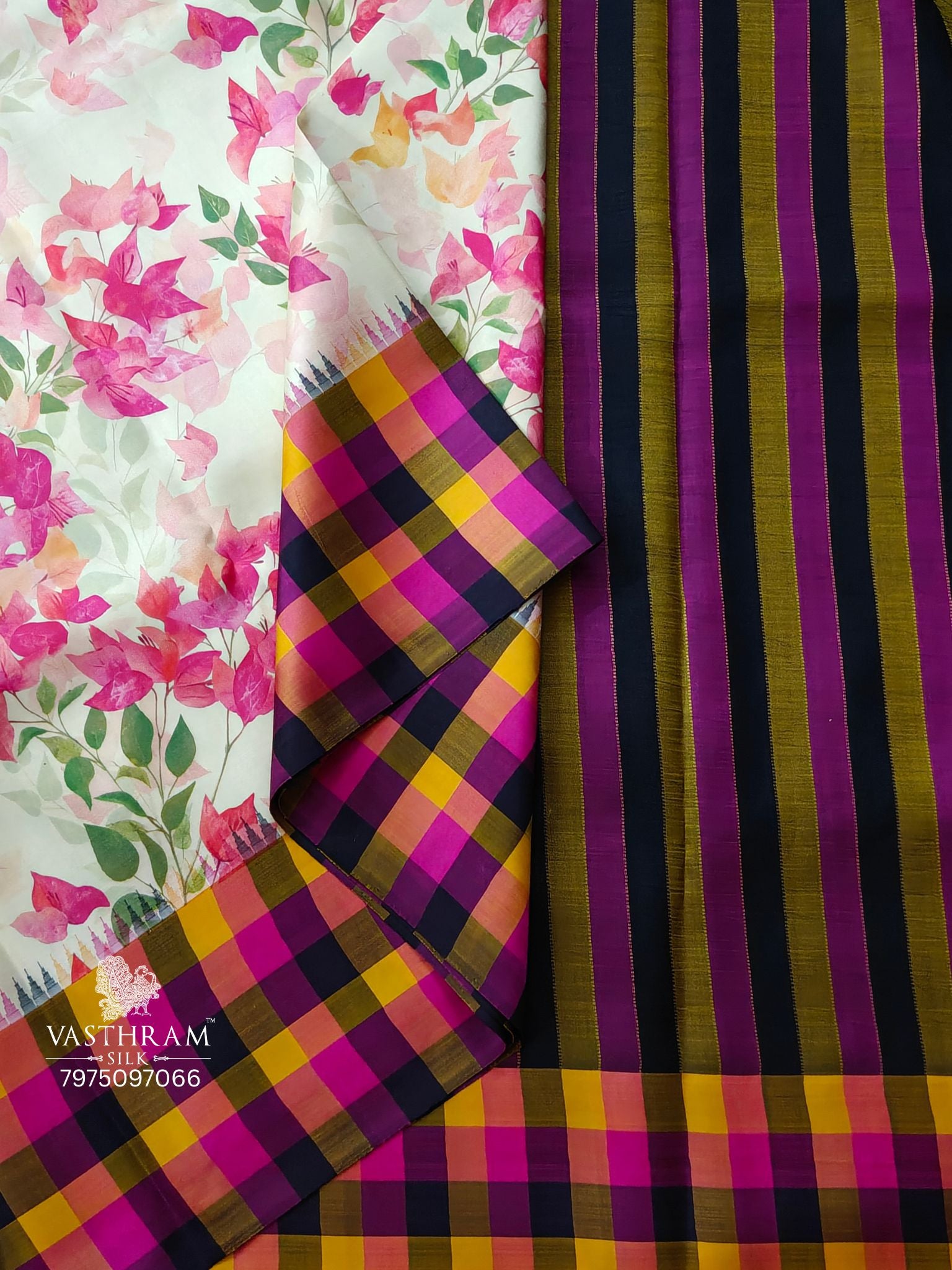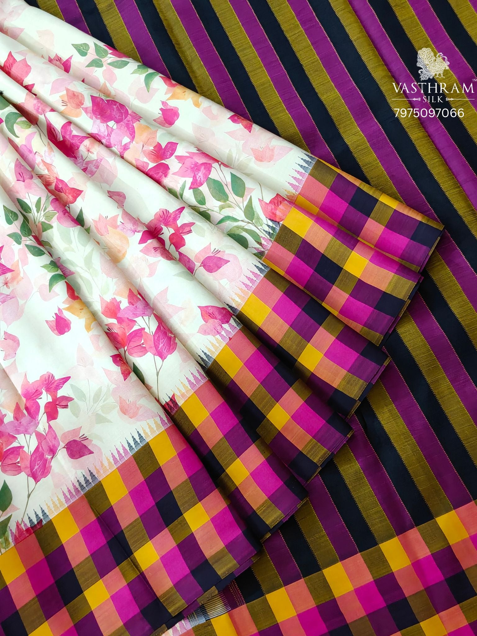 Elevate your ethnic wardrobe with this stunning off-white Kanchivaram silk saree, featuring an exquisite bougainvillea digital print that adorns the entire fabric. The saree showcases a sophisticated check motif border and matching pallu, adding traditional charm to the contemporary design. Paired with a complementary striped blouse, this piece seamlessly blends classic weaving techniques with modern aesthetics. Perfect for festive occasions, celebrations, or special events, this saree offers the luxurious feel of pure silk with timeless elegance and vibrant visual appeal.
