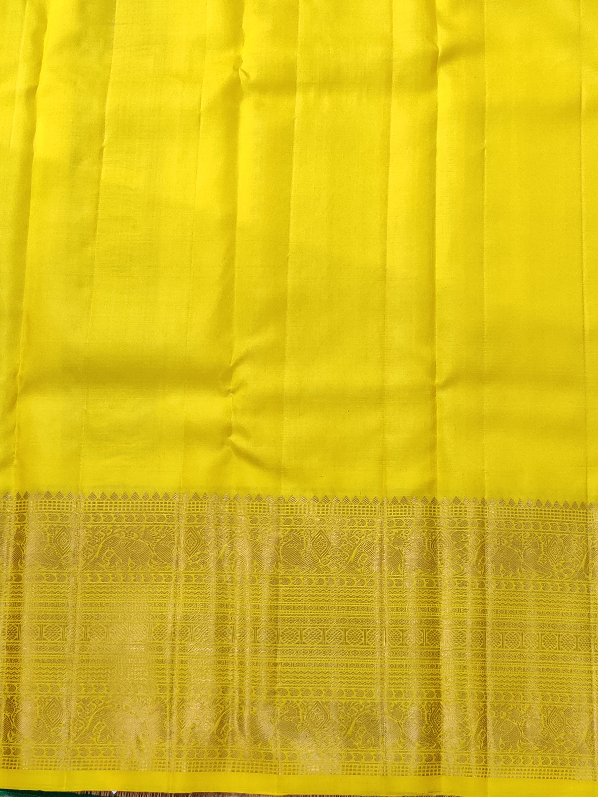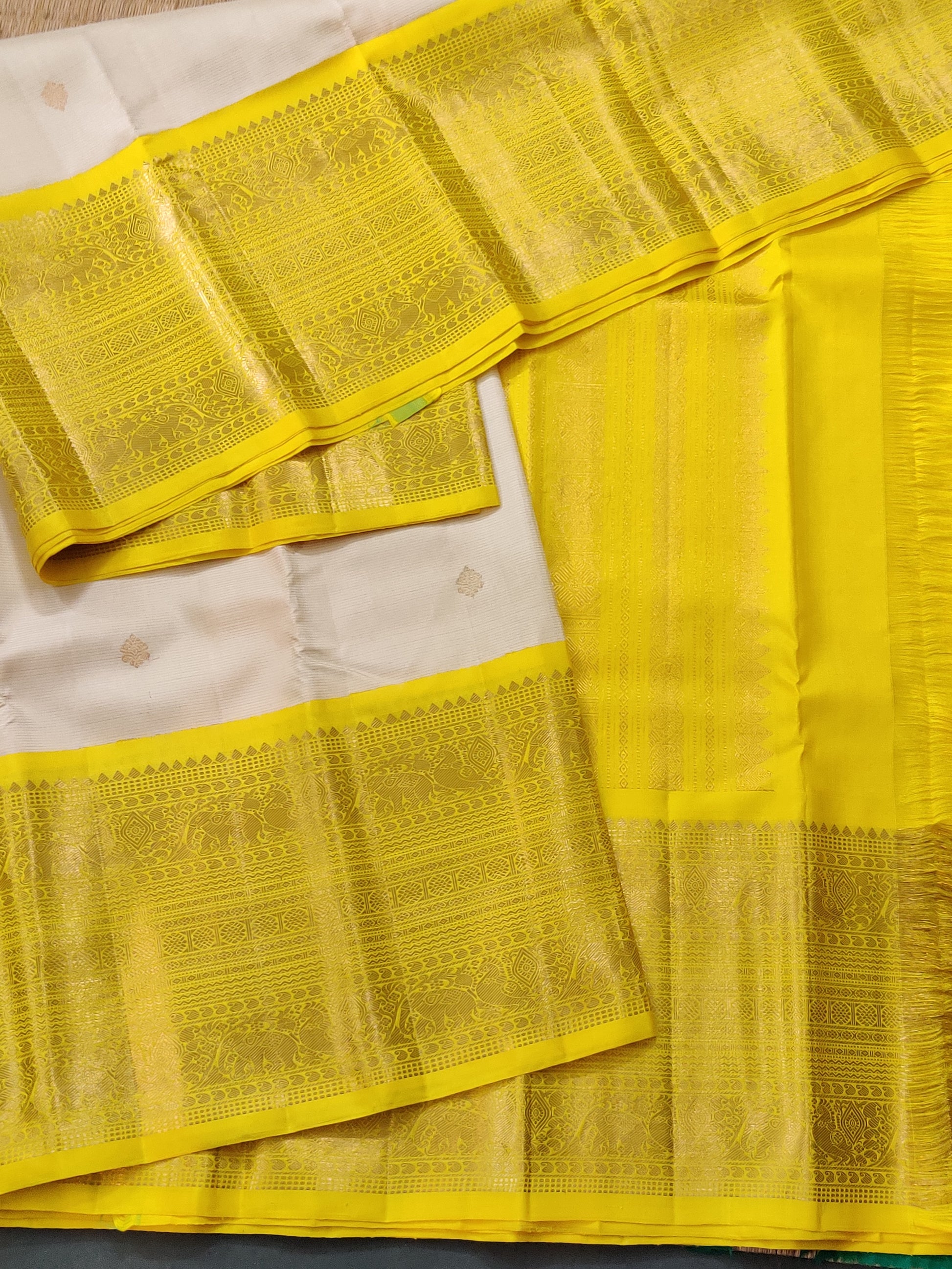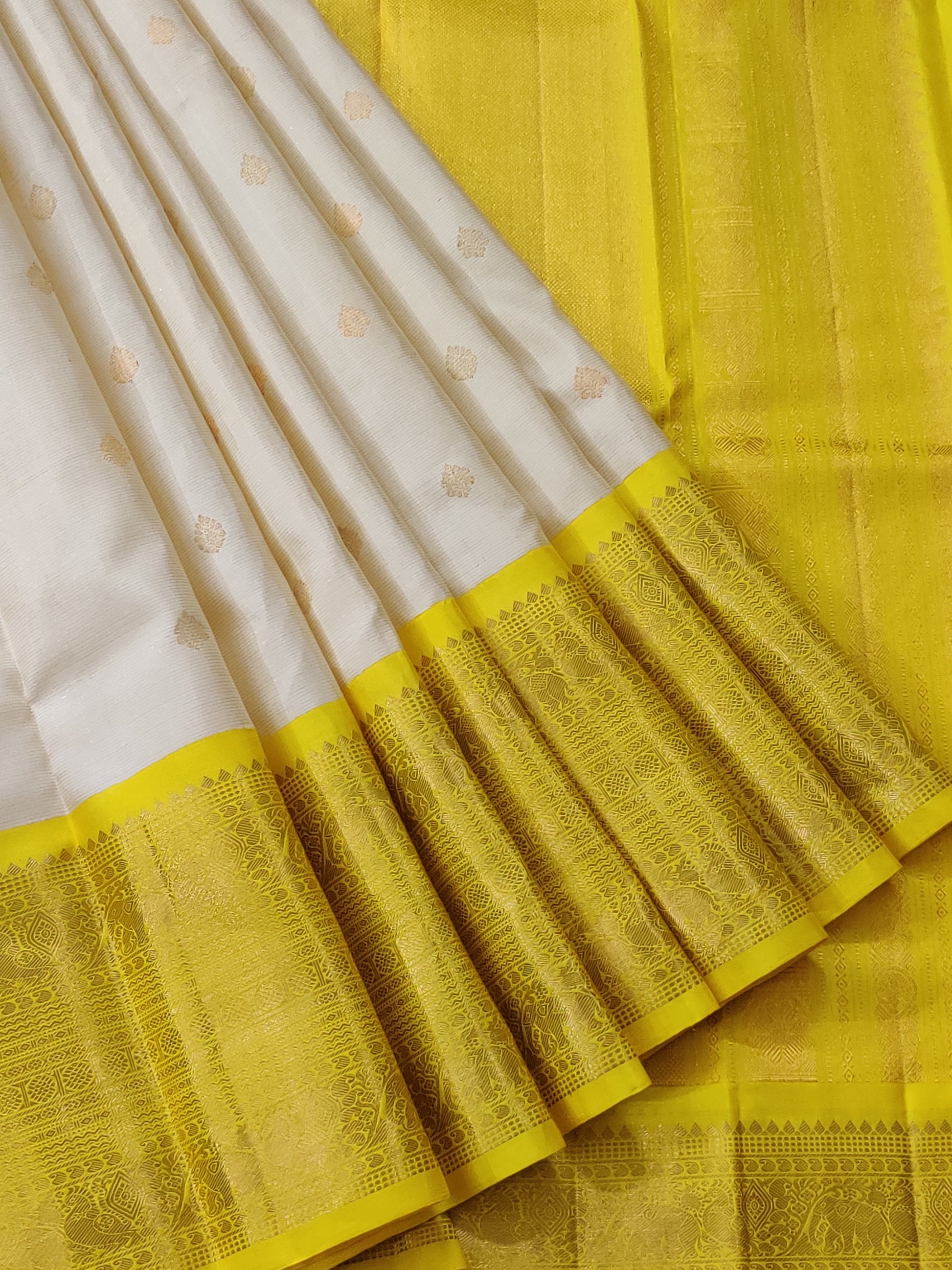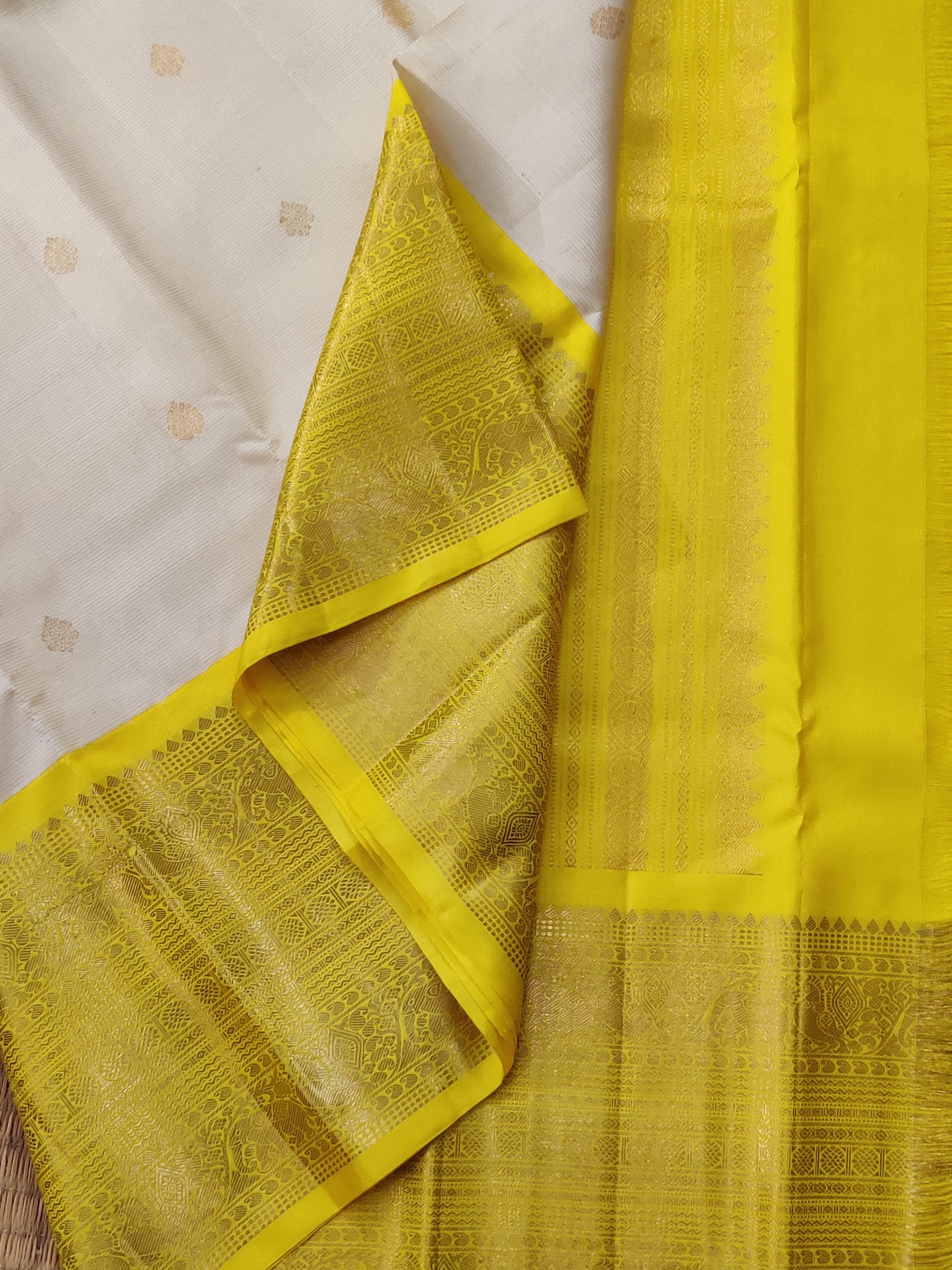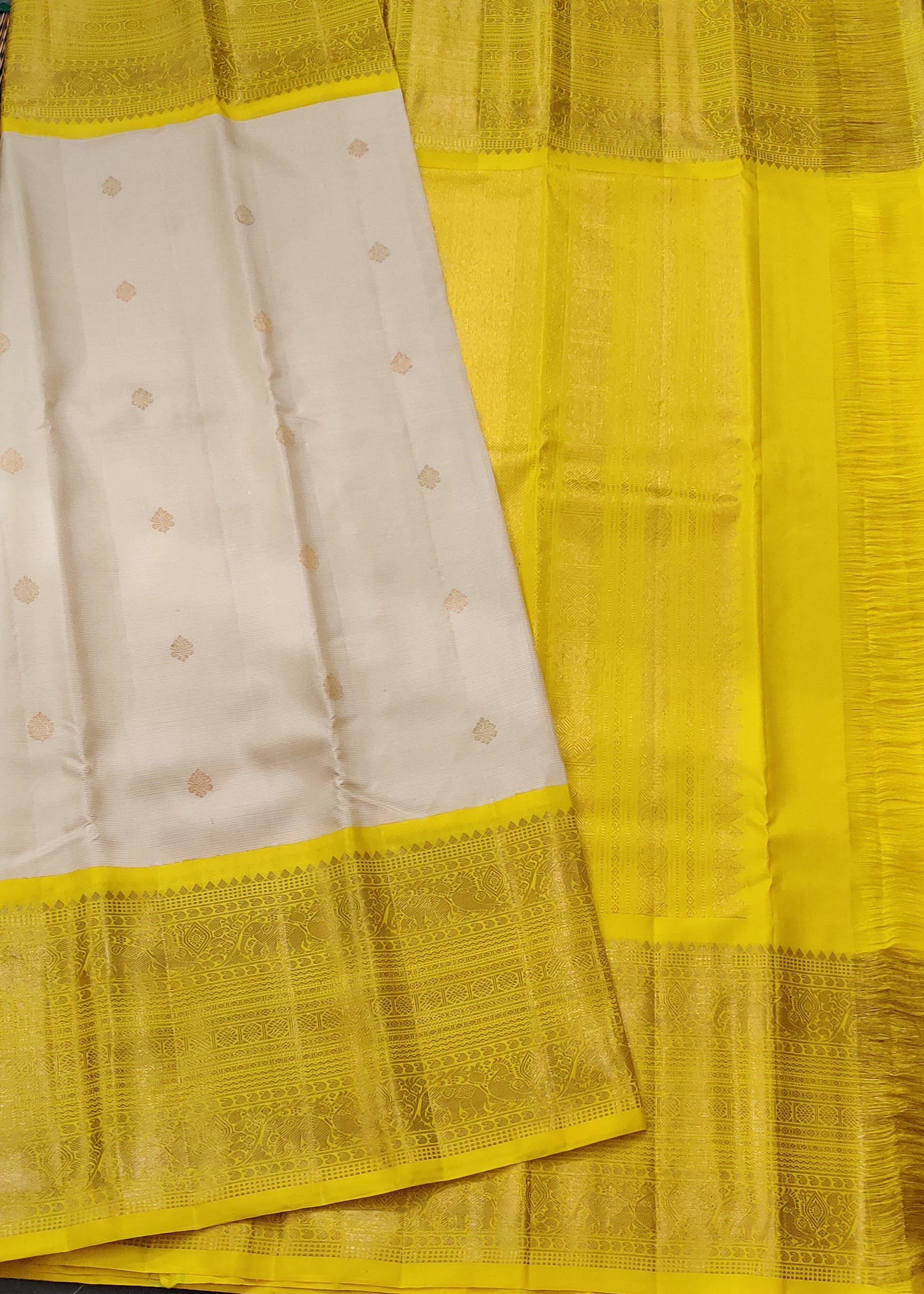 This off-white Kanchivaram silk saree features intricate zari buttas spread elegantly across its body, complemented by a striking lemon yellow zari border and pallu. The contrast enhances the saree’s traditional charm while the plain blouse allows the rich craftsmanship to take center stage. A timeless choice for sophisticated occasions, this saree exemplifies expert weaving and refined elegance.