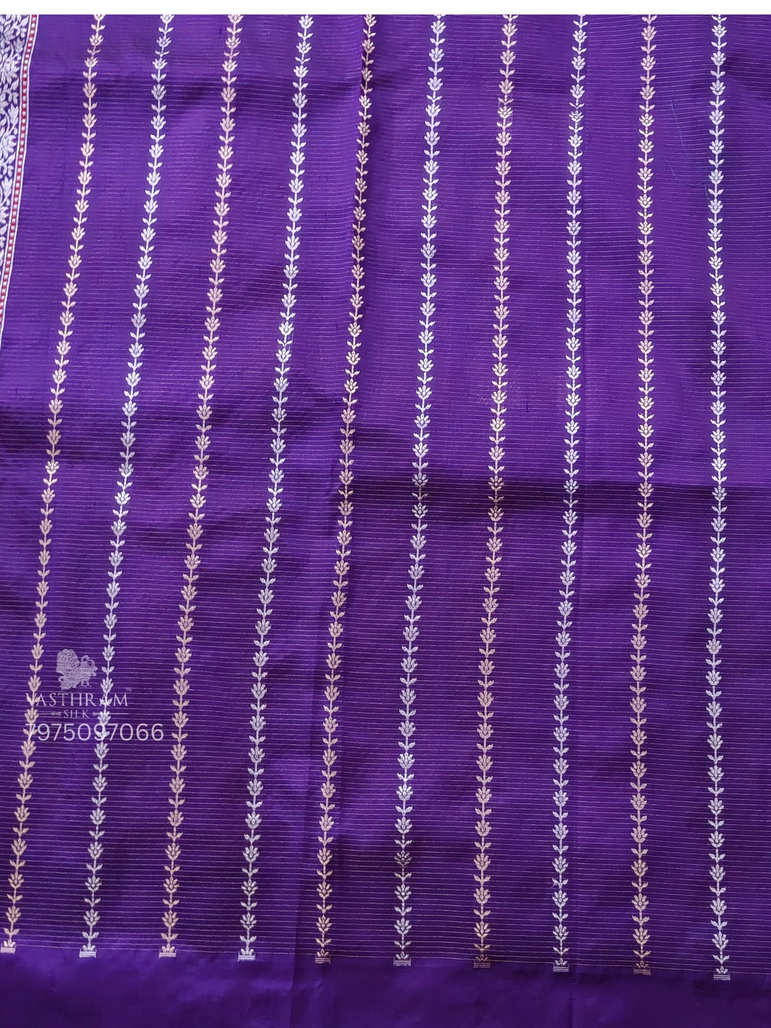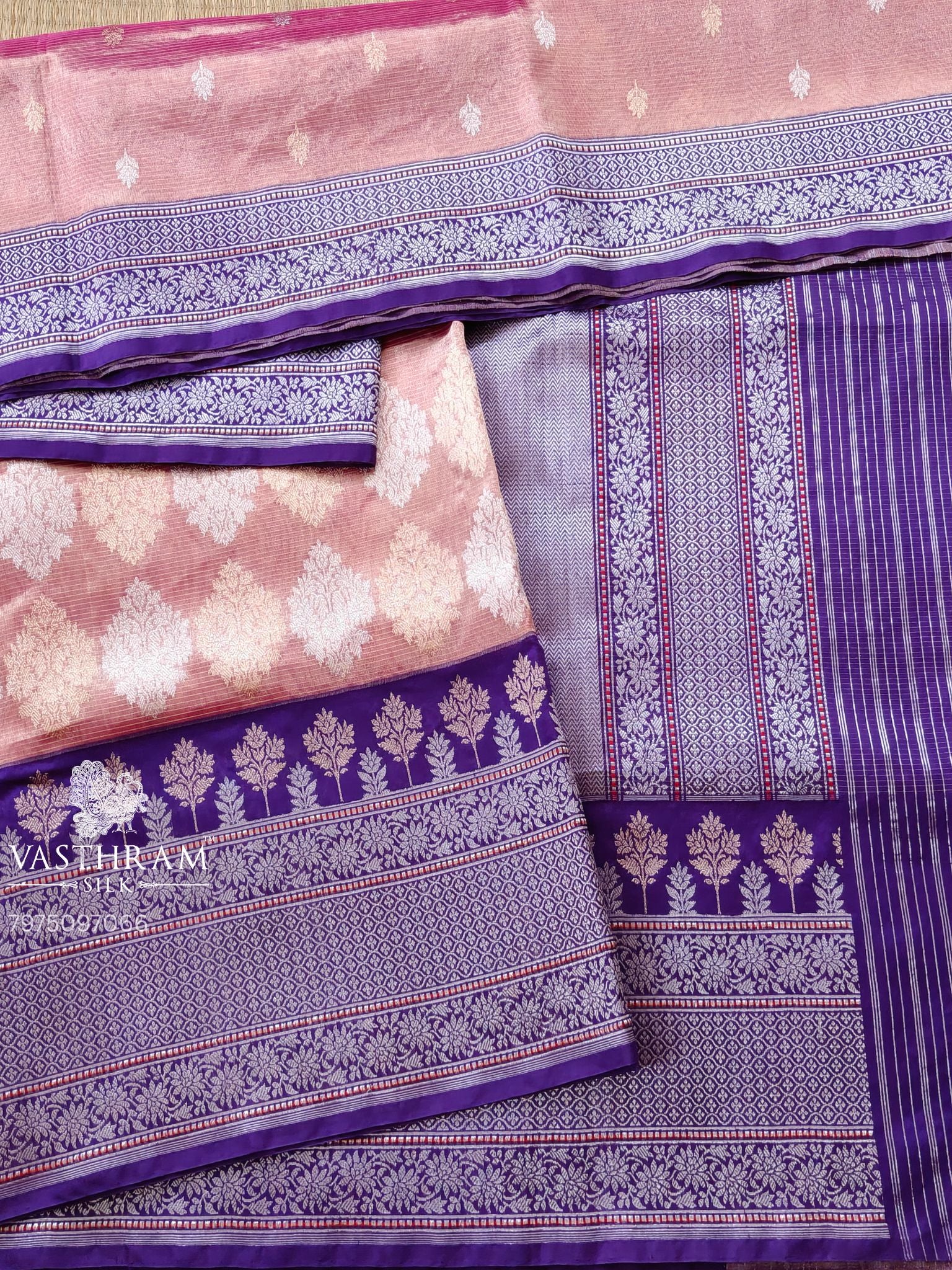 Elevate your ethnic wardrobe with this exquisite onion pink tissue Banarasi saree, a masterpiece of traditional craftsmanship. Adorned with intricate silver and gold zari motifs scattered throughout the fabric, this saree showcases the timeless elegance Banarasi weaving is renowned for. The striking purple zari border and ornate zari pallu add depth and sophistication, while the coordinating zari-striped blouse completes the ensemble seamlessly. Crafted from delicate tissue material, this saree drapes gracefully while maintaining its structured beauty. Perfect for weddings, festivals, and special occasions, this piece combines heritage artistry with refined aesthetics.