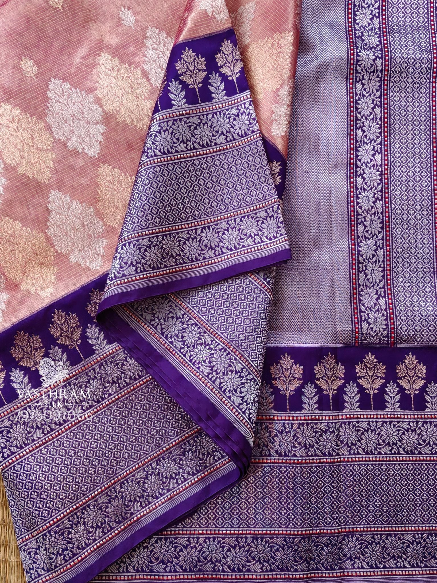 Onion Pink Colour Tissue Banarasi Saree With Silver & Gold Zari Motif All Over Code : VB0470