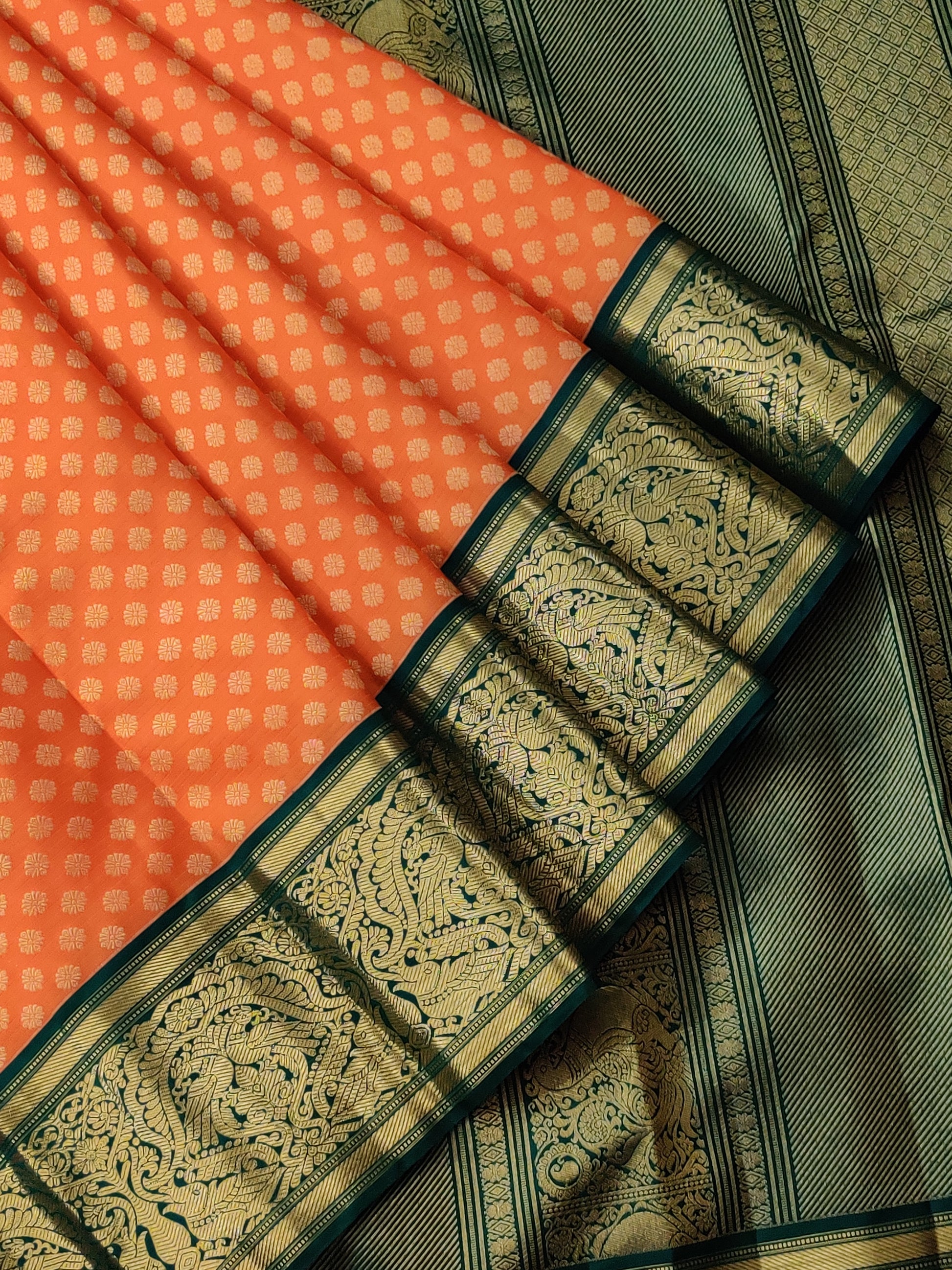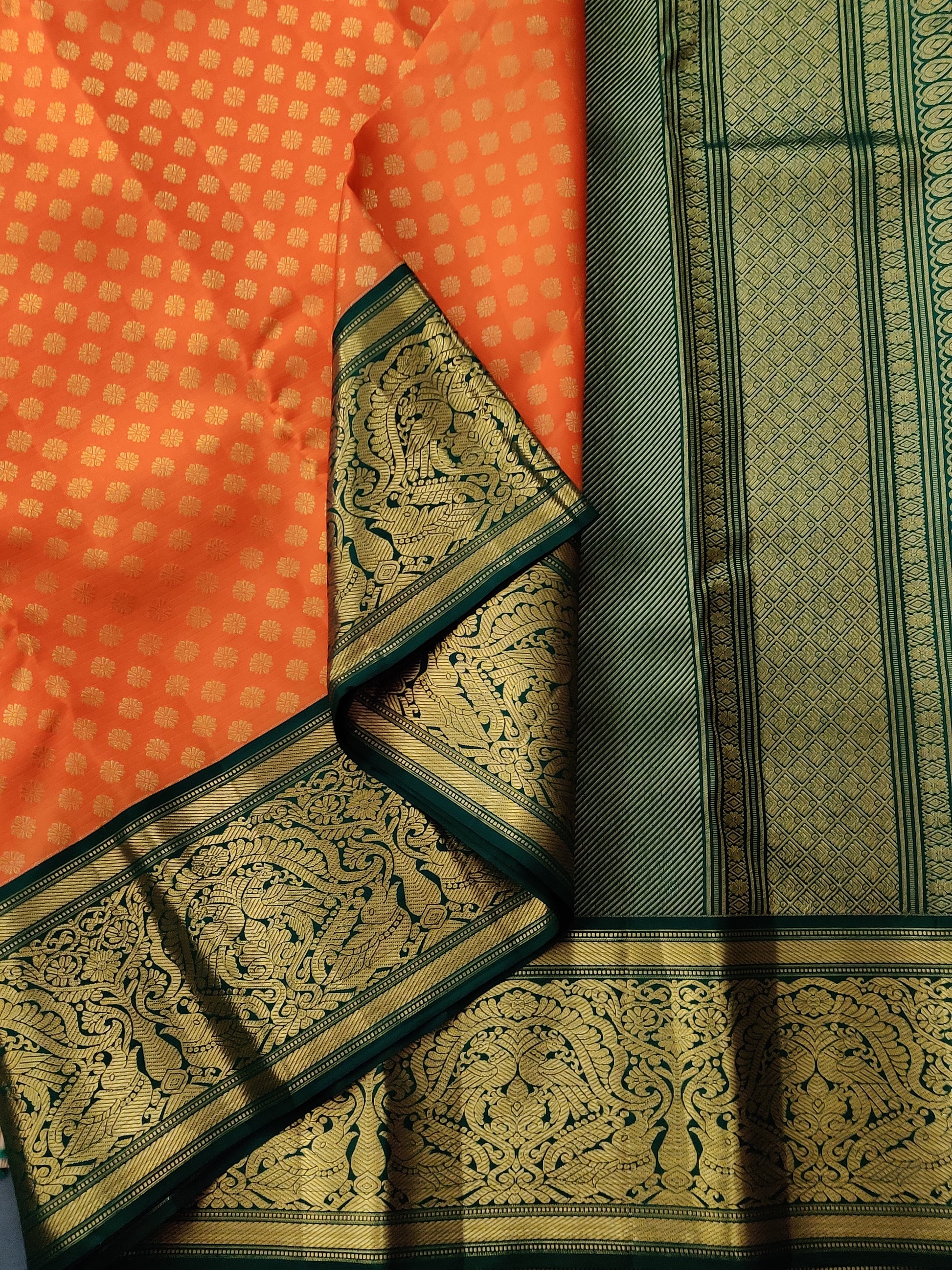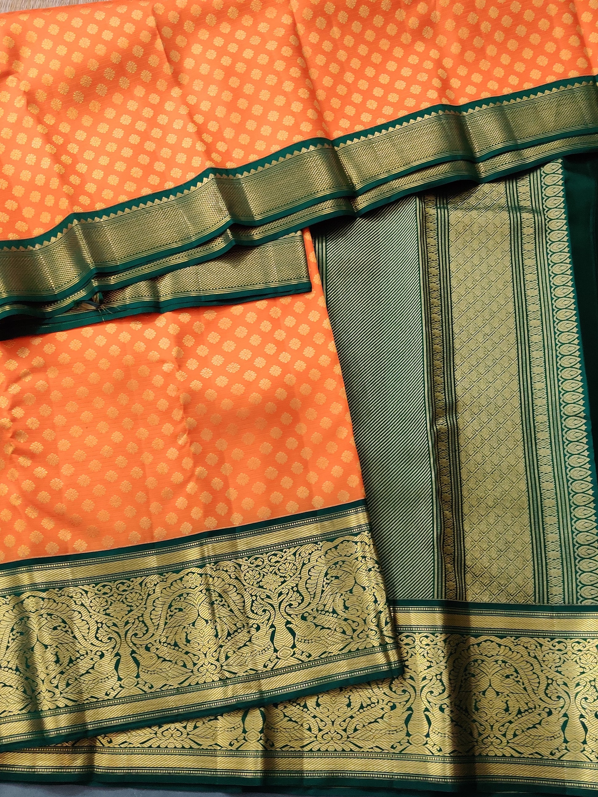 This exquisite orange Kanchivaram silk saree features intricate zari buttas spread elegantly across the fabric, enhancing its traditional charm. The contrasting green zari border adds a striking touch, while the rich zari pallu completes the look with opulent detail. Paired with a plain blouse, this saree offers a perfect blend of classic sophistication and vibrant appeal, ideal for festive or special occasions.