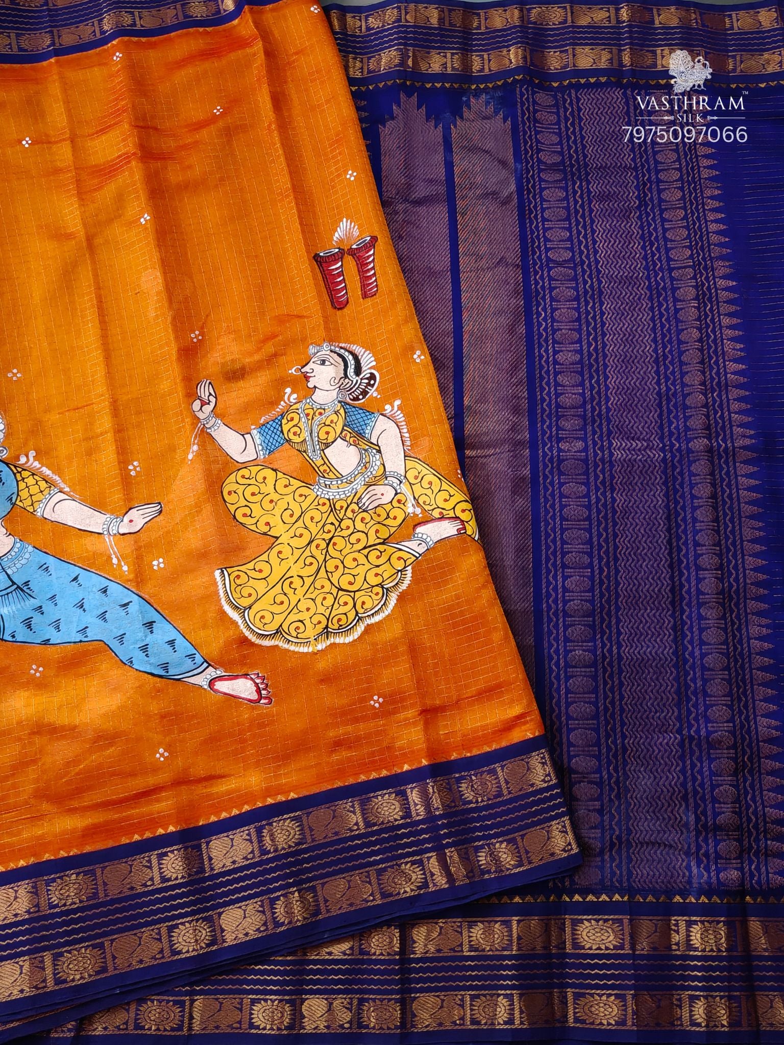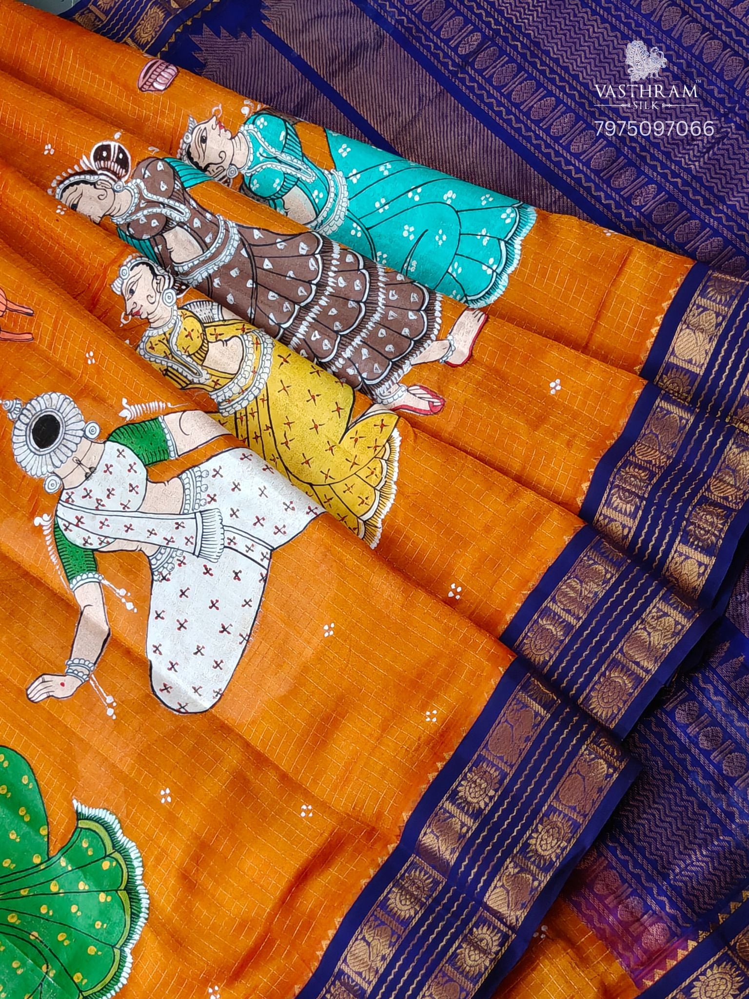 Orange Colour Silk Cotton Saree With Zari Checks & Pattachitra Hand Painting All Over Code : SC027