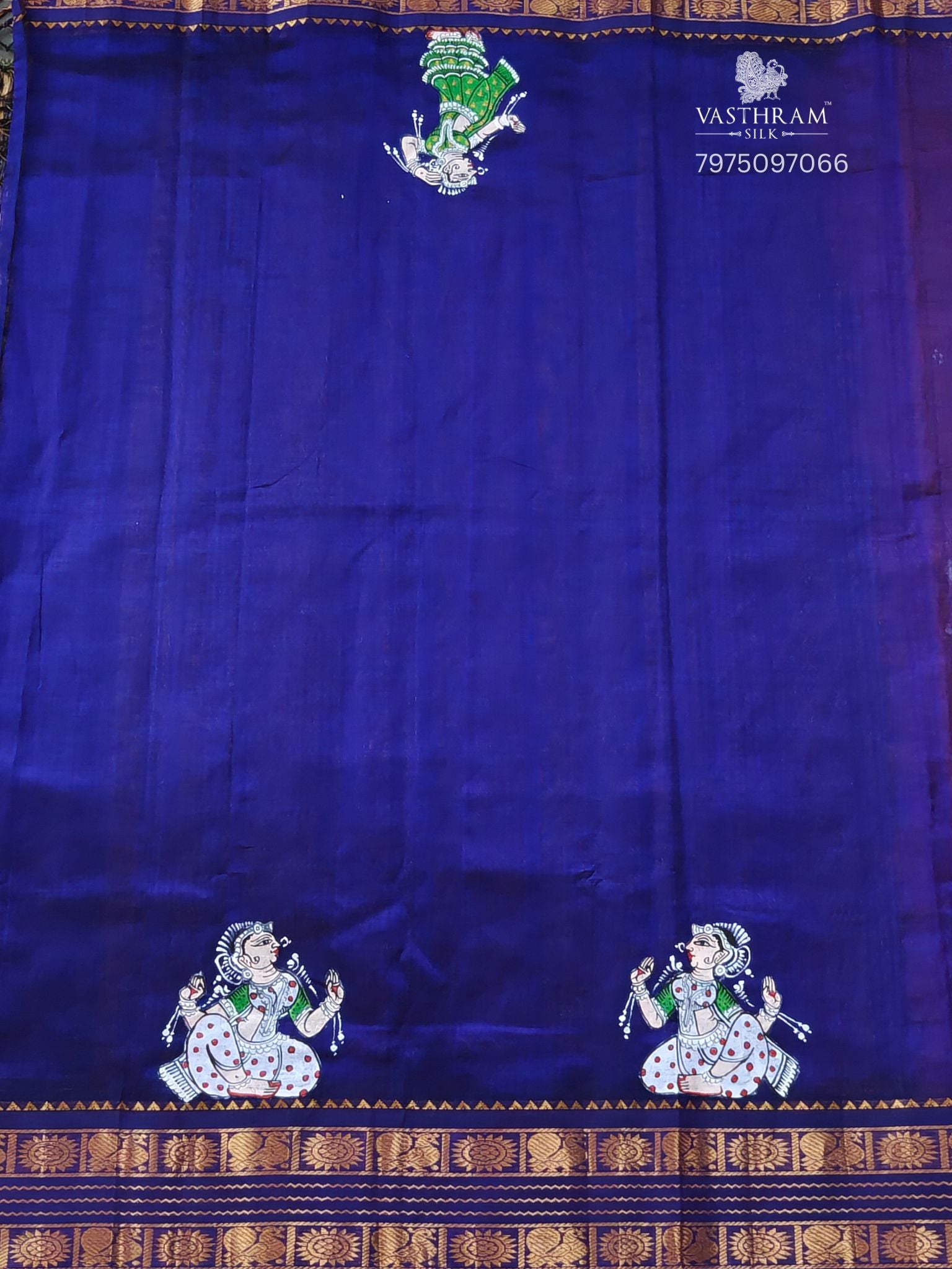 Elevate your ethnic wardrobe with this stunning orange silk cotton saree, meticulously crafted with traditional artistry. Featuring intricate zari checks and authentic pattachitra hand paintings that grace the entire fabric, this saree showcases the rich heritage of Indian textile craftsmanship. The elegant contrast blue zari border and ornate zari pallu add a regal touch, while the coordinating blue blouse completes the ensemble perfectly. Ideal for festive occasions, celebrations, and special events, this saree blends comfort with timeless elegance.