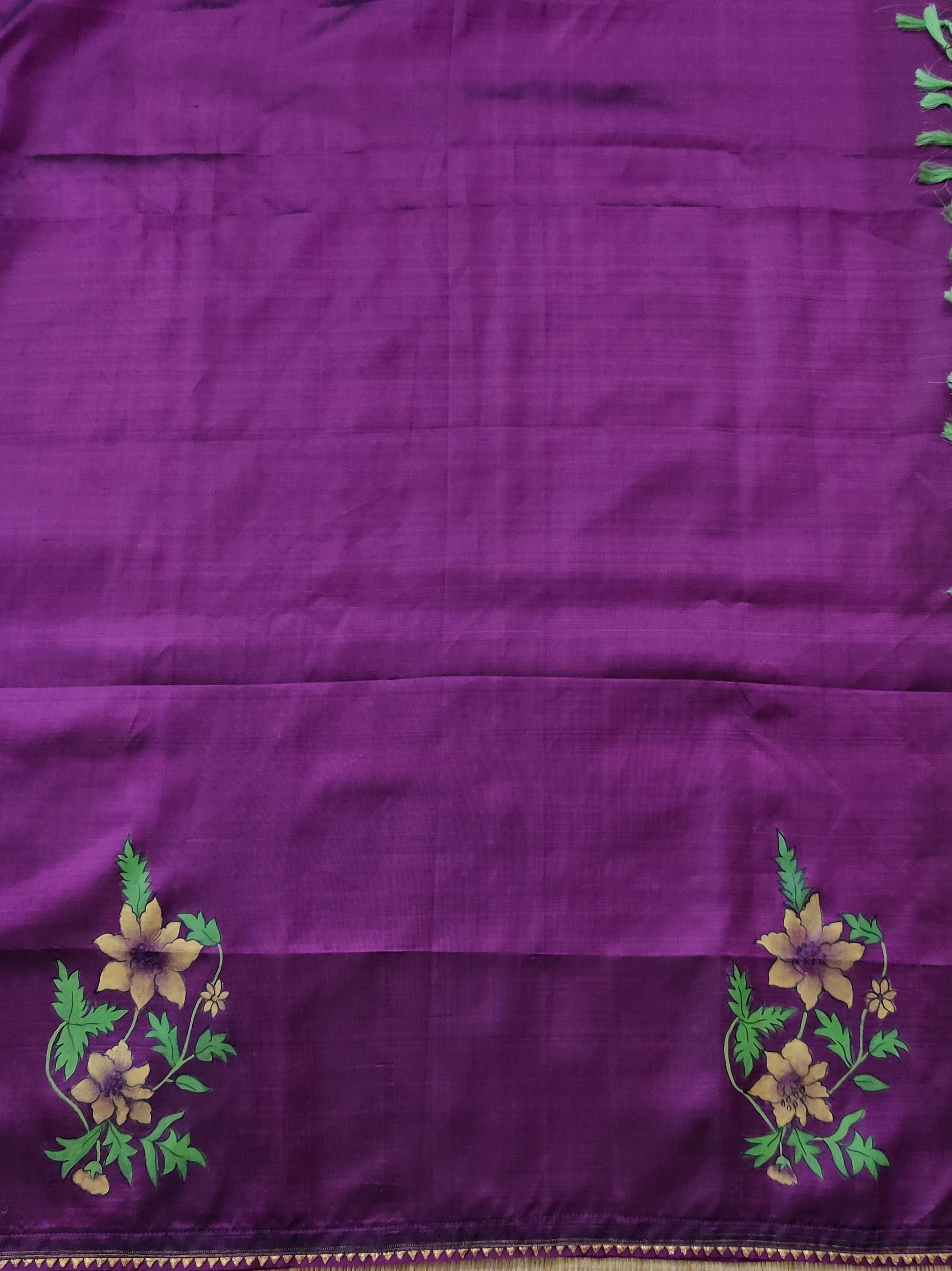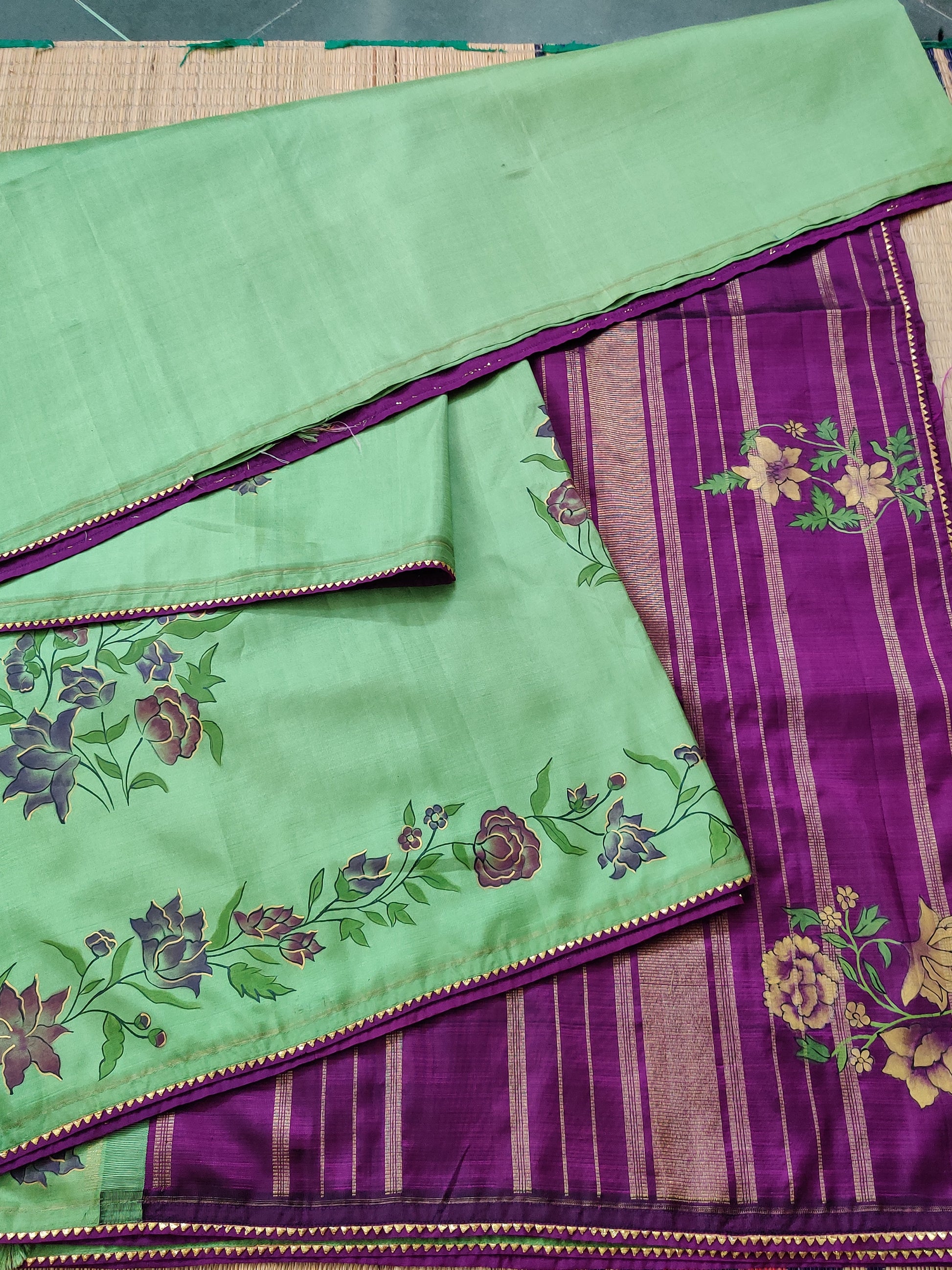 This exquisite pastel green Kanchivaram silk saree features a borderless design, enhanced by intricate hand-painted motifs throughout the fabric. The magenta zari pallu, adorned with complementary hand painting, adds a striking contrast that elevates its elegance. Accompanied by a plain blouse embellished with matching painting, this saree blends traditional craftsmanship with artistic finesse, making it a refined choice for special occasions.