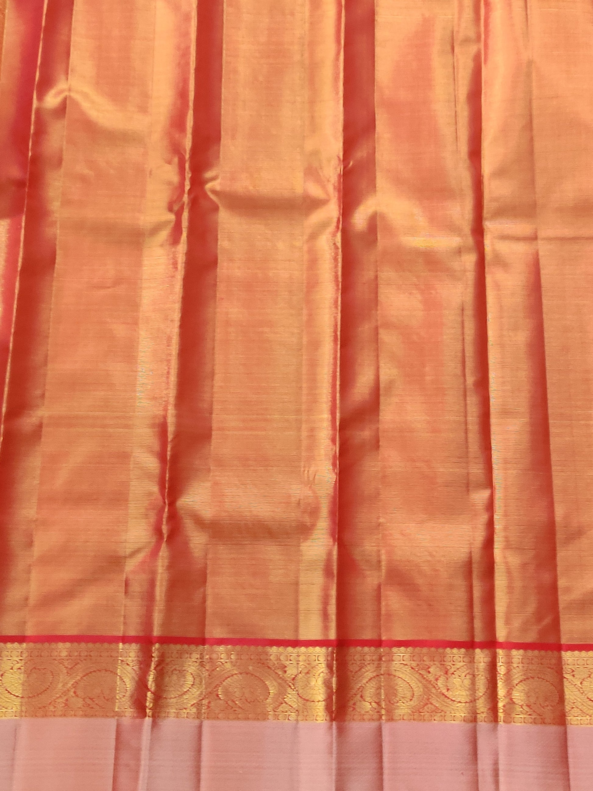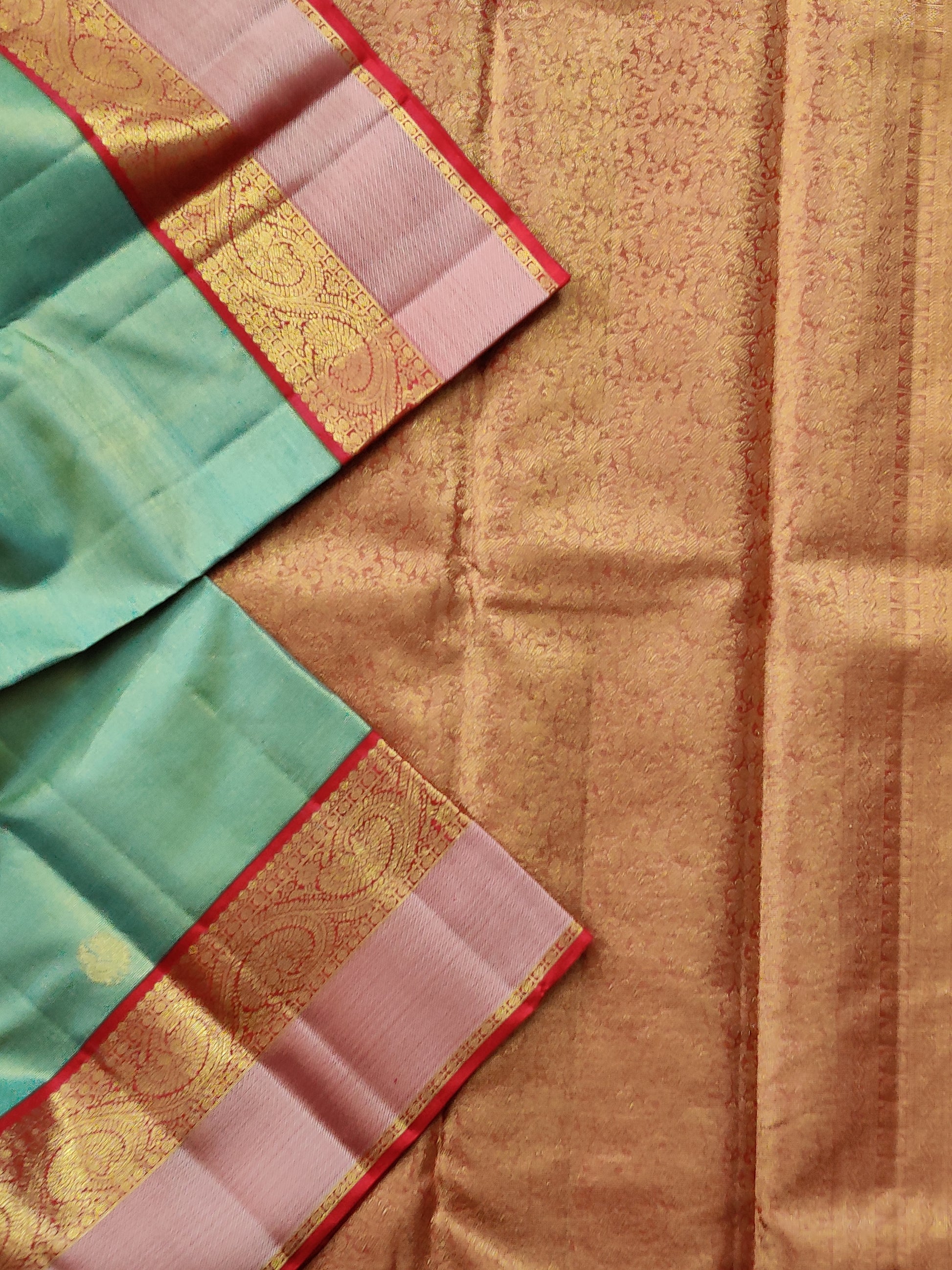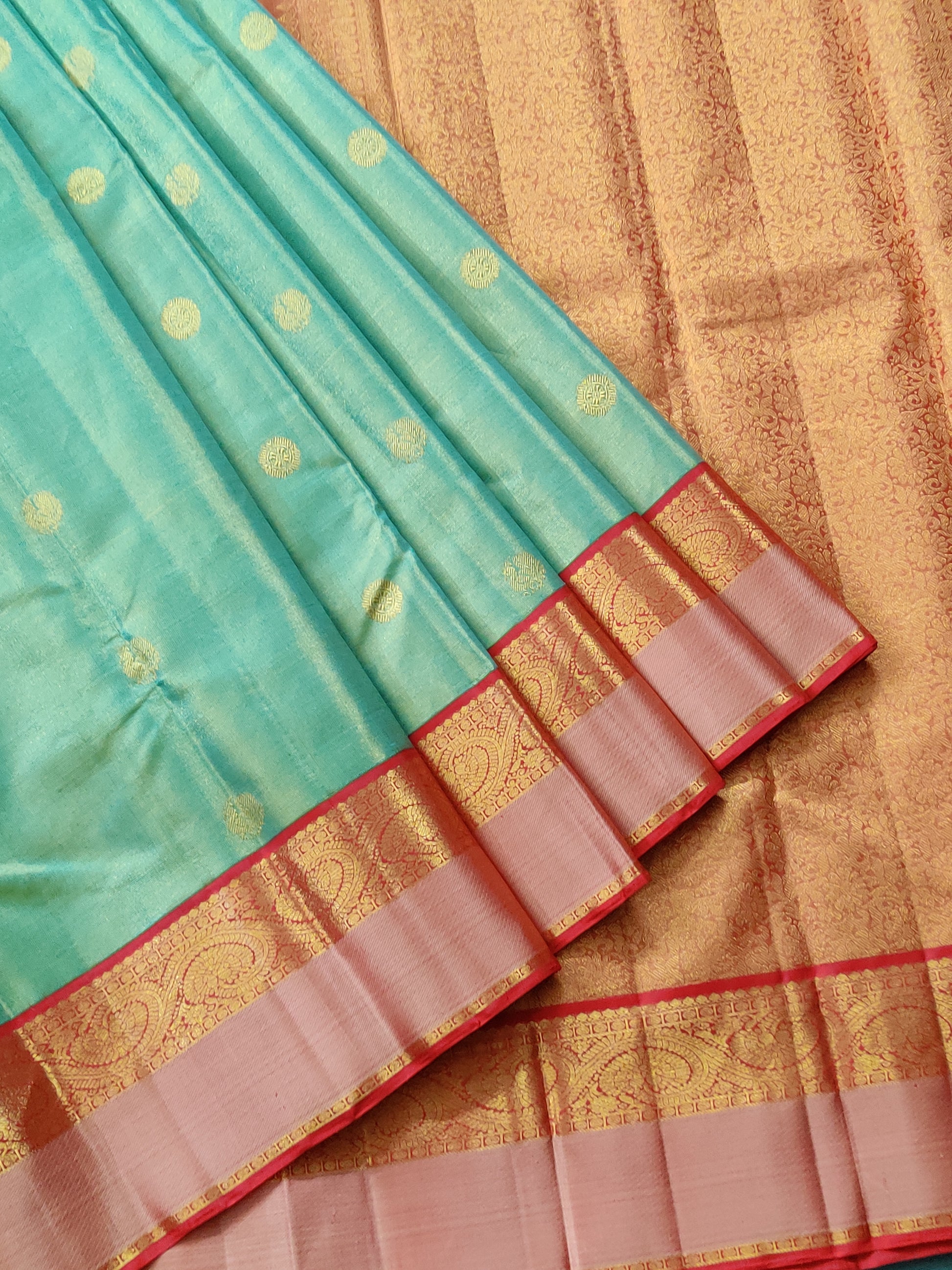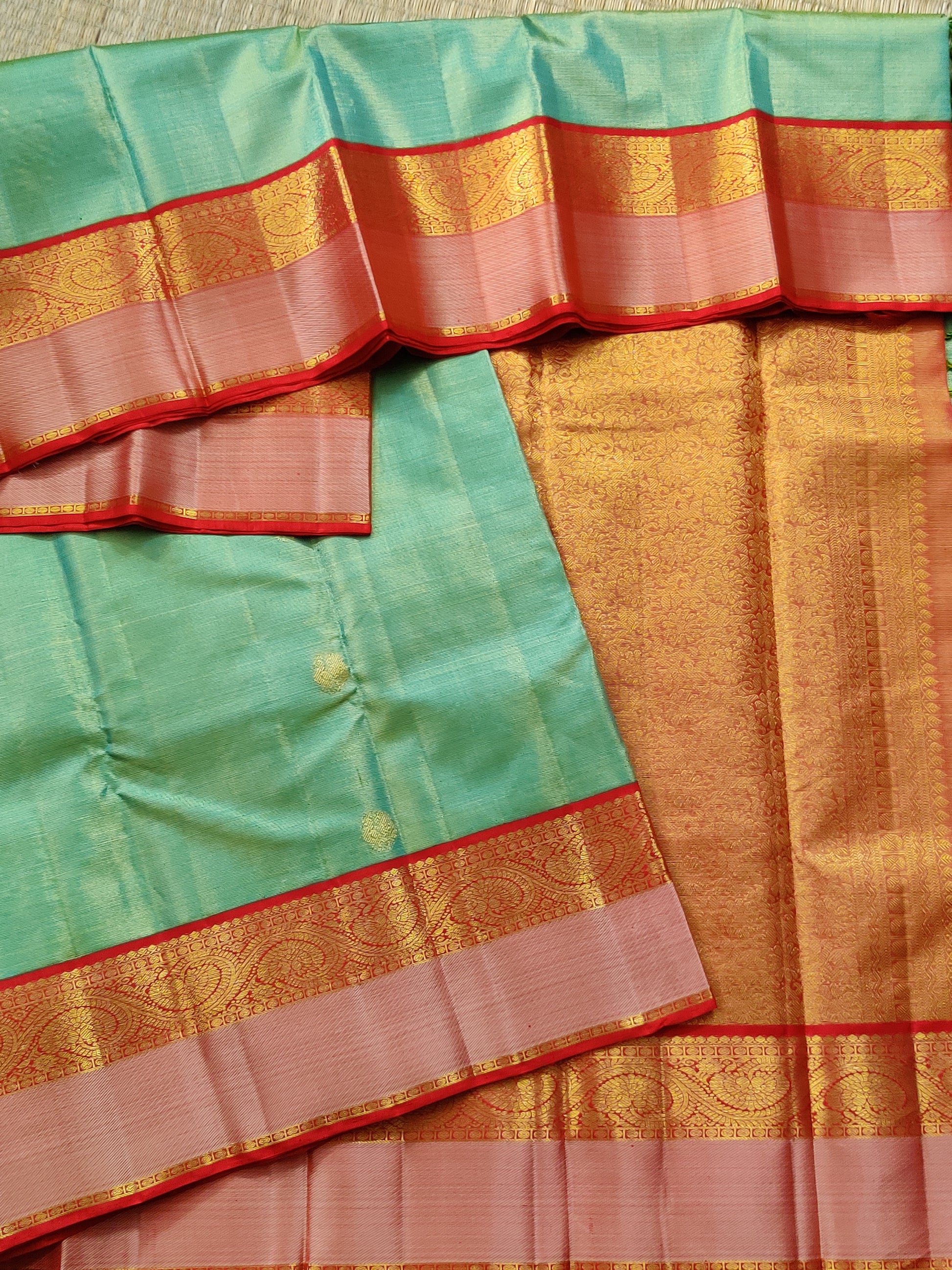 Elevate your ethnic wardrobe with this exquisite pastel green tissue Kanchivaram silk saree, a masterpiece of traditional South Indian weaving. The entire body features delicate zari buttas scattered across the fabric, creating an intricate and refined aesthetic. A striking contrast red zari border frames the saree beautifully, while the matching zari pallu adds grandeur and sophistication. Crafted from premium tissue silk, this saree offers a lightweight yet luxurious drape, perfect for weddings, festivals, and special occasions. The accompanying plain blouse allows for versatile styling options. An investment piece that seamlessly blends heritage craftsmanship with contemporary elegance.