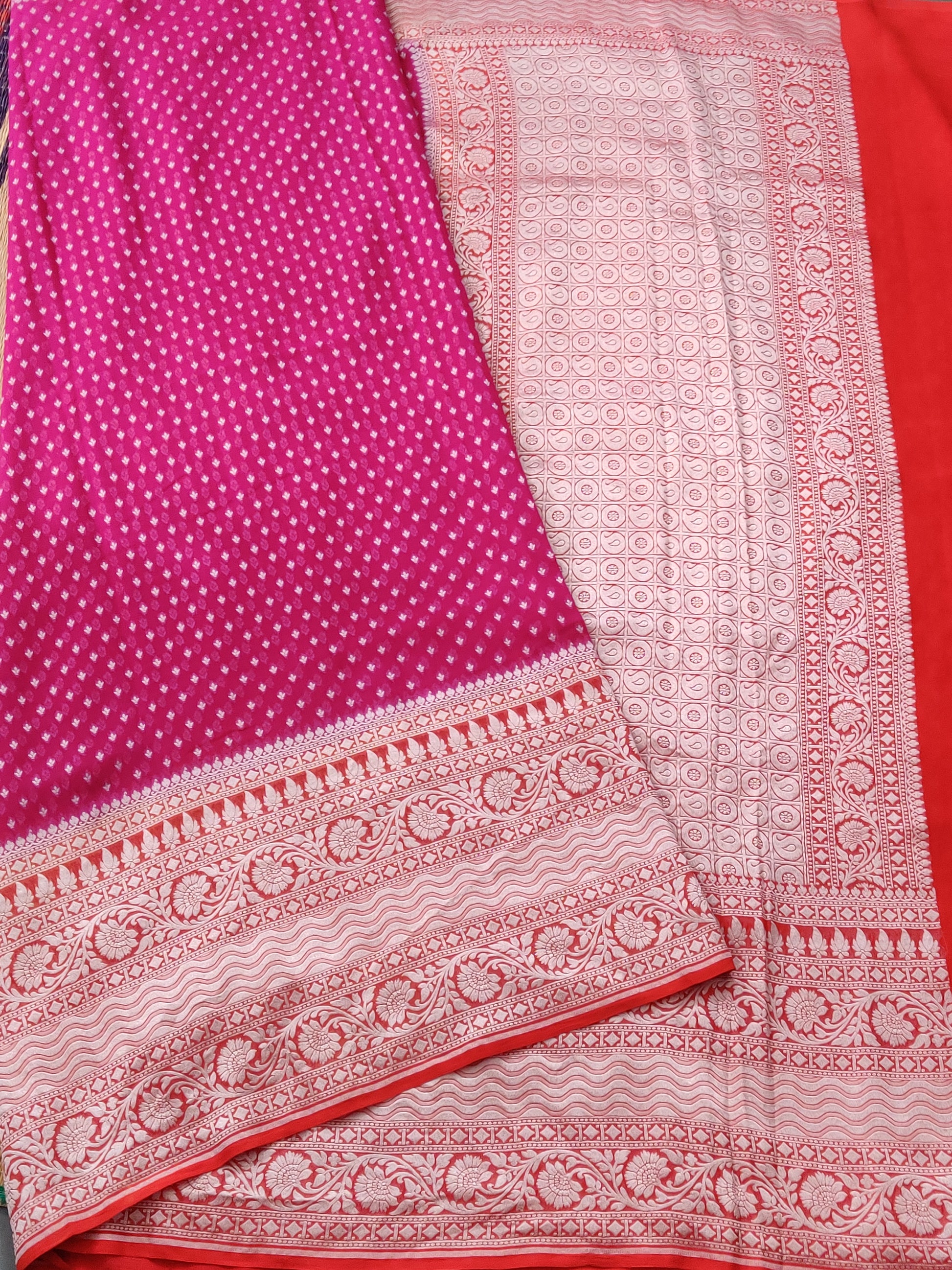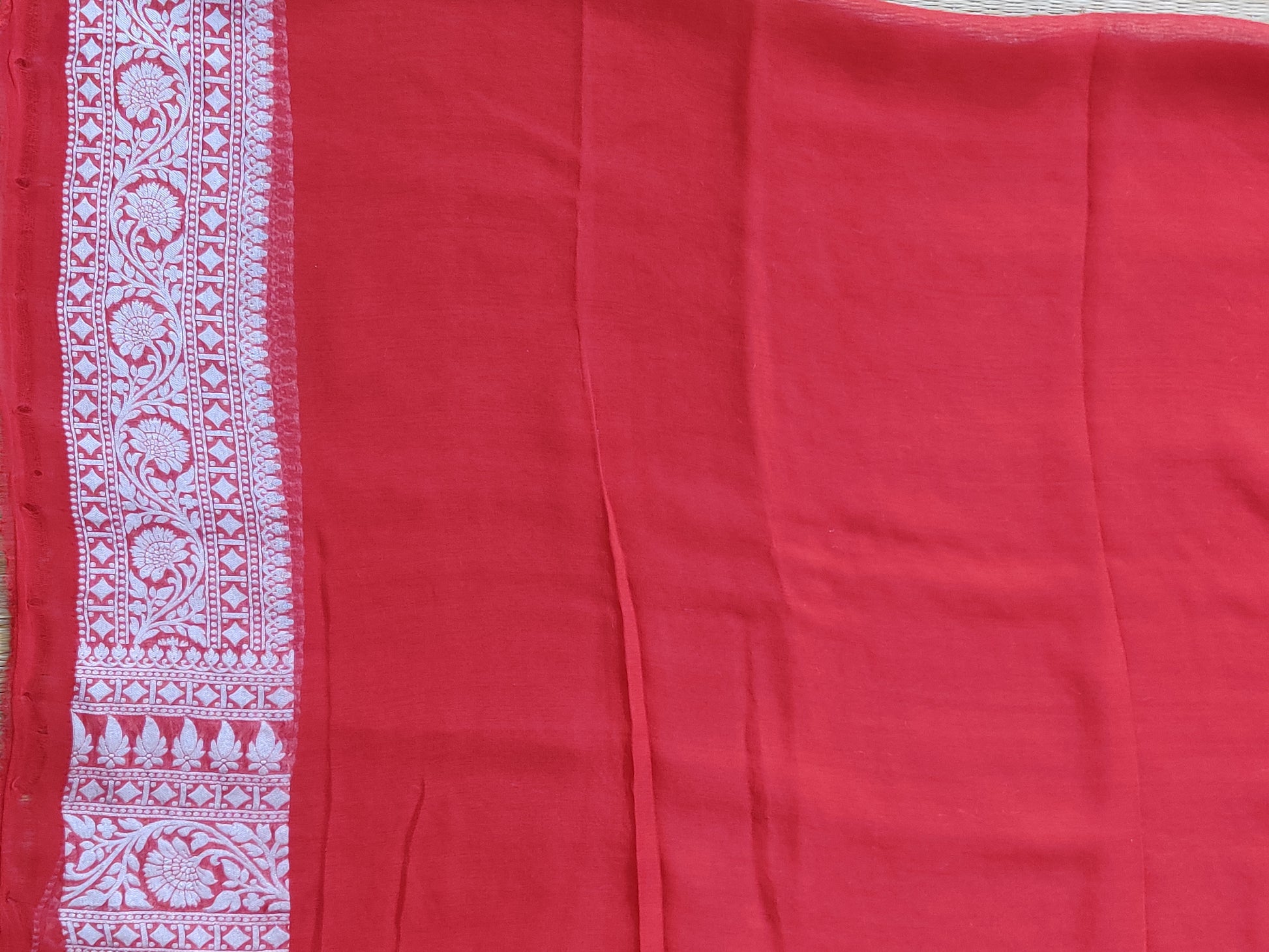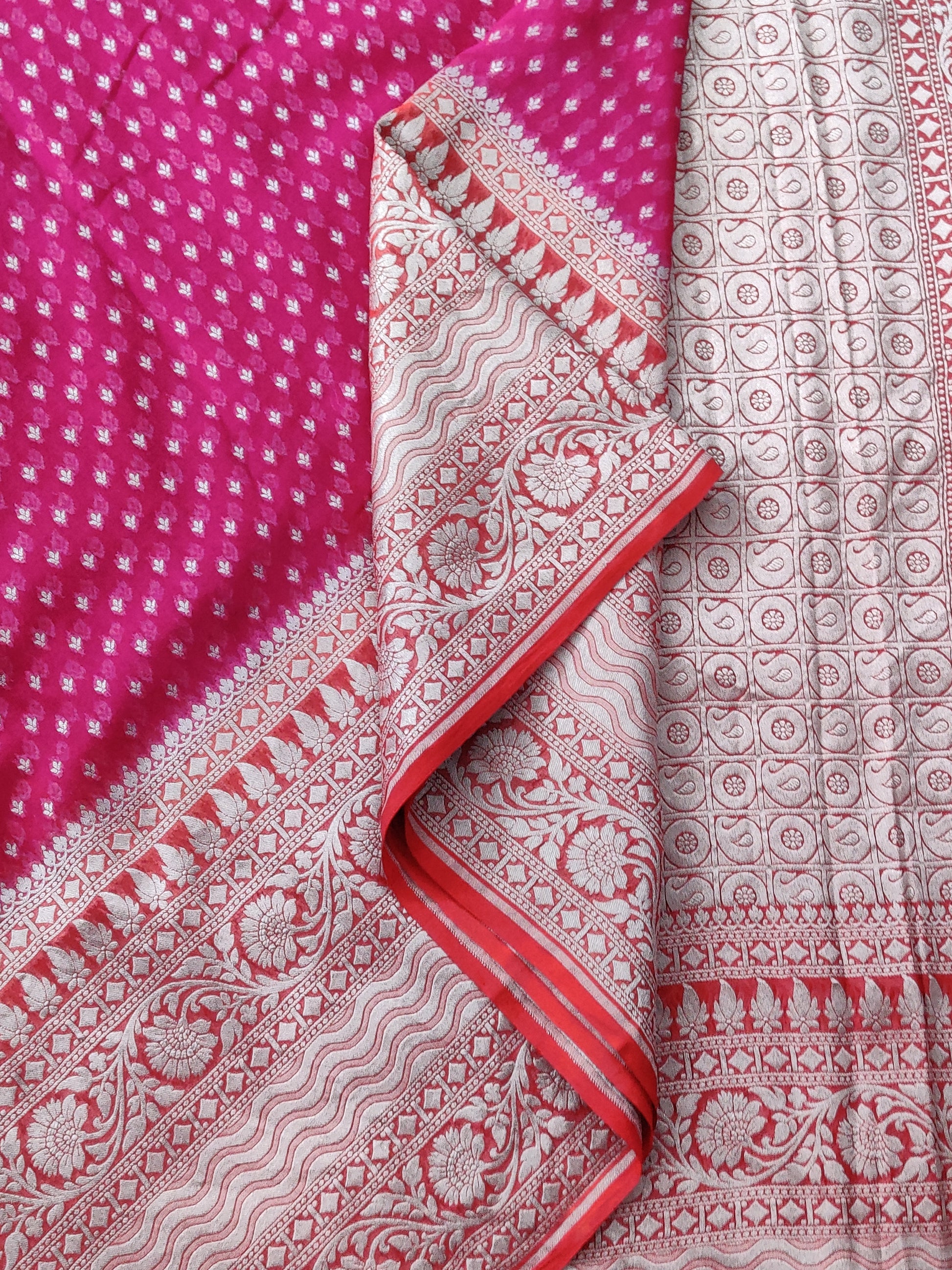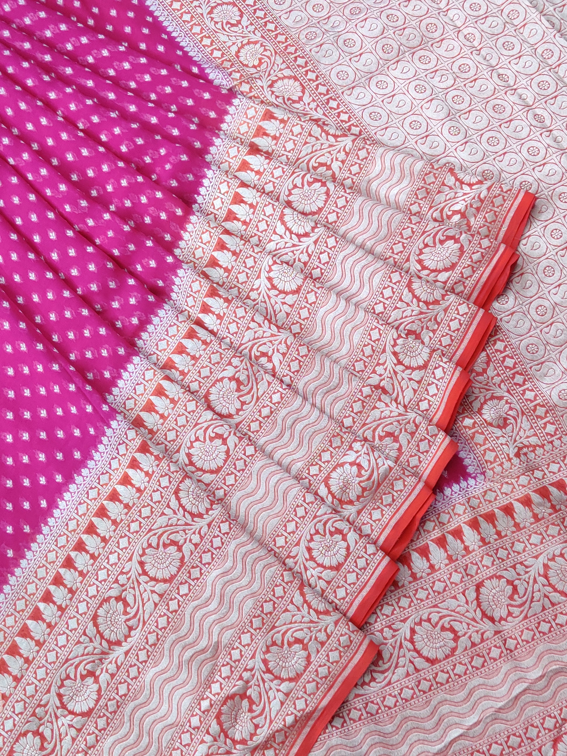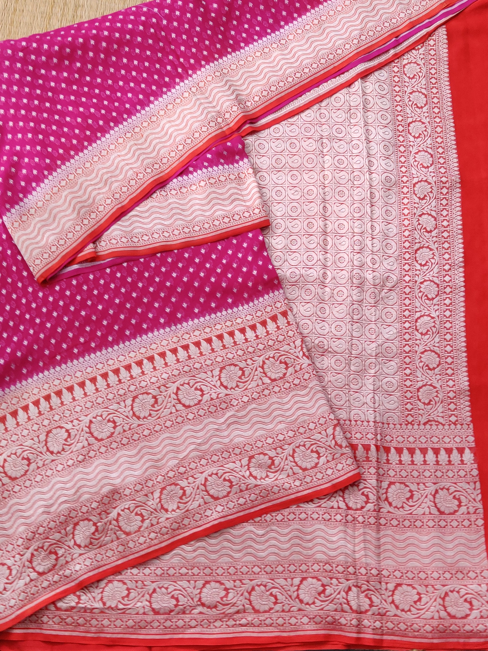 This elegant pink georgette saree features intricate silver zari buttas spread evenly across the fabric, lending a shimmering texture and refined appeal. The rich contrast of the orange zari border and pallu enhances its traditional charm while maintaining a vibrant sophistication. Accompanied by a plain blouse, this saree balances ornate detailing with understated elegance, making it a perfect choice for formal occasions and cultural events.