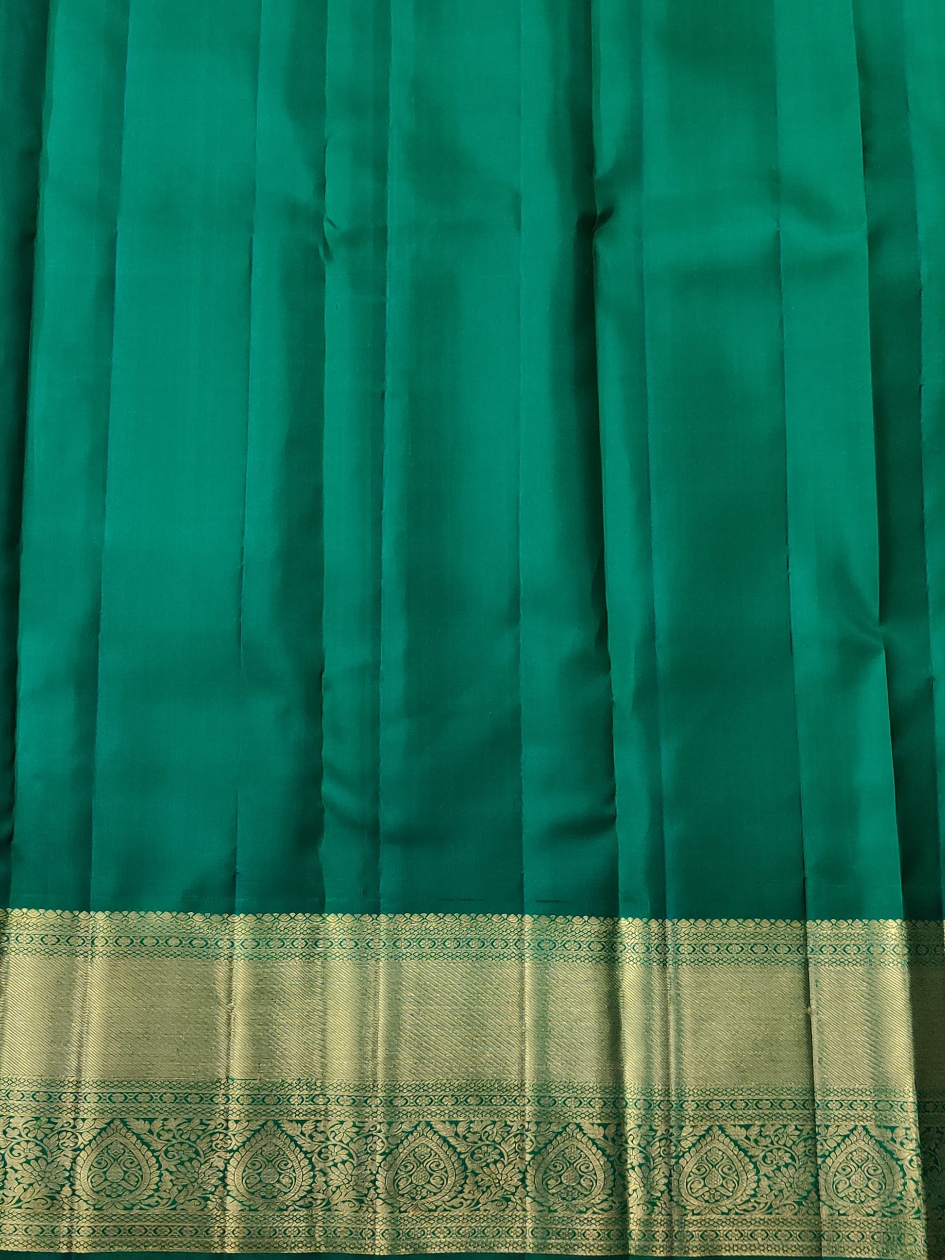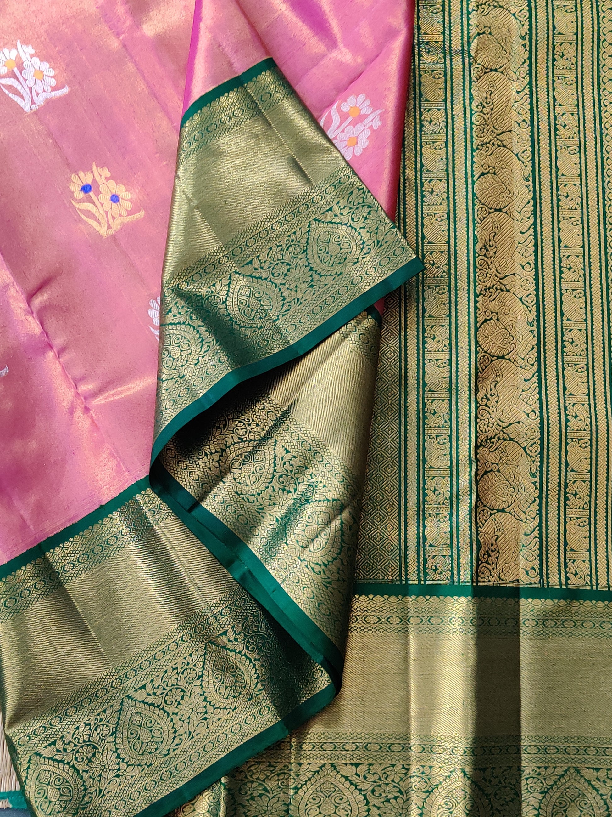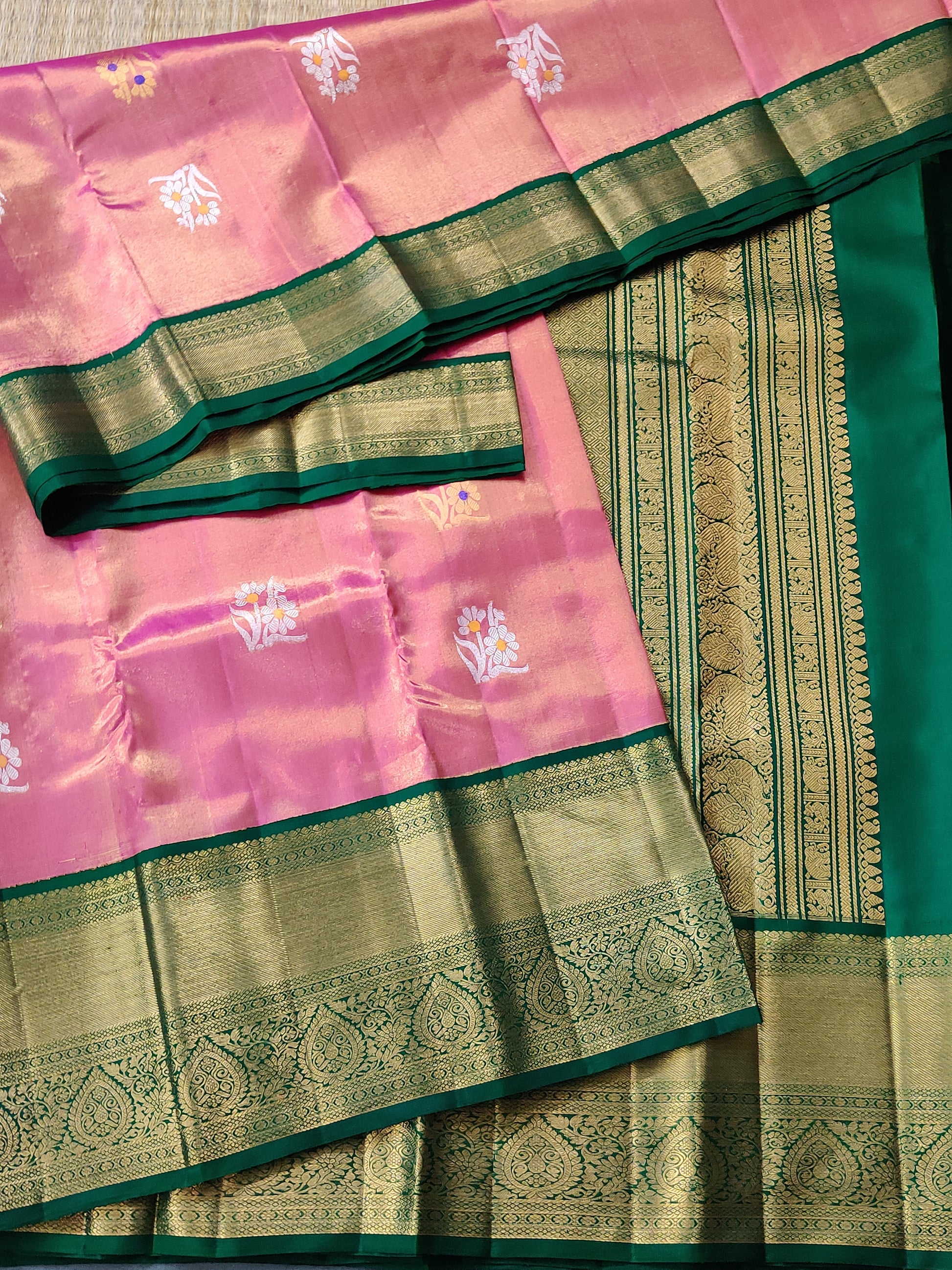 This pink tissue Kanchivaram silk saree showcases exquisite gold and silver zari buttas spread elegantly across the fabric, creating a refined shimmer. The contrasting green zari border enhances its traditional charm, while the rich zari pallu adds a majestic touch, perfect for special occasions. Paired with a plain blouse, this saree balances opulence and simplicity, making it a timeless addition to any collection.