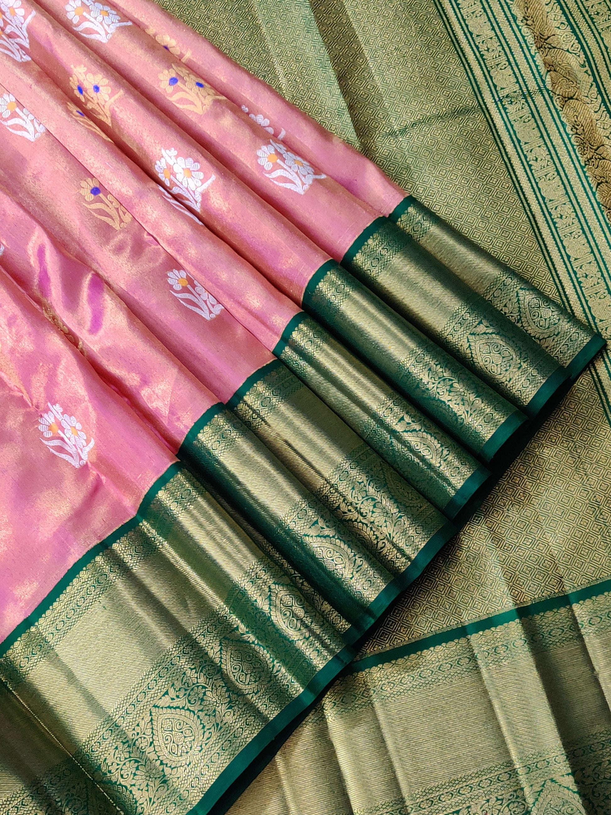 Pink Colour Tissue Kanchivaram Silk Saree With Gold & Silver Zari Butta All Over Code : KA0267