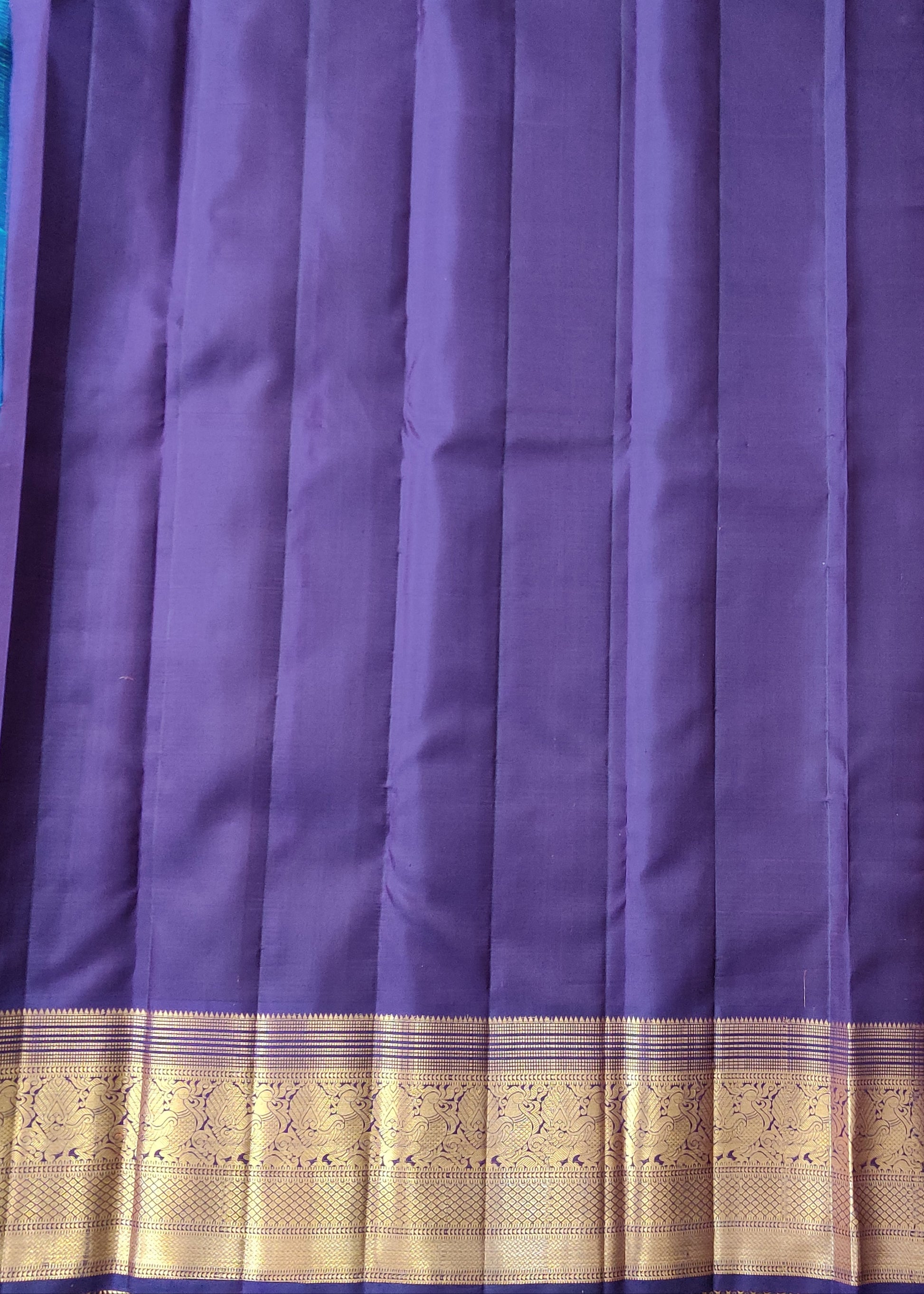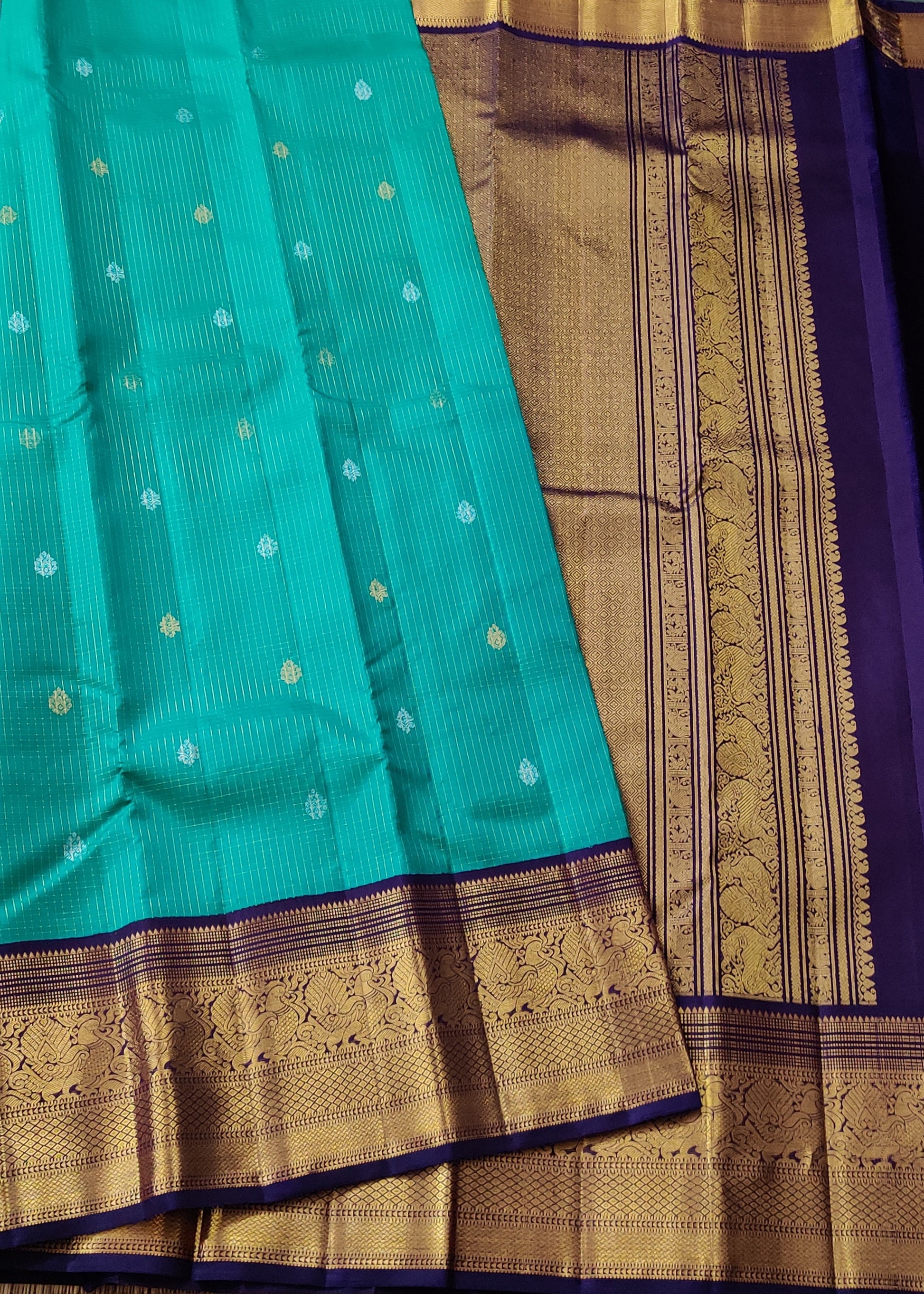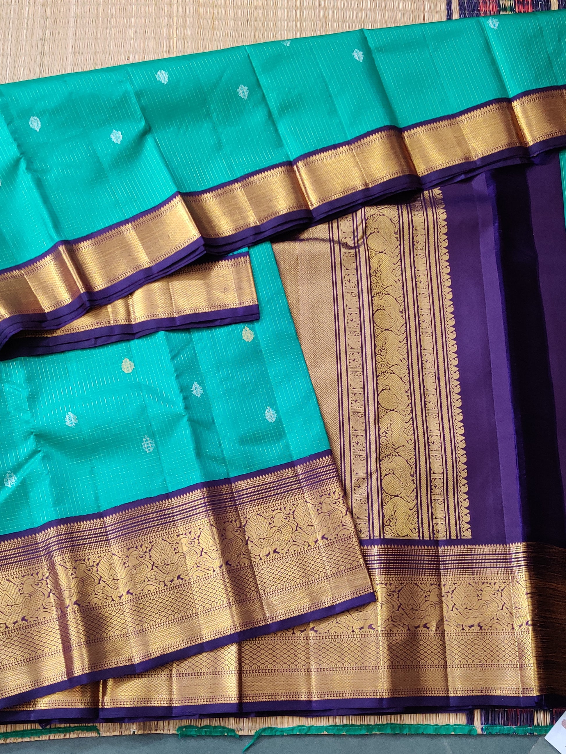 Experience timeless elegance with this Rama green Kanchivaram silk saree. Featuring intricate zari checks and delicate butta patterns throughout, it showcases expert craftsmanship. The contrasting blue zari border and pallu add a striking touch of sophistication, while the accompanying plain blouse offers versatile styling options. Perfect for festive occasions and traditional celebrations, this saree combines rich texture with classic design.