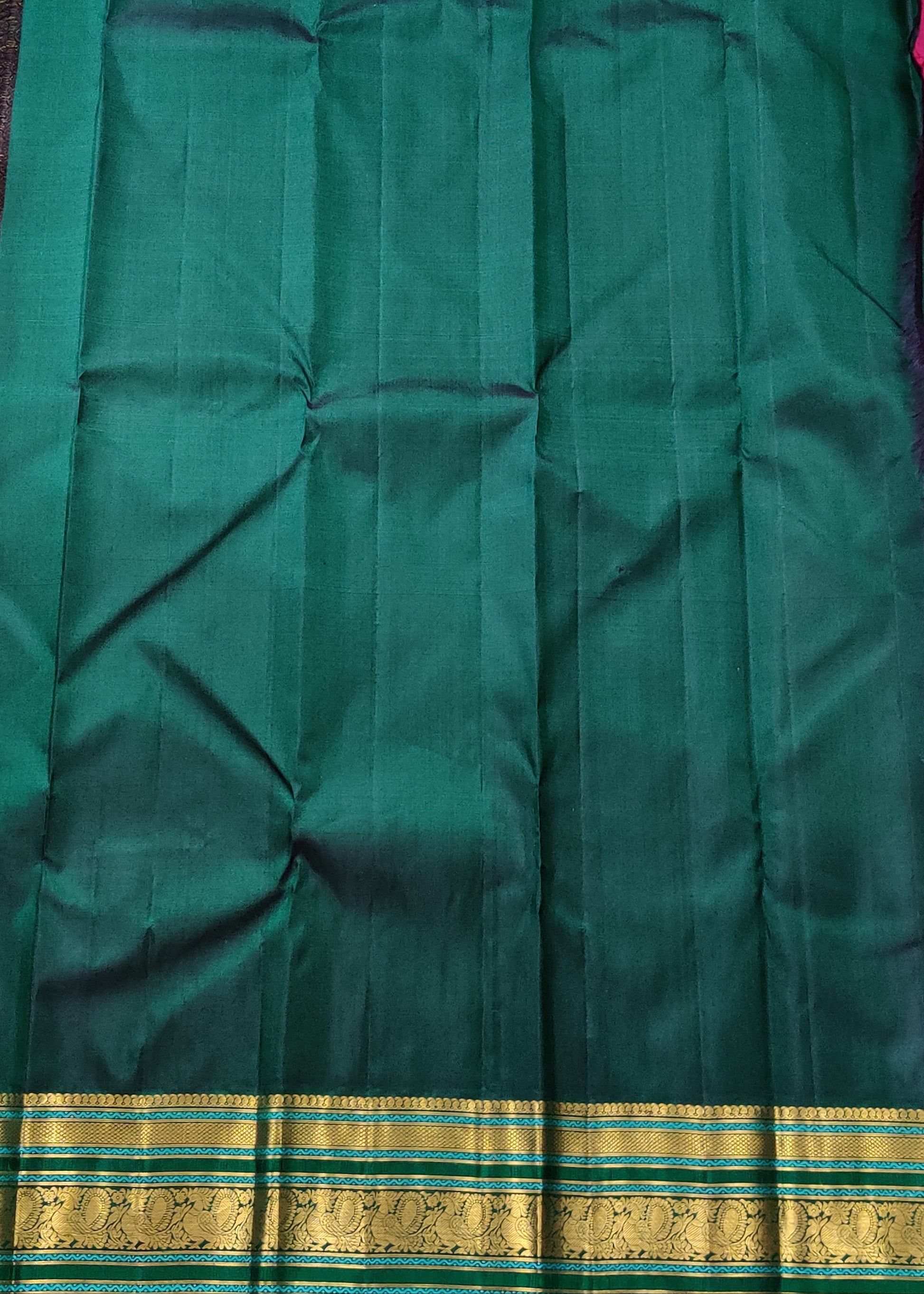 Elevate your ethnic wardrobe with this exquisite Kanchivaram silk saree in rich rani pink. Adorned with delicate peacock zari buttas scattered throughout, this traditional weave showcases the finest craftsmanship. The striking contrast green zari pallu and matching zari border add a sophisticated dimension to the ensemble. Paired with a plain blouse, this saree offers versatility for both festive occasions and celebrations. The lustrous silk fabric drapes beautifully, ensuring comfort and elegance with every wear. A timeless investment piece that honors classical South Indian textile heritage.