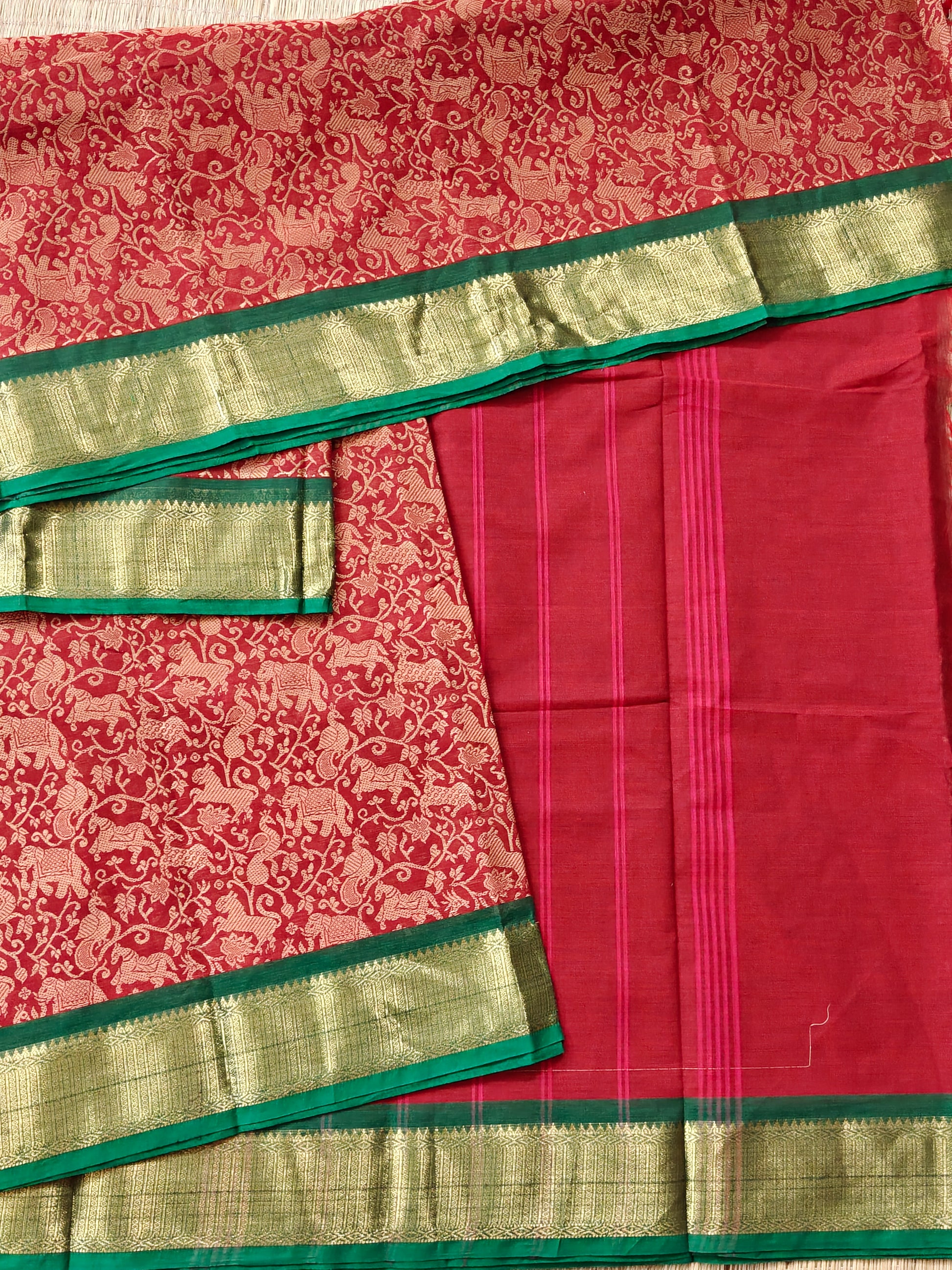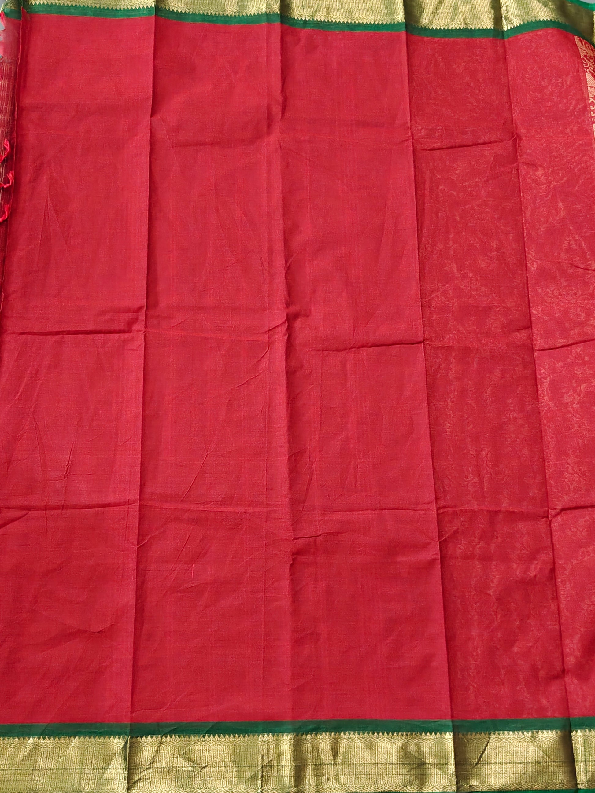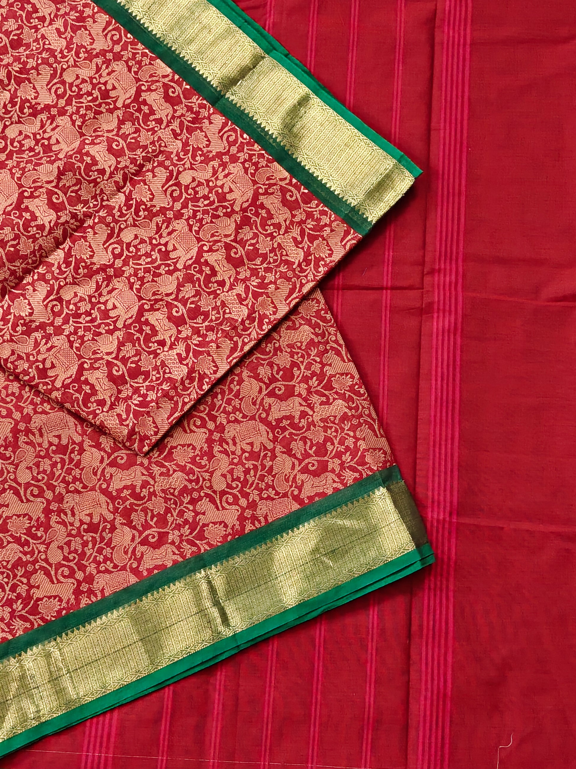 Elevate your ethnic wardrobe with this striking red cotton saree, meticulously crafted with traditional vanasingaram thread woven motifs adorning the entire fabric. The design is beautifully complemented by a contrasting green zari border that adds sophistication and visual depth. The self-colored pallu maintains the saree's cohesive aesthetic, while the included plain blouse offers versatility for styling. Perfect for festive occasions, celebrations, or everyday elegance, this saree combines authentic craftsmanship with timeless appeal.