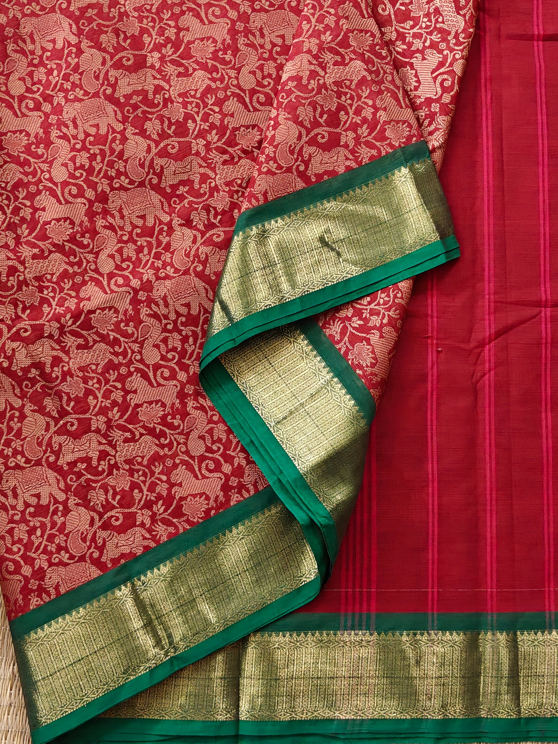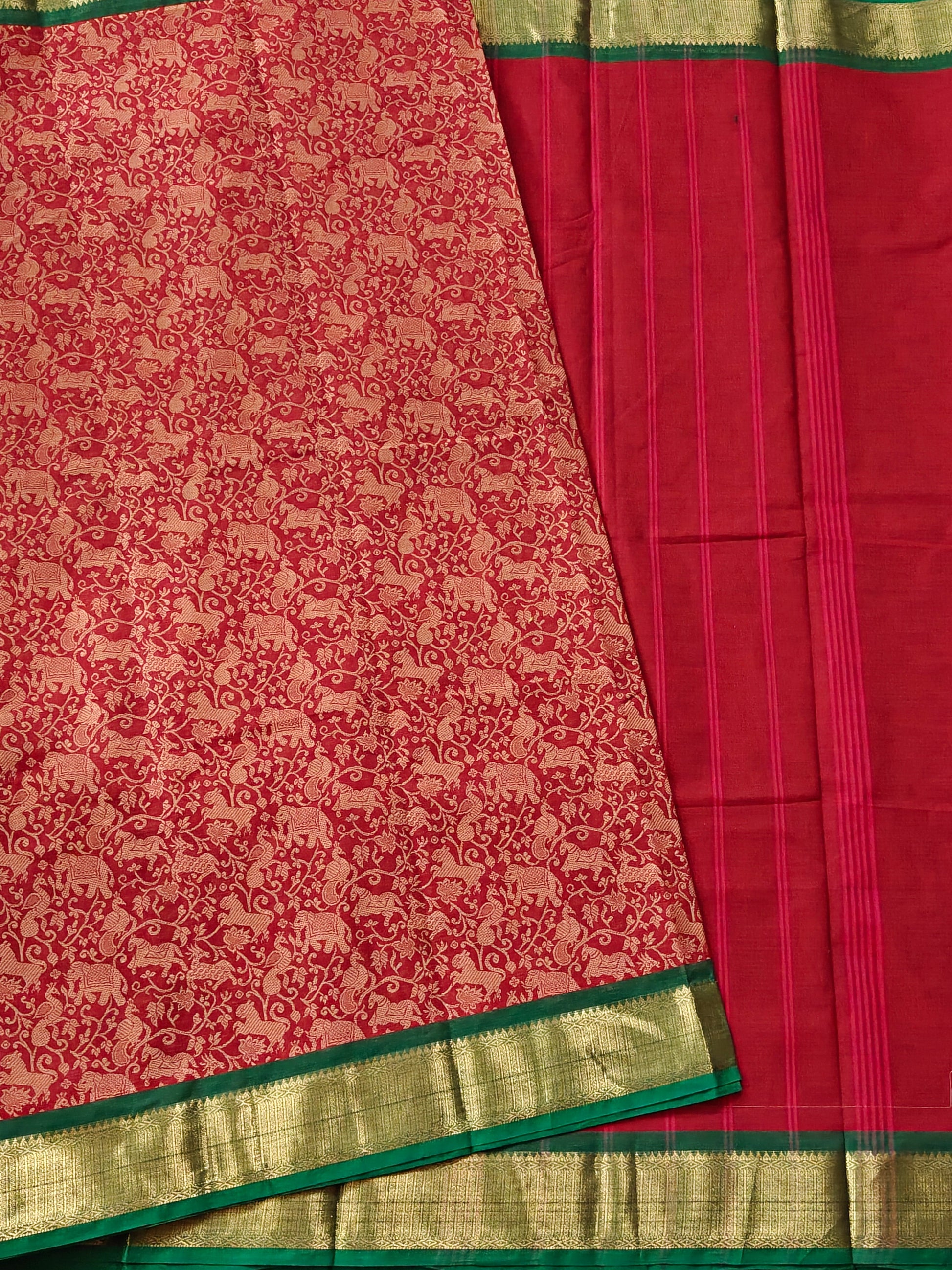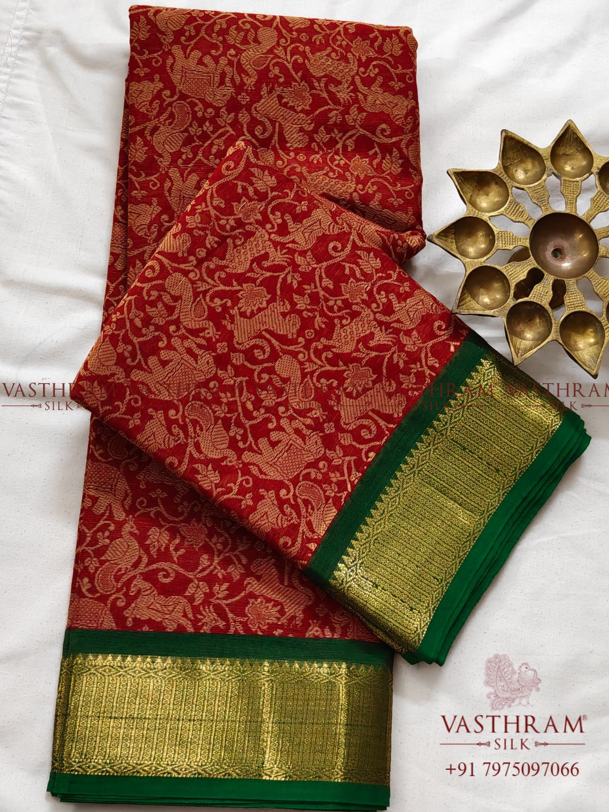 Elevate your ethnic wardrobe with this striking red cotton saree, meticulously crafted with traditional vanasingaram thread woven motifs adorning the entire fabric. The design is beautifully complemented by a contrasting green zari border that adds sophistication and visual depth. The self-colored pallu maintains the saree's cohesive aesthetic, while the included plain blouse offers versatility for styling. Perfect for festive occasions, celebrations, or everyday elegance, this saree combines authentic craftsmanship with timeless appeal.