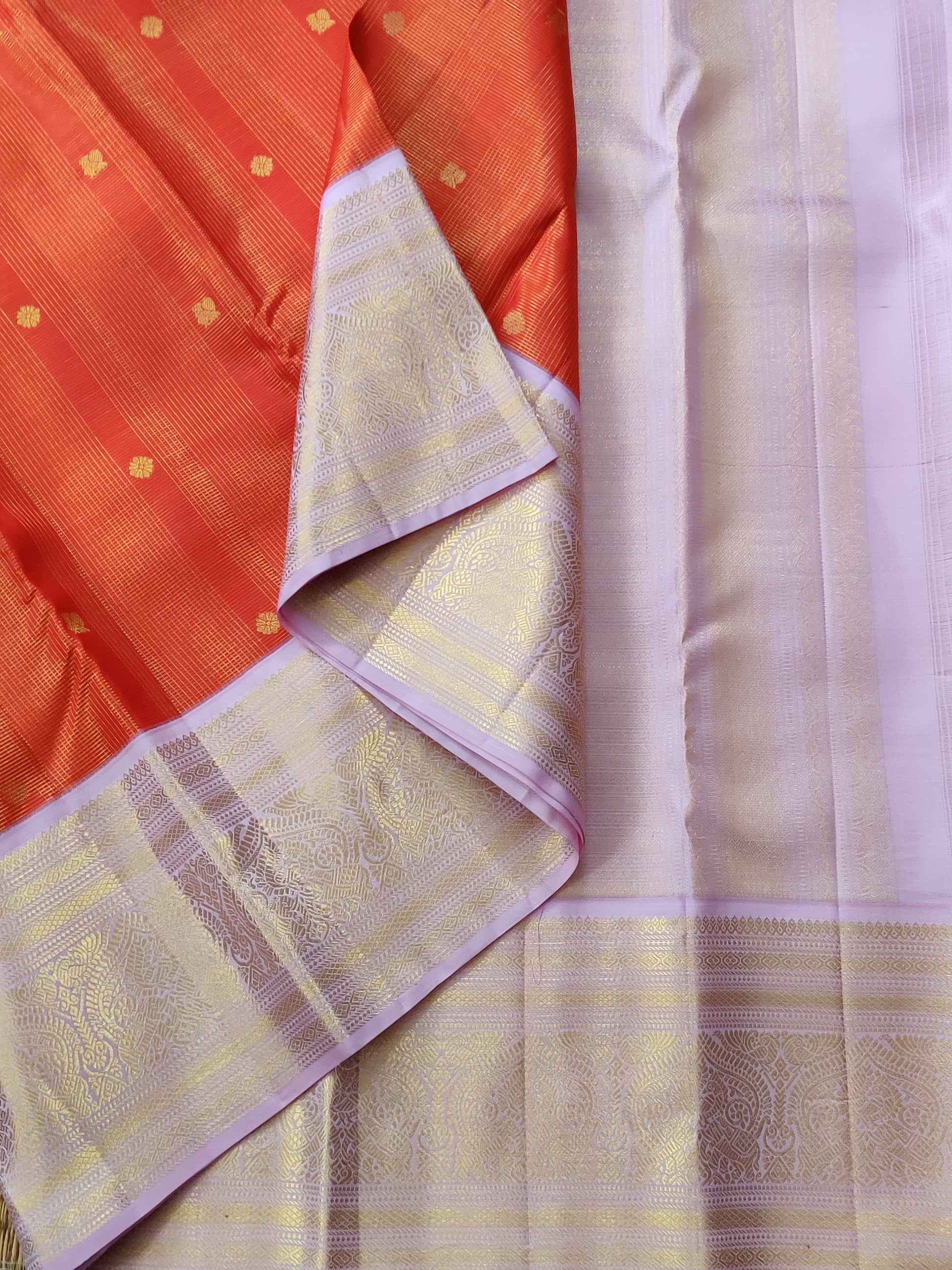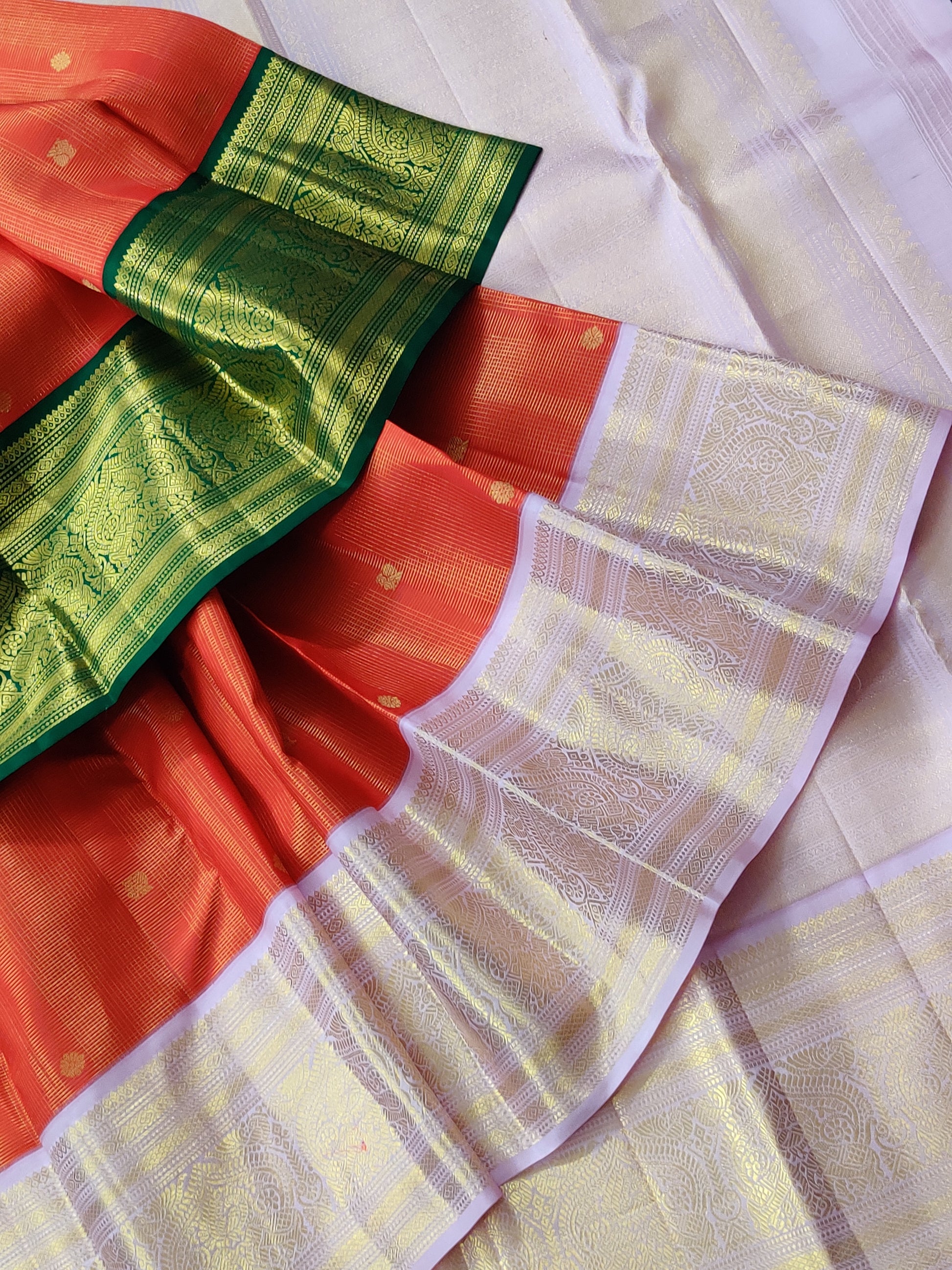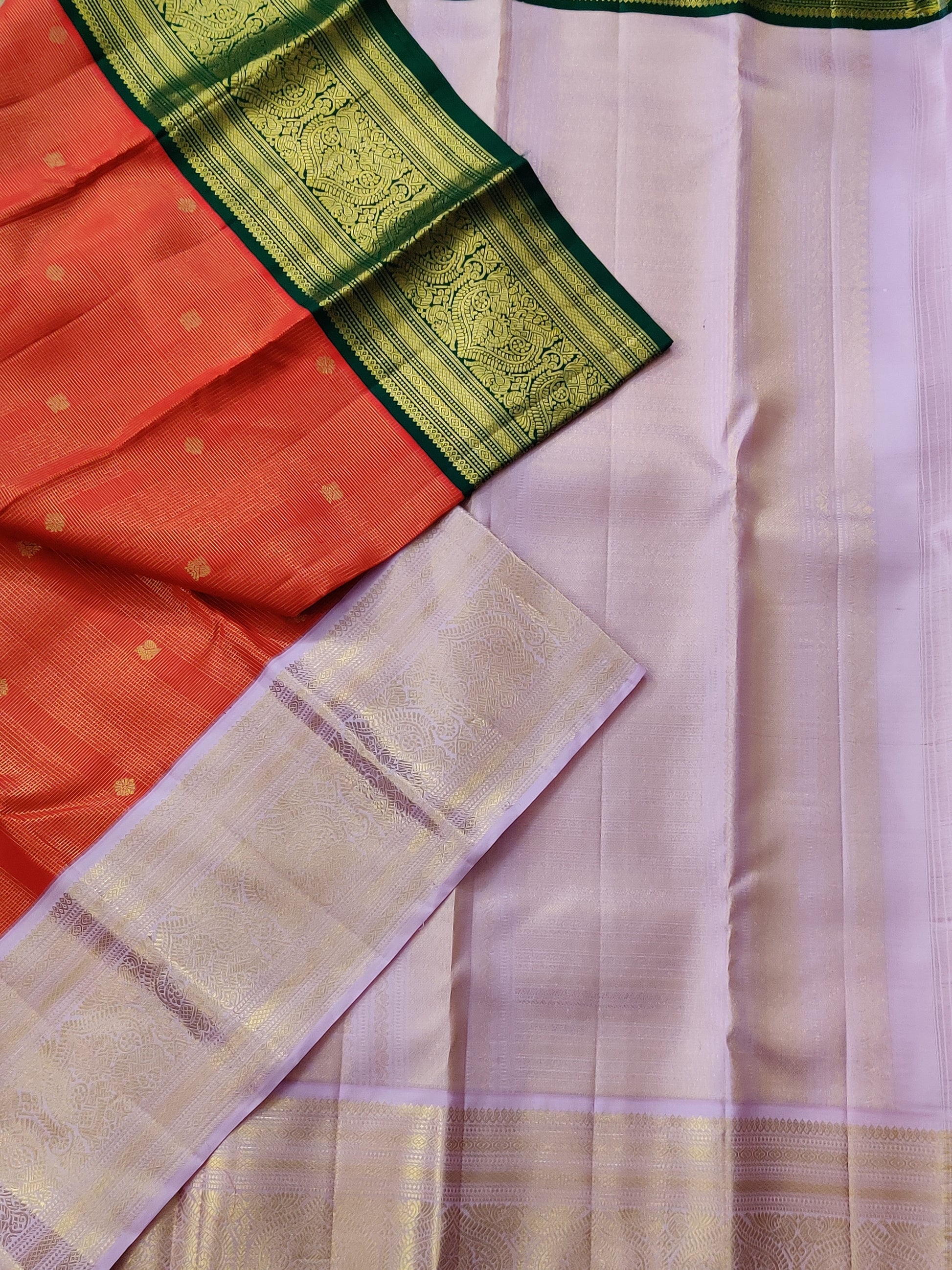 This exquisite red Kanchivaram silk saree features intricate small zari checks and delicate zari buttas spread evenly across its rich fabric. Enhanced with a classic Ganga Jamuna zari border and an elegant zari pallu, it exemplifies traditional craftsmanship. Paired with a plain blouse, this saree offers a refined balance of ornate detail and understated grace, perfect for festive occasions and celebrations.