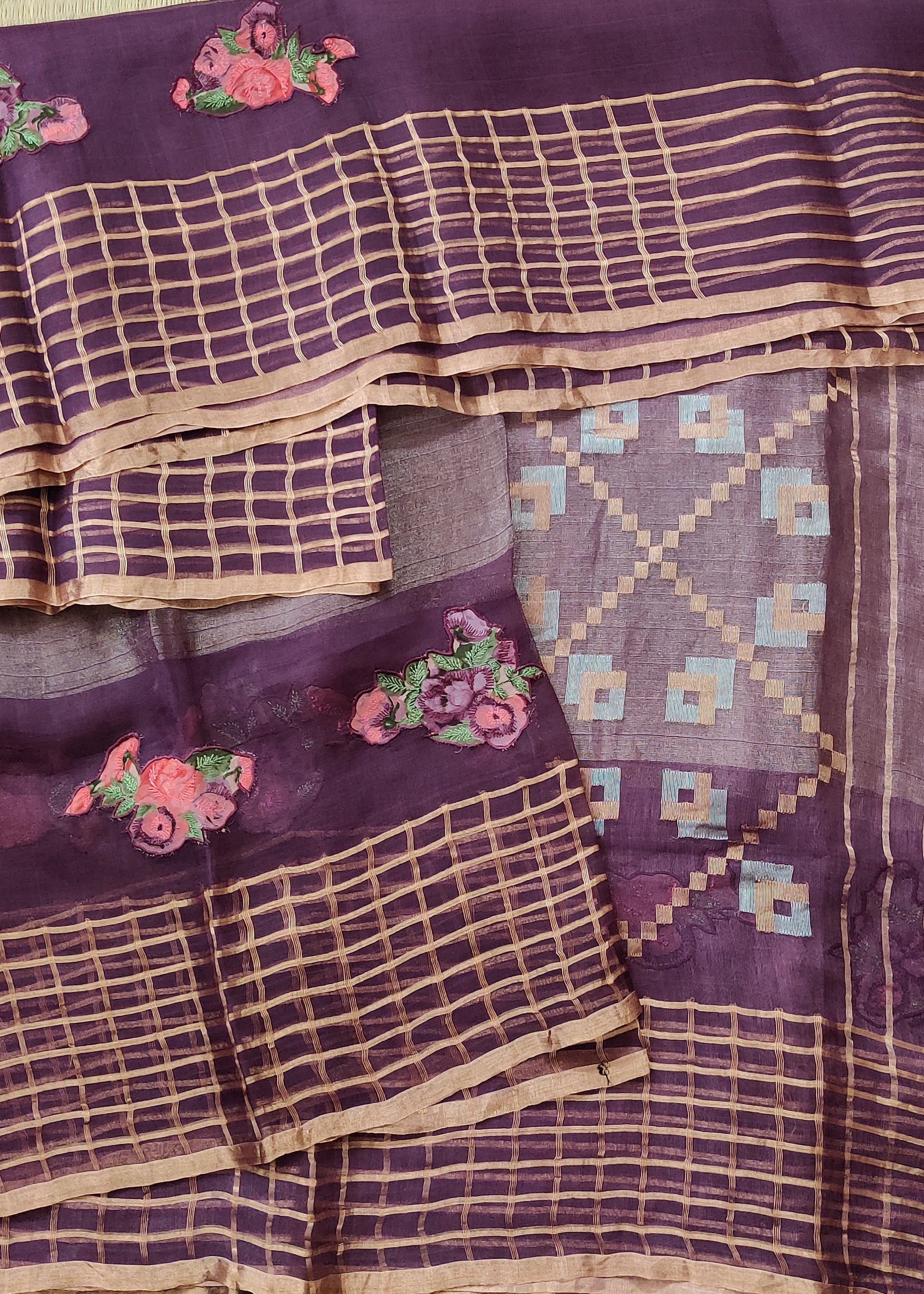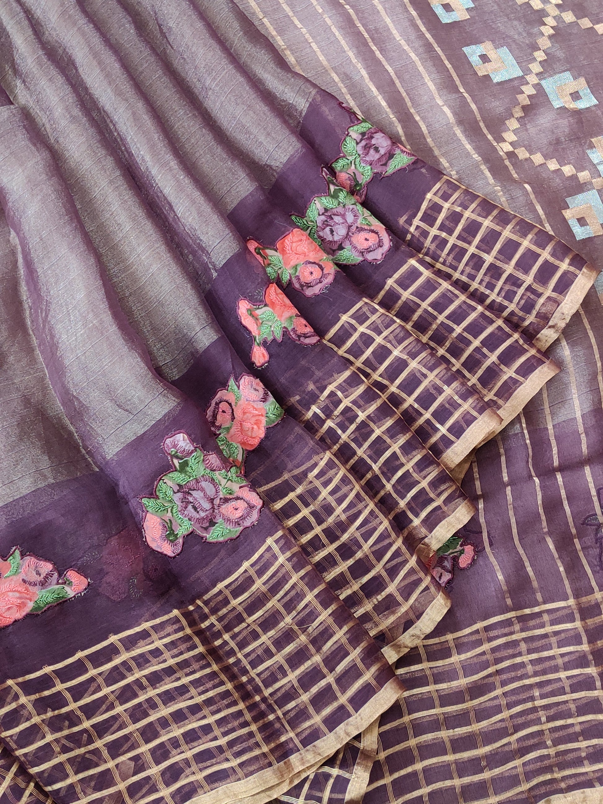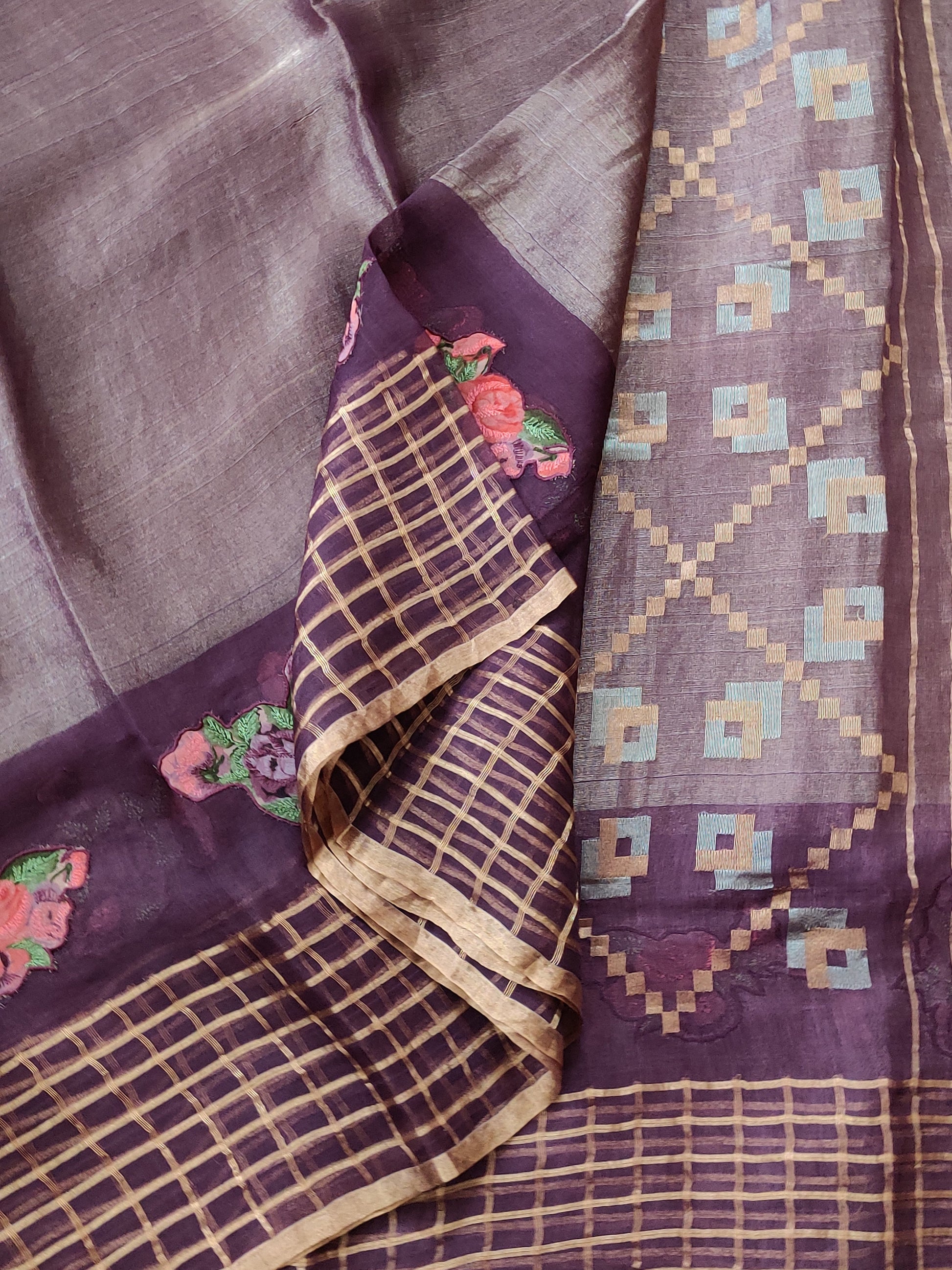 This RESHAM SILK saree features a beautiful brown colour with intricate zari body and elegant jamdani weaving in the pallu and border checks, showcasing tested zari work. The saree comes with a matching noil blouse, offering a classy and timeless look. Perfect for those seeking traditional yet sophisticated style.