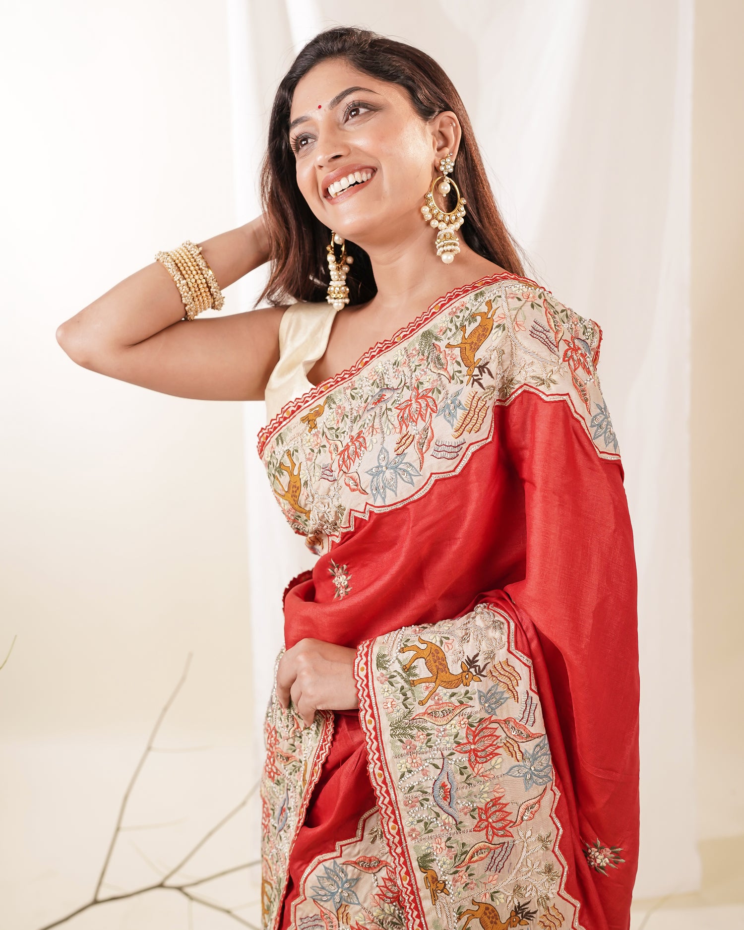 Maroon Colour Semi Banarasi Saree With Zari & Sequin Stripes All Over
